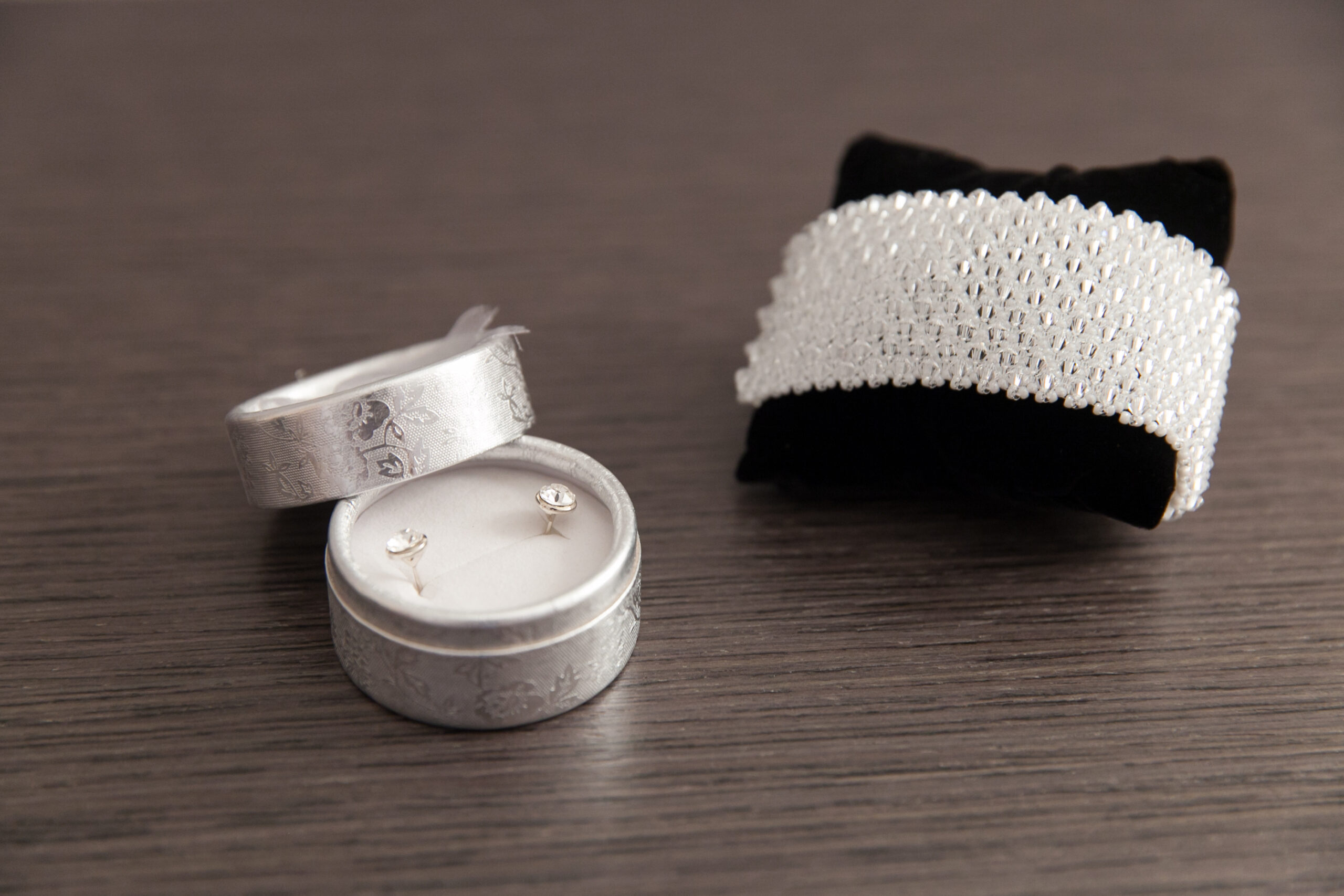 Se decidi di indossare un accessorio per capelli, di solito come orecchini bastano dei punti luce o le classiche perle. La Bottega Liventina offre un’ampia scelta di punti luce in argento 925, argento 925 rosé e argento 925 placcato oro giallo. Se invece non metti nulla tra i capelli, si può pensare a un paio di orecchini più elaborati, che riprendano i materiali o una particolare geometria dell’abito da sposa!