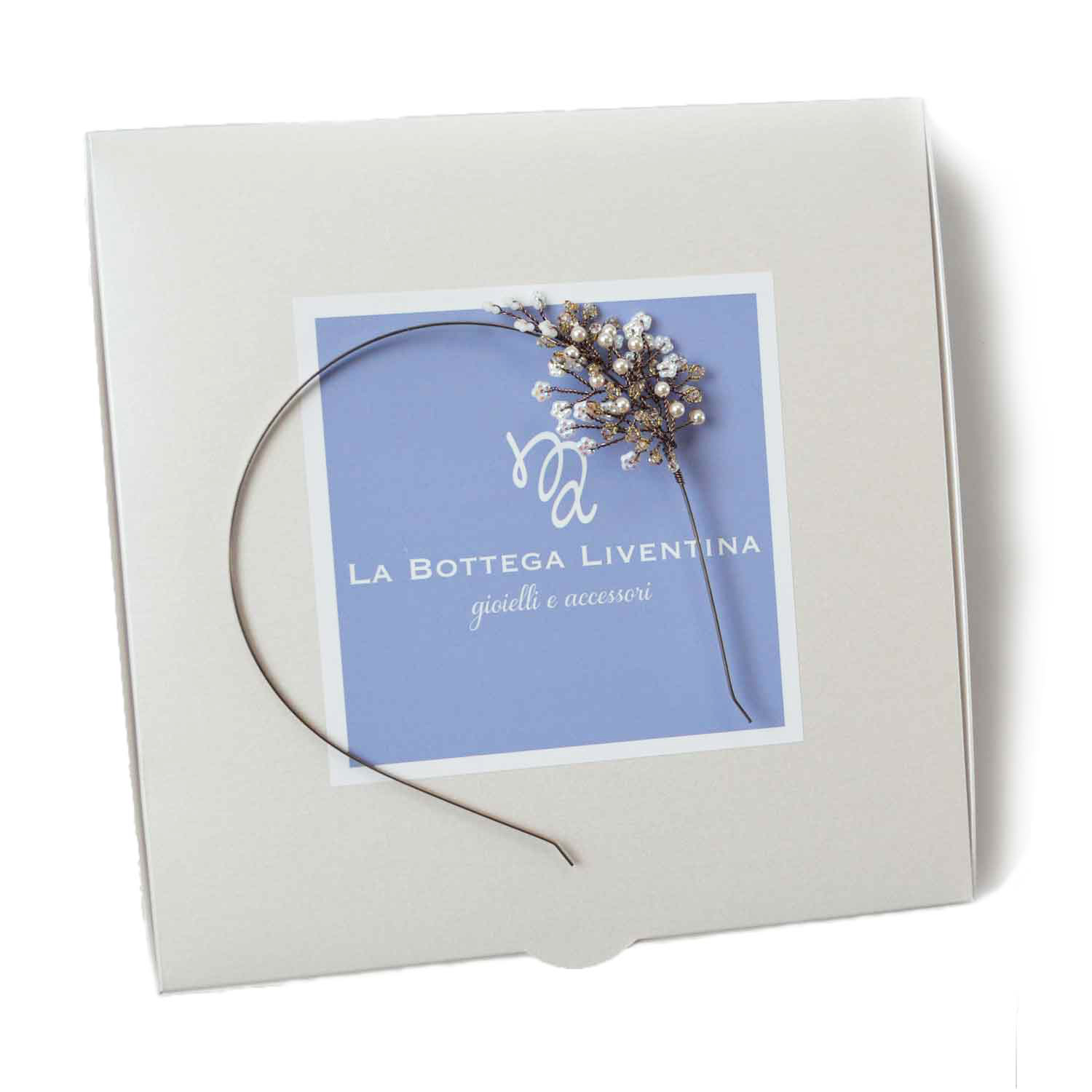 Bronze hairband with iridescent white “forget-me-not” glass flowers, Cream Swarovski pearls, Crystal Golden Shadow Swarovski crystals and 15/0 bronze seed beads. Decoration size about 7×5 cm (2,7×2 inches).