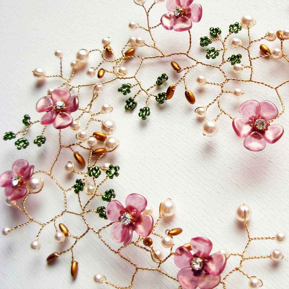 Long bridal hair accessory with embroidered pink rose glass flowers, Creamrose Swarovski pearls and green 11/0 glass beads. It measures approximately 45 x 6 cm (17,7×2,3 inches).