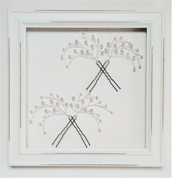 Bridal hairpin in silver metal wire decorated with twigs made of white Swarovski pearls. The decoration size of a single hairpin is about 7x4cm (hairpin excluded). It is possible to choose the “direction” of the twigs, to the right or to the left, to create your own original design based on the chosen hairstyle. Being made with malleable metal wire, the shape of each hair pin can be shaped as desired.