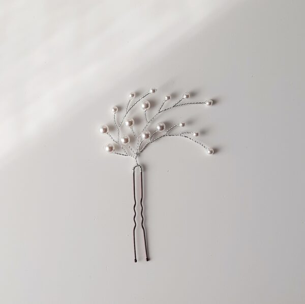 Silver wired hairpin decorated with white Swarovski pearls.
