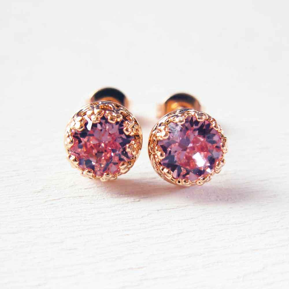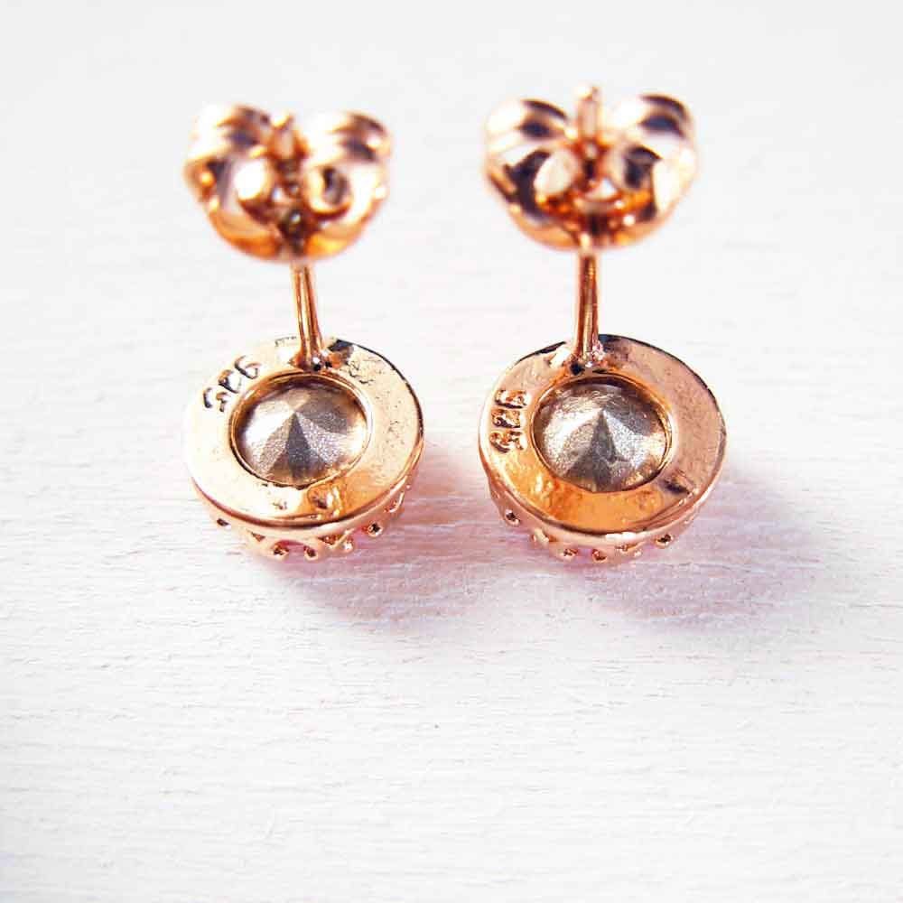Rose gold-plated sterling silver stud earrings with Crystal Swarovski chatons. The earring has a diameter of 6 mm. They are intended as complete with 5 mm rose gold-plated sterling silver ear clutches.