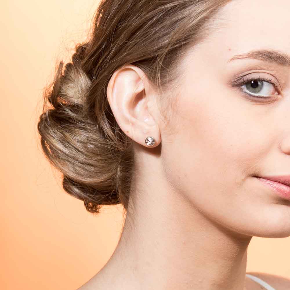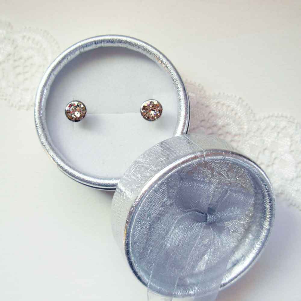 Sterling silver stud earrings with 6 mm Light Silk (ivory) Swarovski chaton. The earring has a diameter of 8 mm. They are intended as complete with 5 mm sterling silver ear clutches.