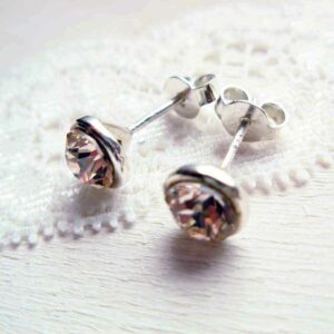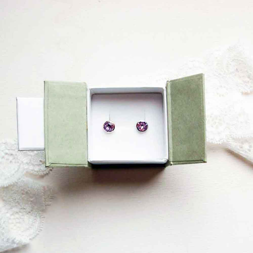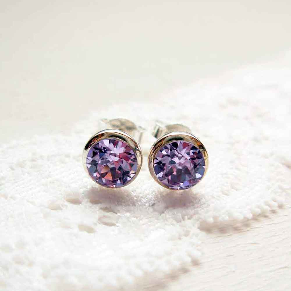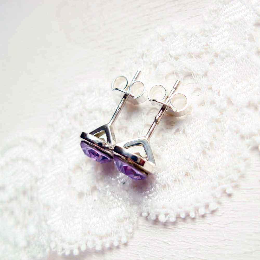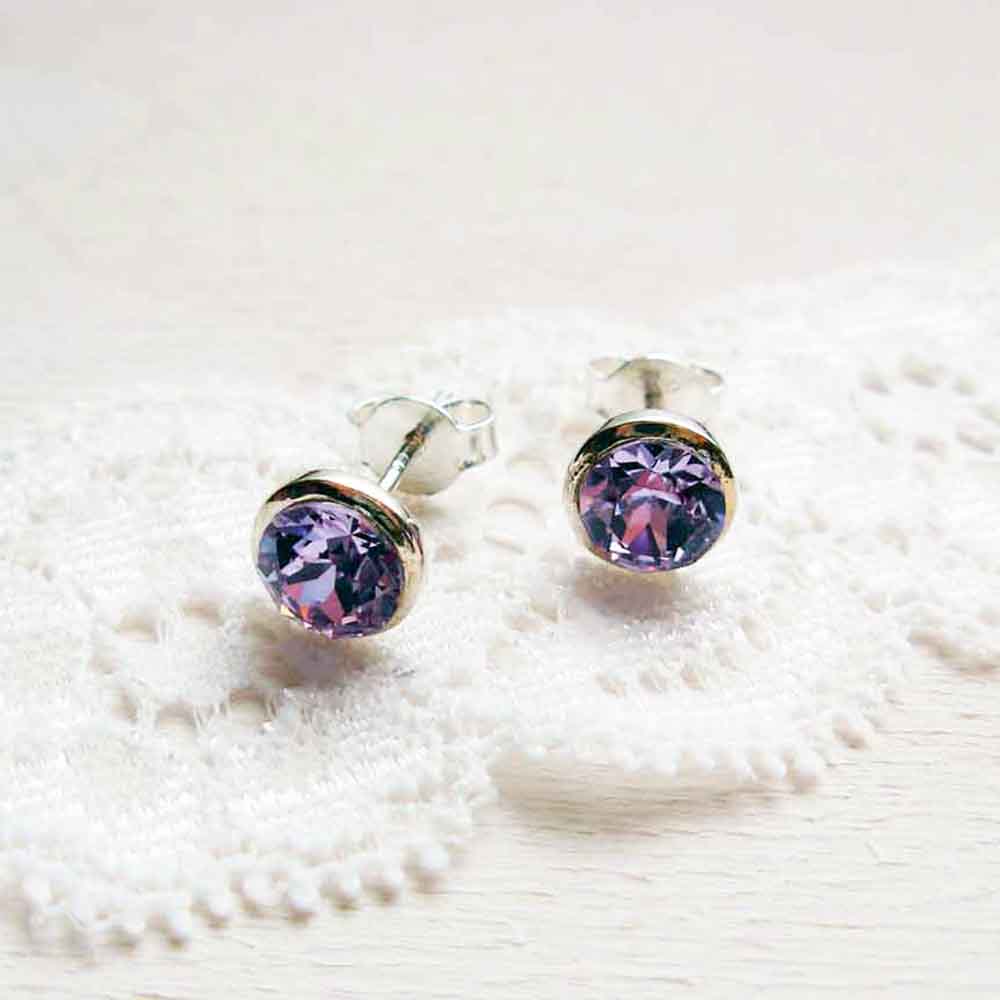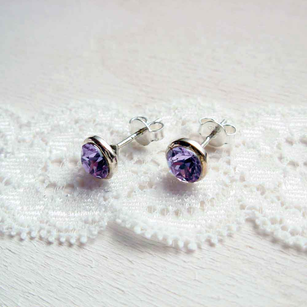 Sterling silver stud earrings with 6 mm Violet Swarovski chaton. The earring has a diameter of 8 mm. They are intended as complete with 5 mm sterling silver ear clutches.