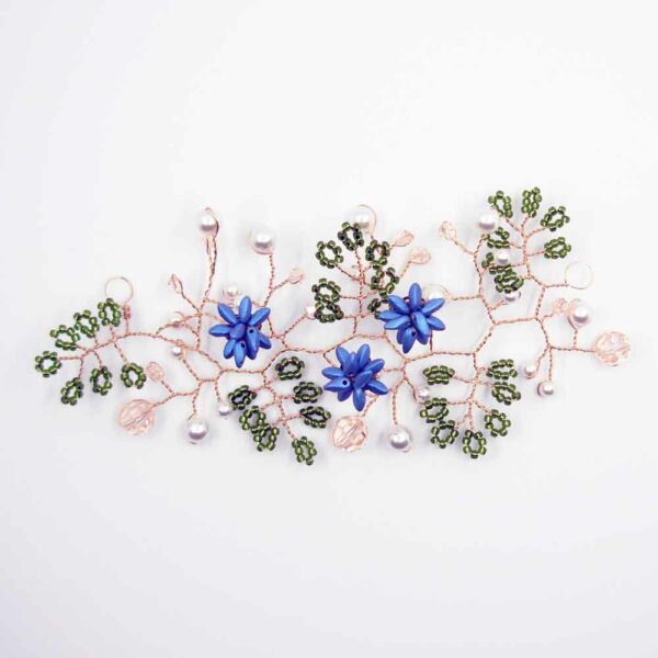 Bridal hair accessory with blue hand-embroidered glass flowers, Silk Swarovski crystals, White Swarovski pearls and 15/0 green Japanese glass seed beads. Measures: about 15×6 cm (5,9×2,3 inches).