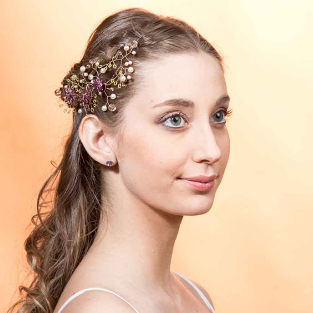 Bridal hair accessory with purple hand-embroidered glass flowers, Silk Swarovski crystals, Creamrose Swarovski pearls and 15/0 green Japanese glass seed beads. Measures: about 15×6 cm (5,9×2,3 inches).