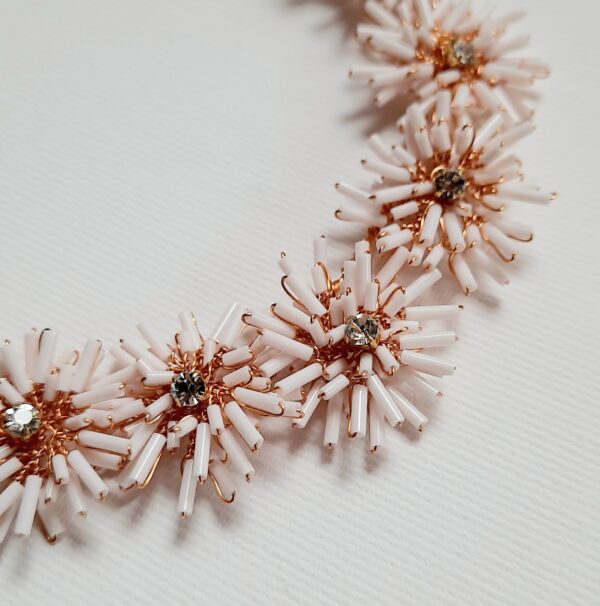 Accessorio per capelli margherite da sposa bianco e oro con bugles giapponesi in vetro e strass. Ogni singola margherita ha un diametro di circa 3 cm ed è formata da un doppio strato di petali intrecciati a mano. Il tralcio per capelli è formato da sette margherite di uguale grandezza, è modellabile a piacere e ha una lunghezza totale di circa 16-17 cm.