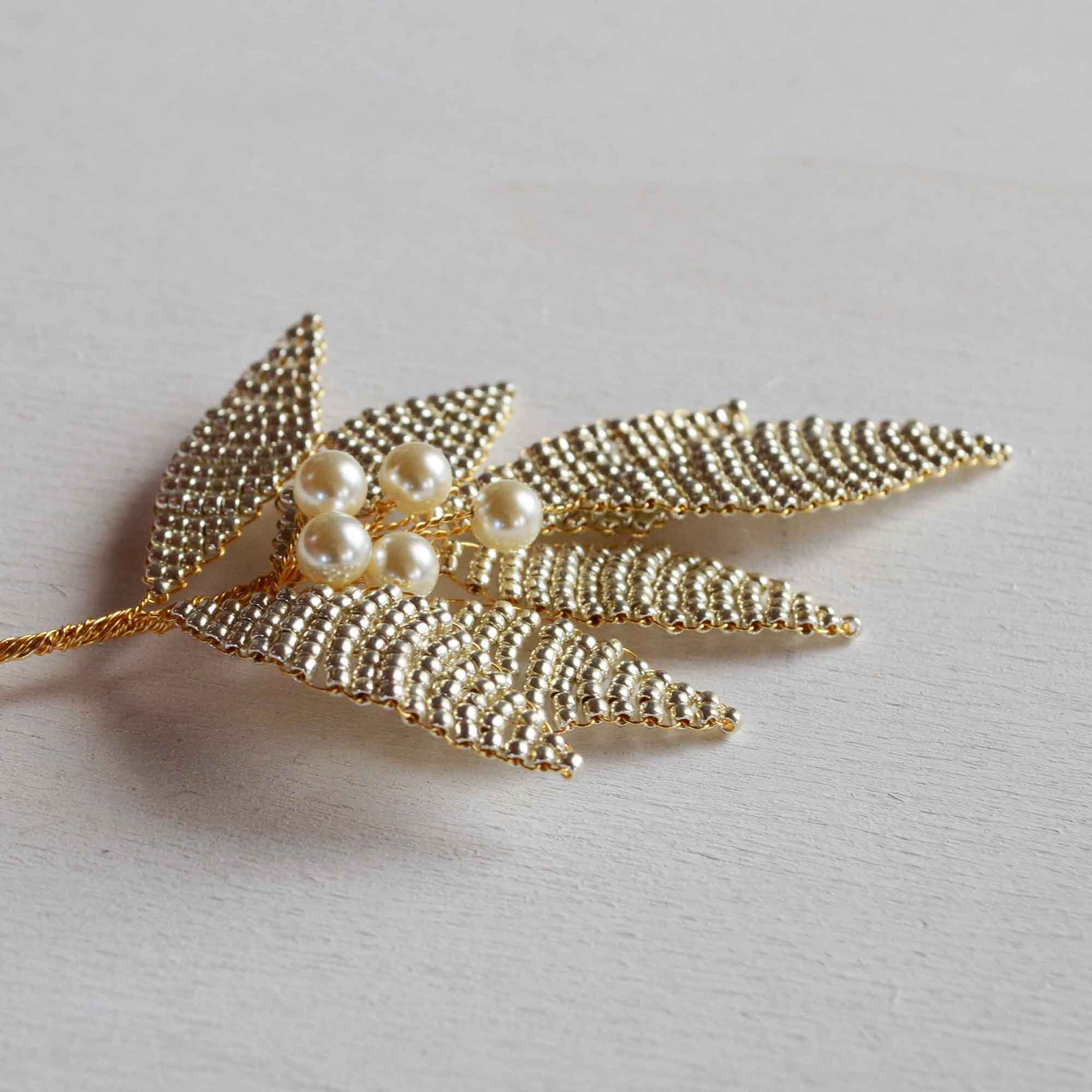Tralcio nuziale per capelli a forma di foglie d’ulivo. Le foglie sono realizzate intrecciando rocailles giapponesi color alluminio su filo dorato e perle Swarovski Cream da 6 mm. Altezza decoro 8 cm, larghezza 7 cm circa.