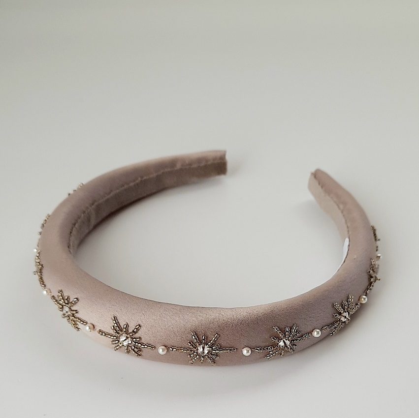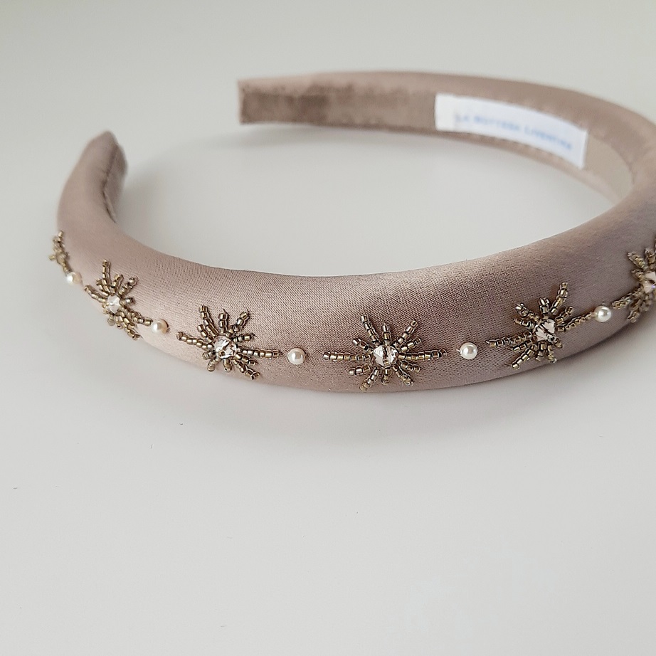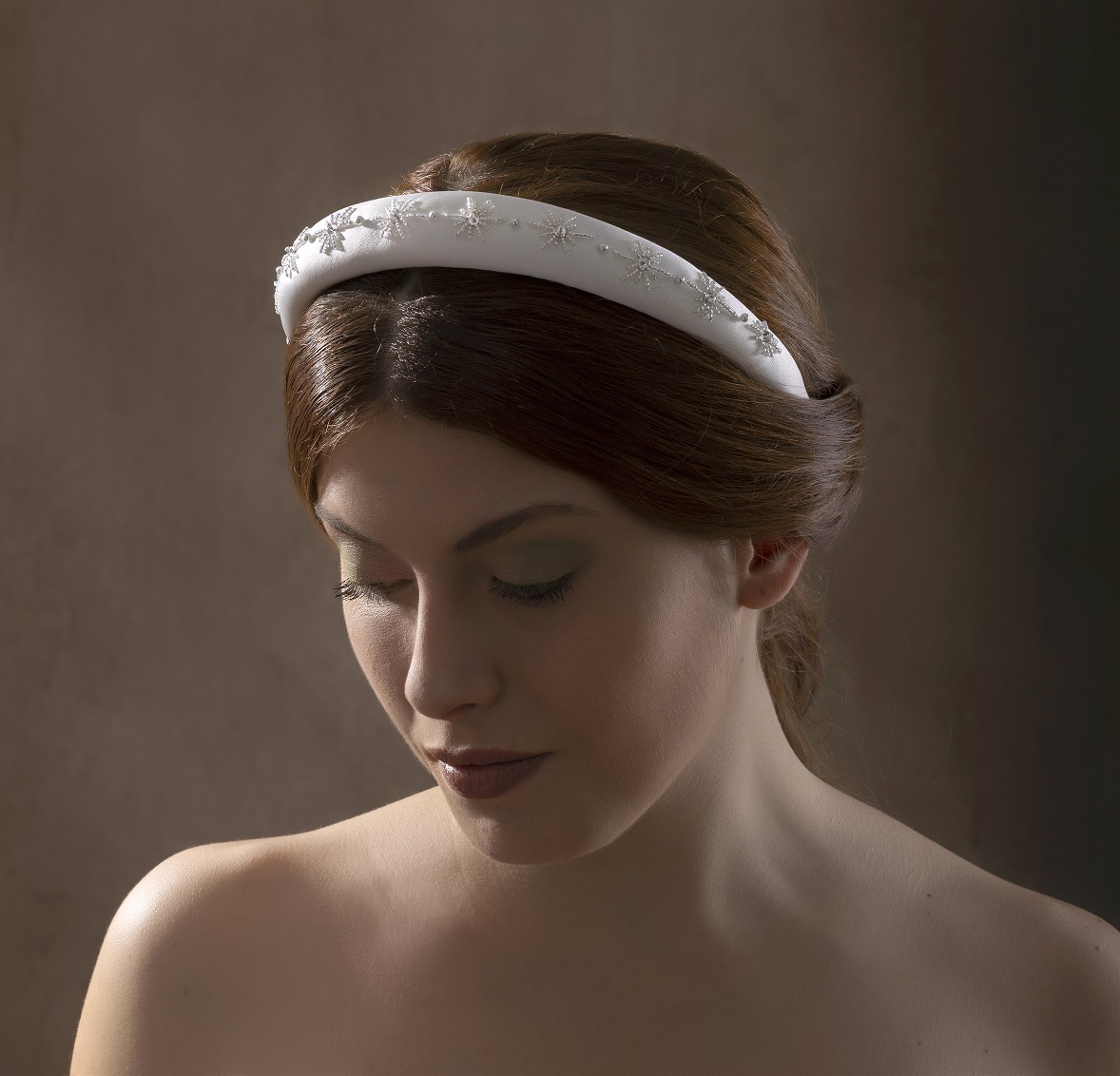 Cerchietto molto elegante e glamour rivestito in duchesse satin bianco, ricamato con stelle di cristalli Swarovski Crystal, perle Swarovski Moonlight Pearl e perline giapponesi 15/0 White Opal Silver Lined (bianco opalescente). Larghezza massima 3 cm circa, altezza circa 1,5 cm (nel punto più alto, in centro). L’interno è rivestito con nastro in velluto ton sur ton per un comfort ottimale. Interamente cucito e ricamato a mano in Italia.