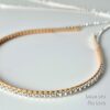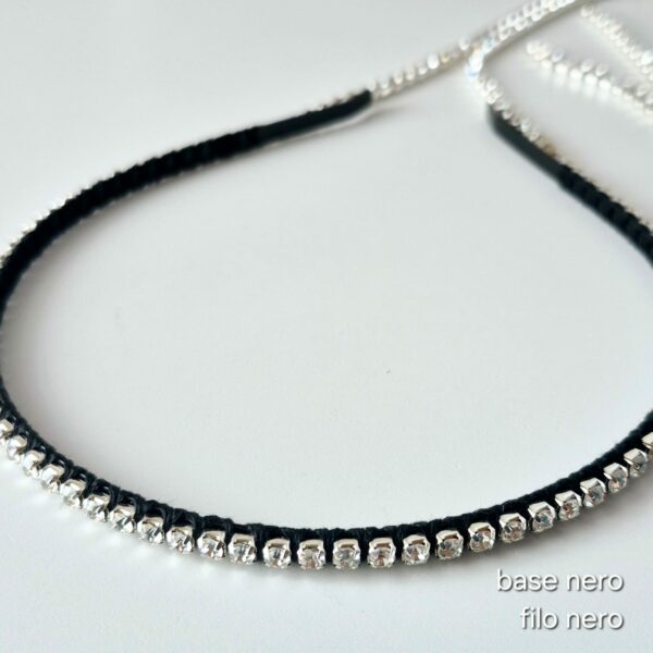 Cerchietto sottile con applicazione di un’unica lunga catena con strass. La catena è applicata al cerchietto tramite un intreccio di fili di cotone dal colore personalizzabile. Le due “code” laterali della catena si congiungono e vengono fissate sul retro. Il cerchietto in metallo è molto sottile, è alto 5 mm. La catena strass è lunga in totale 100 cm, ha una base in metallo argento e gli strass color Crystal (trasparente) misurano 4 mm. Interamente cucito a mano in Italia.