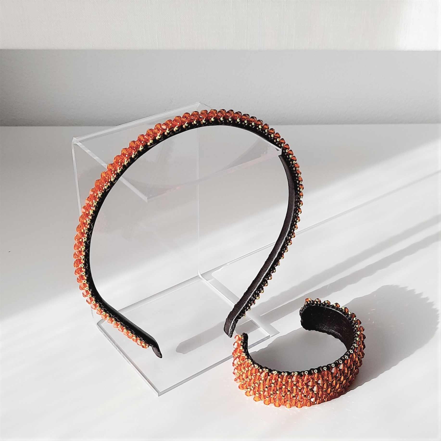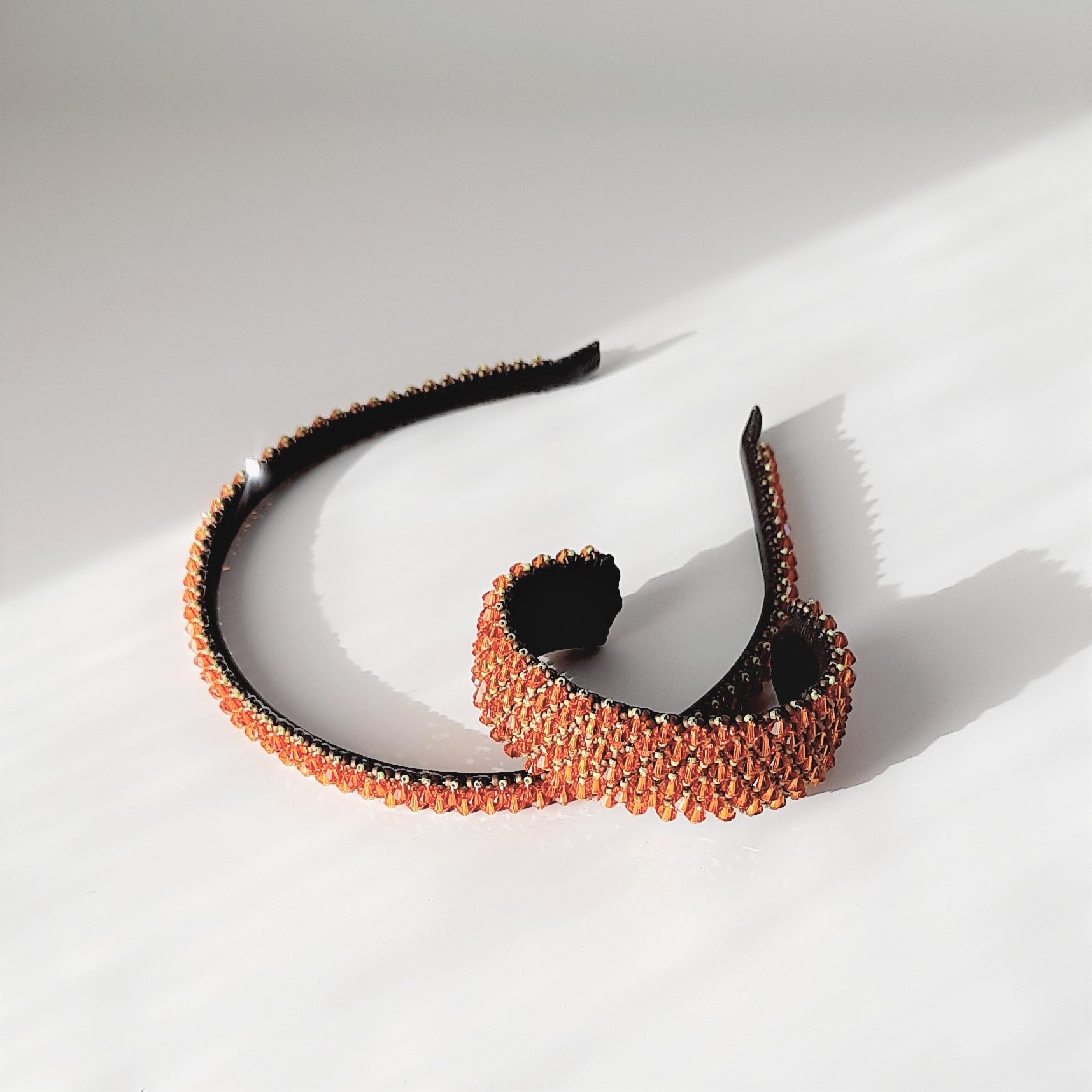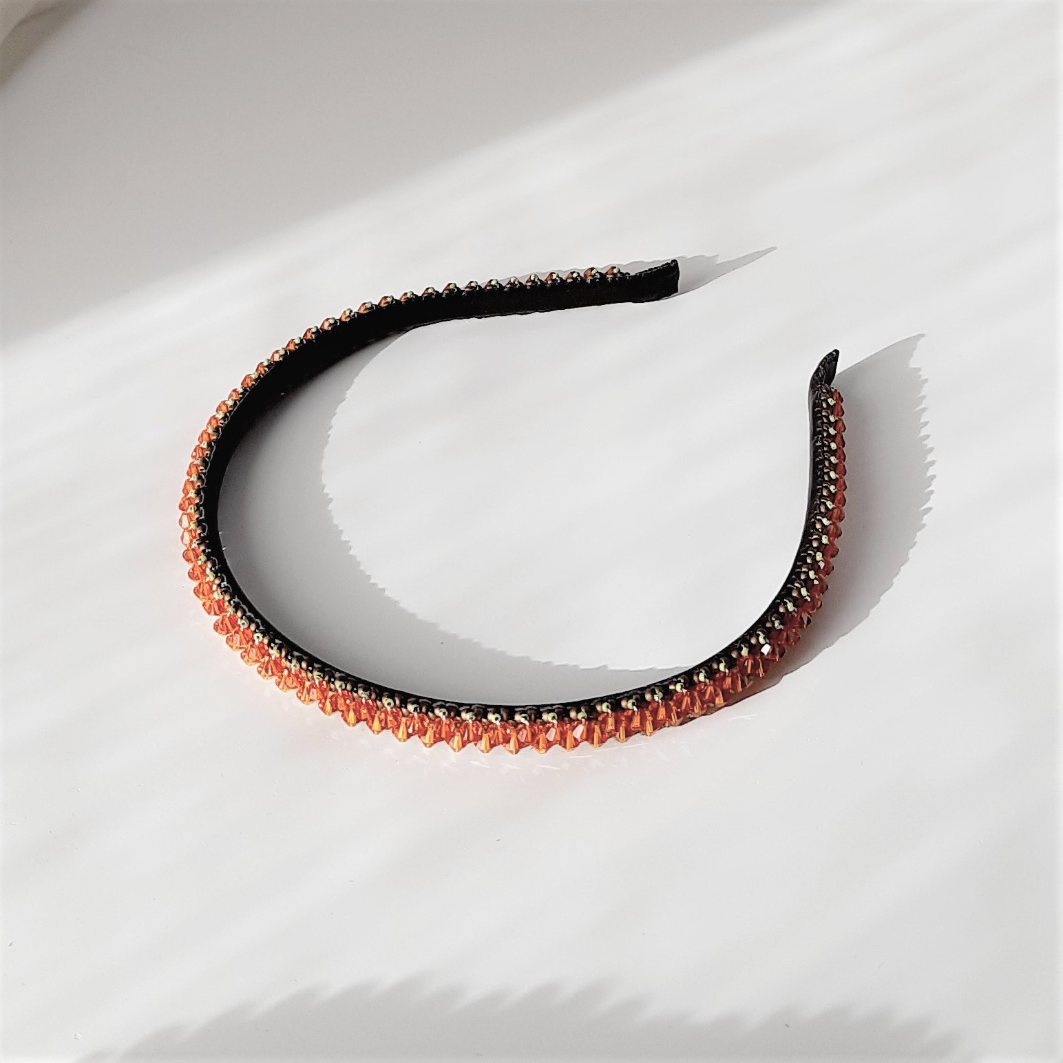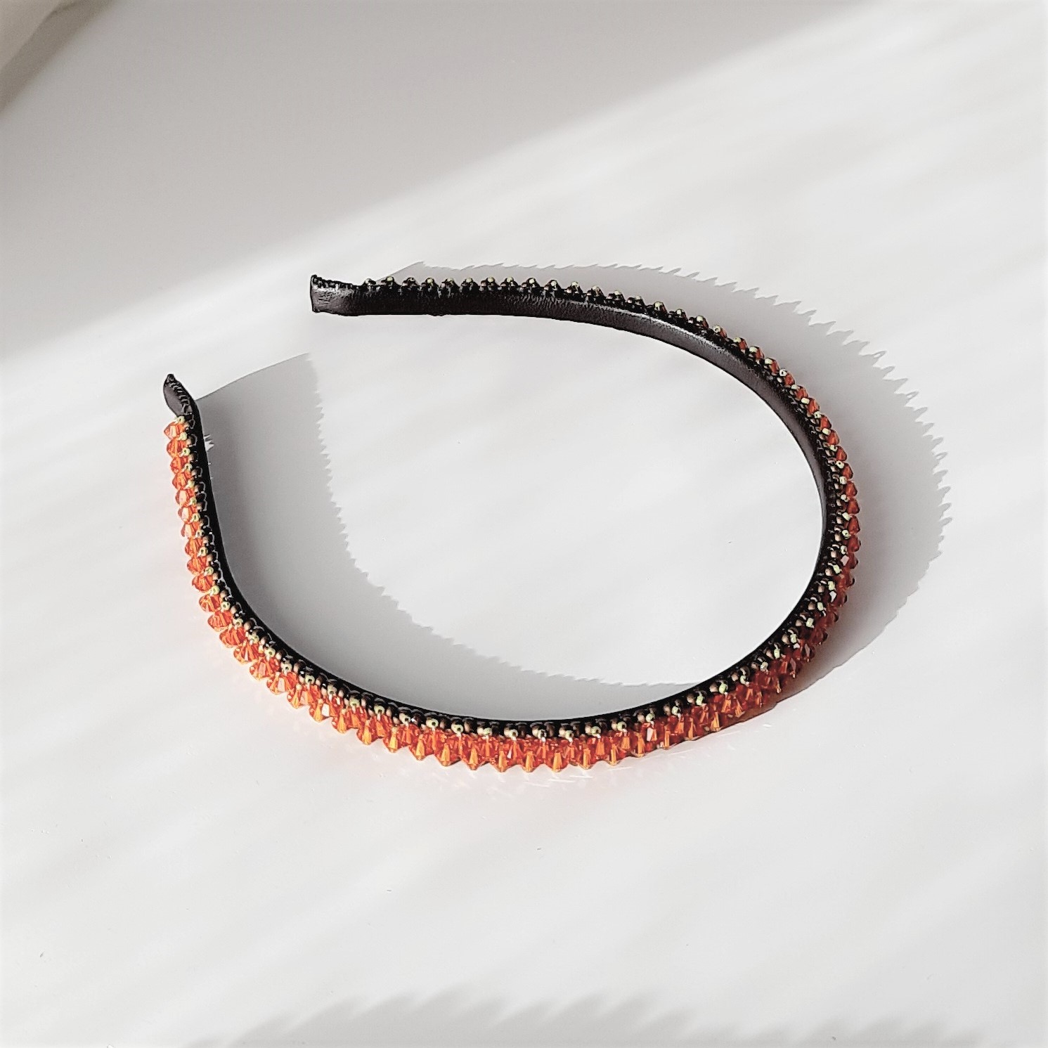 Cerchietto sottile in bronzo ricamato con rocailles 11/0 e 15/0 giapponesi e 148 cristalli Swarovski da 4 mm color Tangerine (arancione mandarino). Rivestimento interno in morbida nappa color testa di moro. Il cerchietto è largo circa 1 cm.