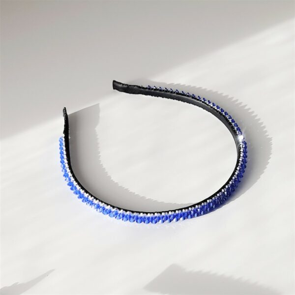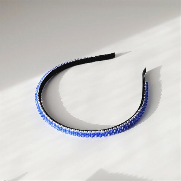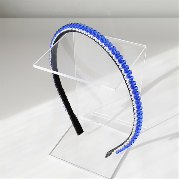 Cerchietto sottile in bronzo ricamato con rocailles 11/0 e 15/0 giapponesi bianco e lilla, e 148 cristalli Swarovski da 4 mm color Sapphire (blu zaffiro). Rivestimento interno in morbida nappa nera. Il cerchietto è largo circa 1 cm.