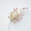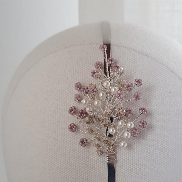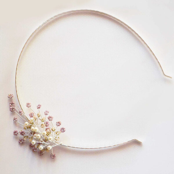 Cerchietto da sposa sottile nei toni del rosa e dell’argento. La decorazione laterale è realizzata con fiori in vetro “non ti scordar di me” rosa antico, perle Swarovski Cream (crema), cristalli Swarovski Crystal Golden Shadow (dorati) e rocailles 15/0 bronzo. Dimensione decoro laterale circa 7×5 cm.