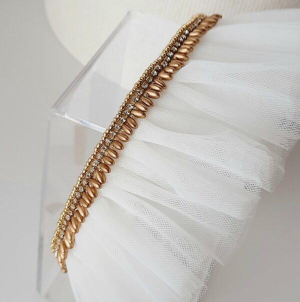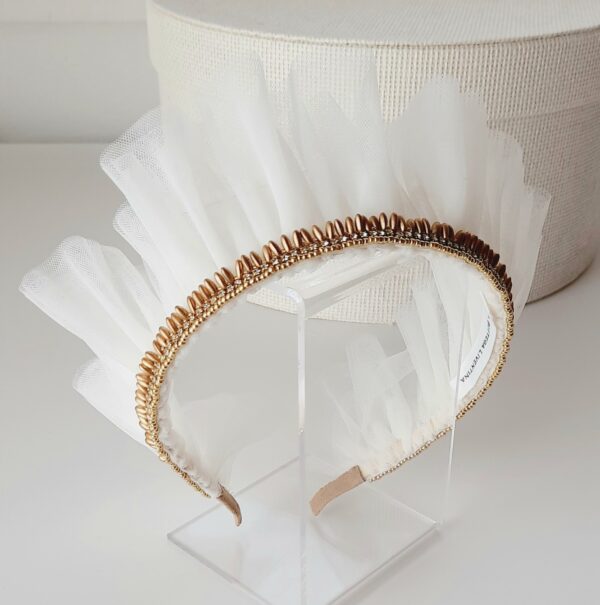 Il cerchietto con corona di tulle è in metallo sottile, ricamato a mano con cristalli Crystal e perline in vetro oro e bronzo. Il ricamo è incorniciato da una delicata corona di tulle mano seta color crema. Altezza decorazione (tulle + ricamo) 6,5 cm.