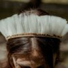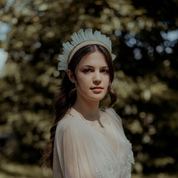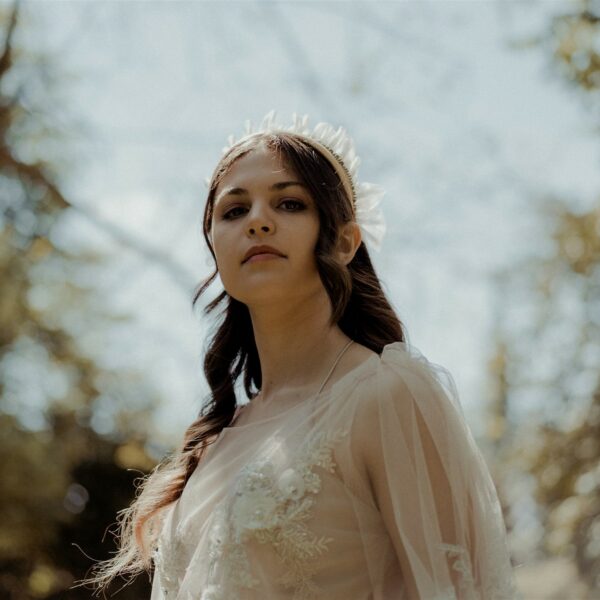 Questo cerchietto-gioiello con corona di tulle, al contempo maestoso ed etereo, si abbina perfettamente ad un look boho chic nei toni caldi dell’avorio, del crema o nude. E’ perfetto per impreziosire una acconciatura sciolta e semplice, ed è adatto anche a una sposa dai capelli corti.