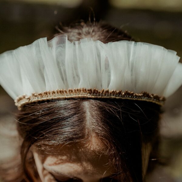 Cerchietto sottile ricamato a mano con corona di tulle arricciato.
