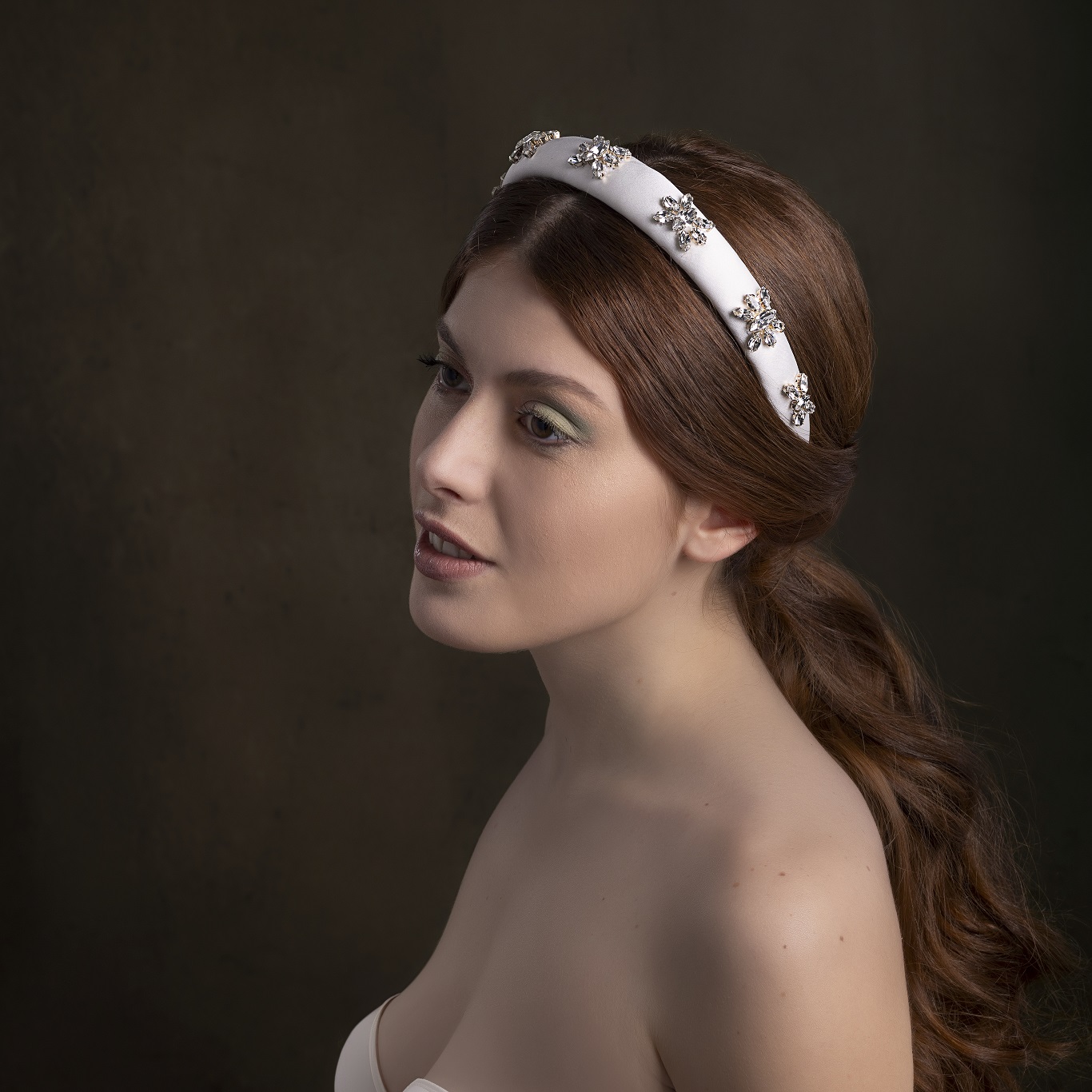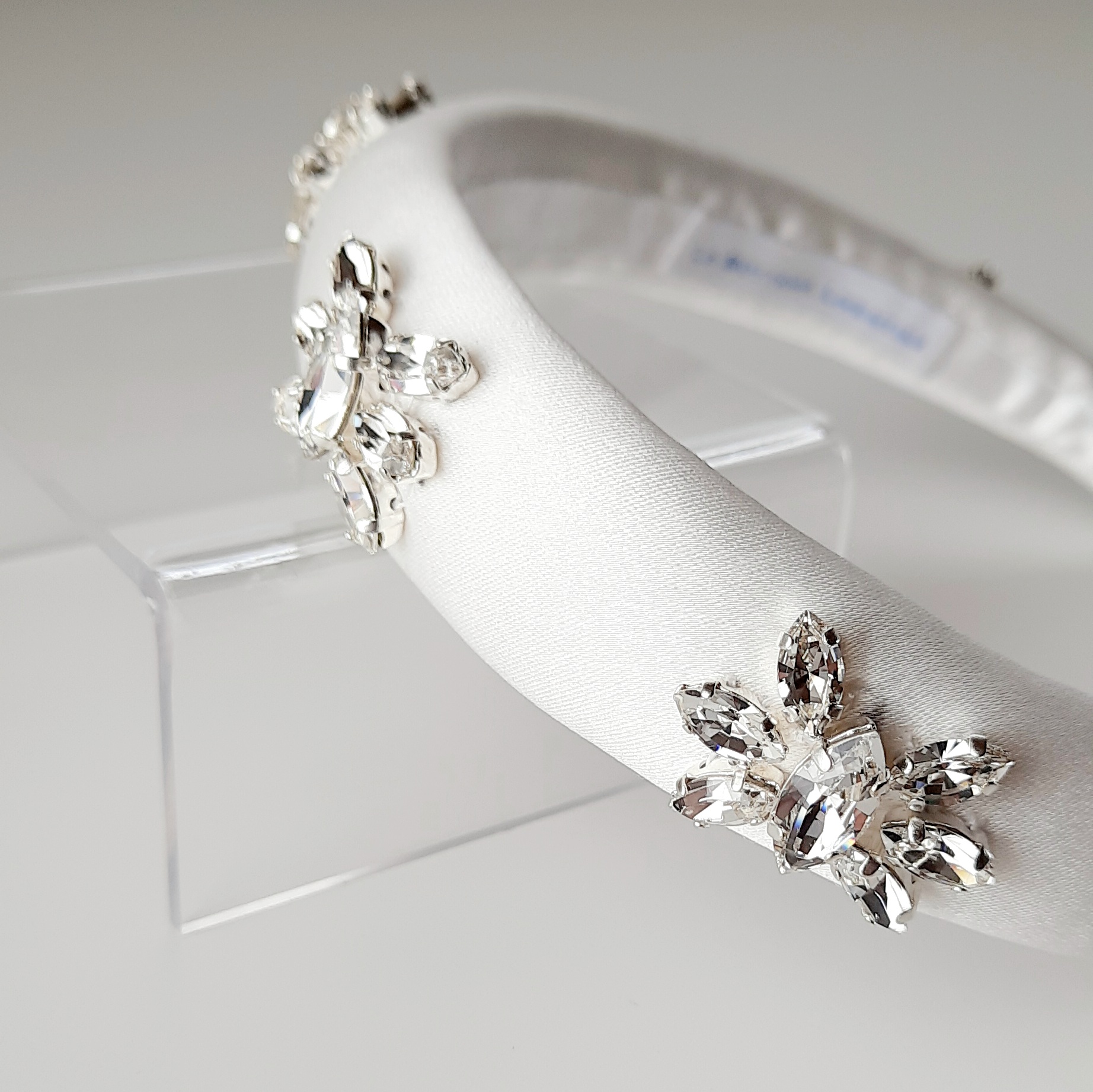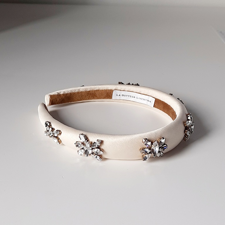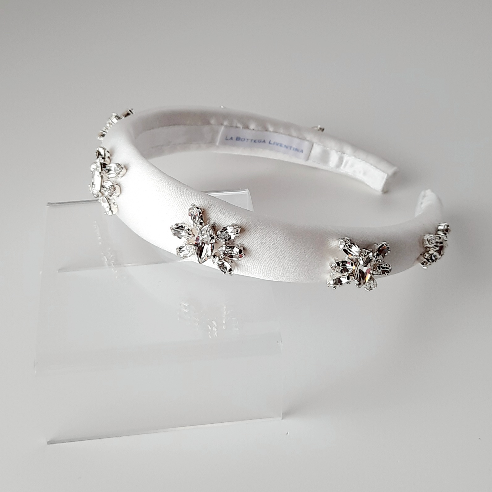 Cerchietto da sposa glamour rivestito in duchesse satin bianco, ricamato con cristalli navette Swarovski incastonati di diverse dimensioni. Larghezza 3 cm circa; altezza circa 1,5 cm (nel punto più alto, in centro). L’interno è rivestito con nastro gros grain per un comfort ottimale. Interamente cucito e ricamato a mano in Italia.