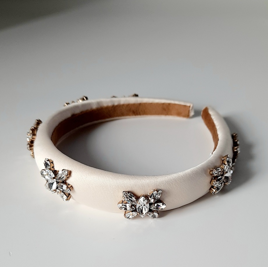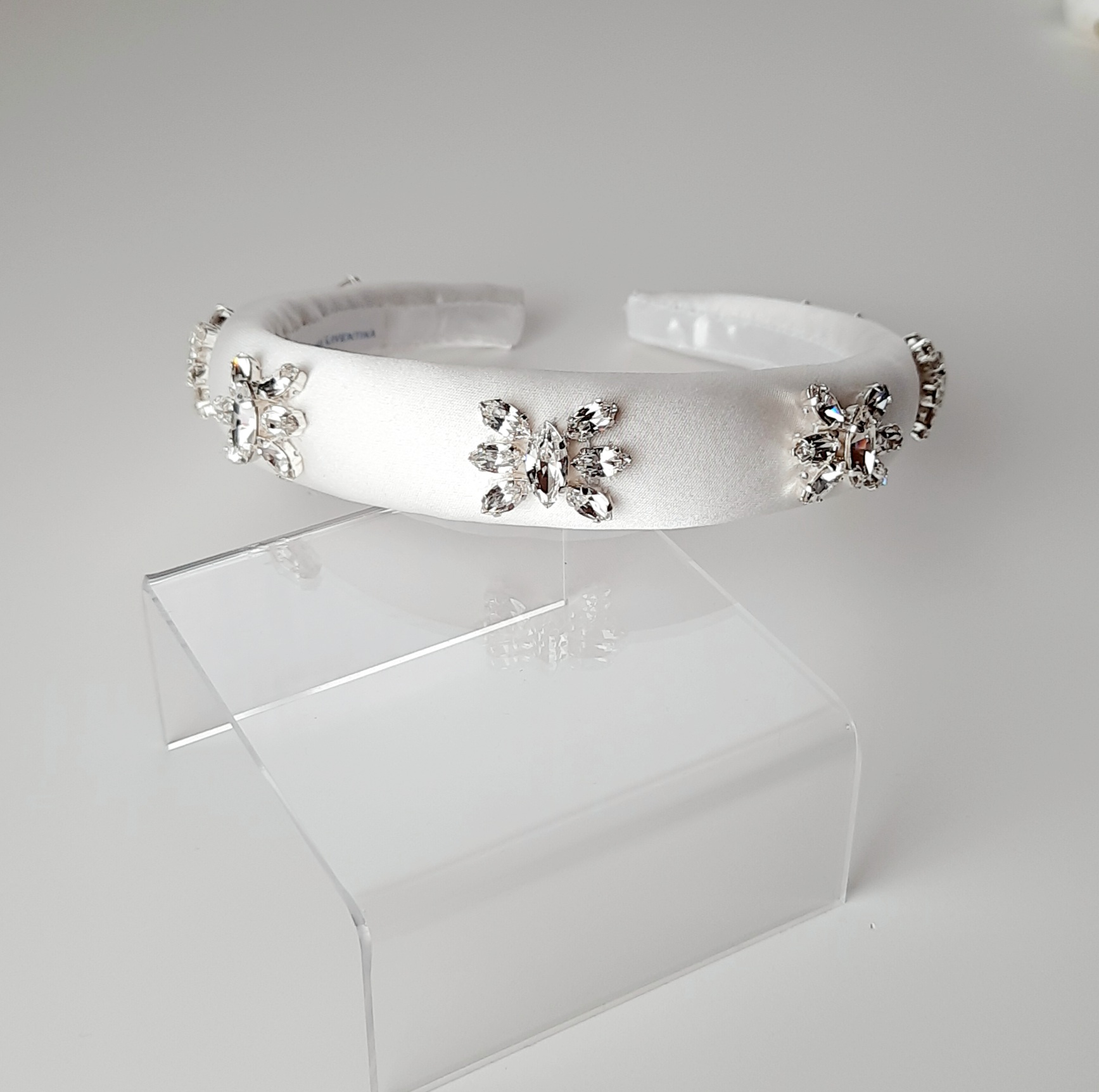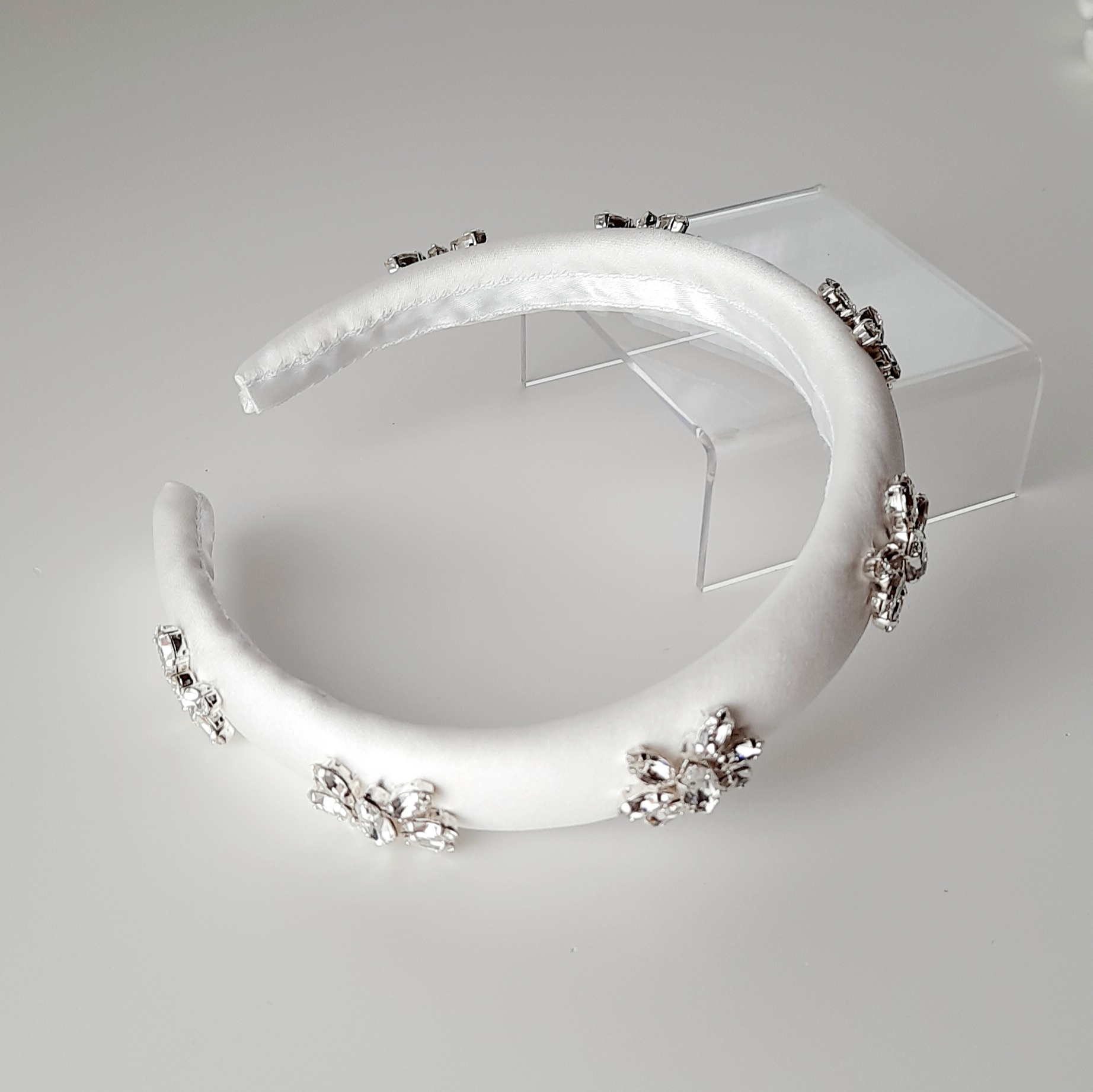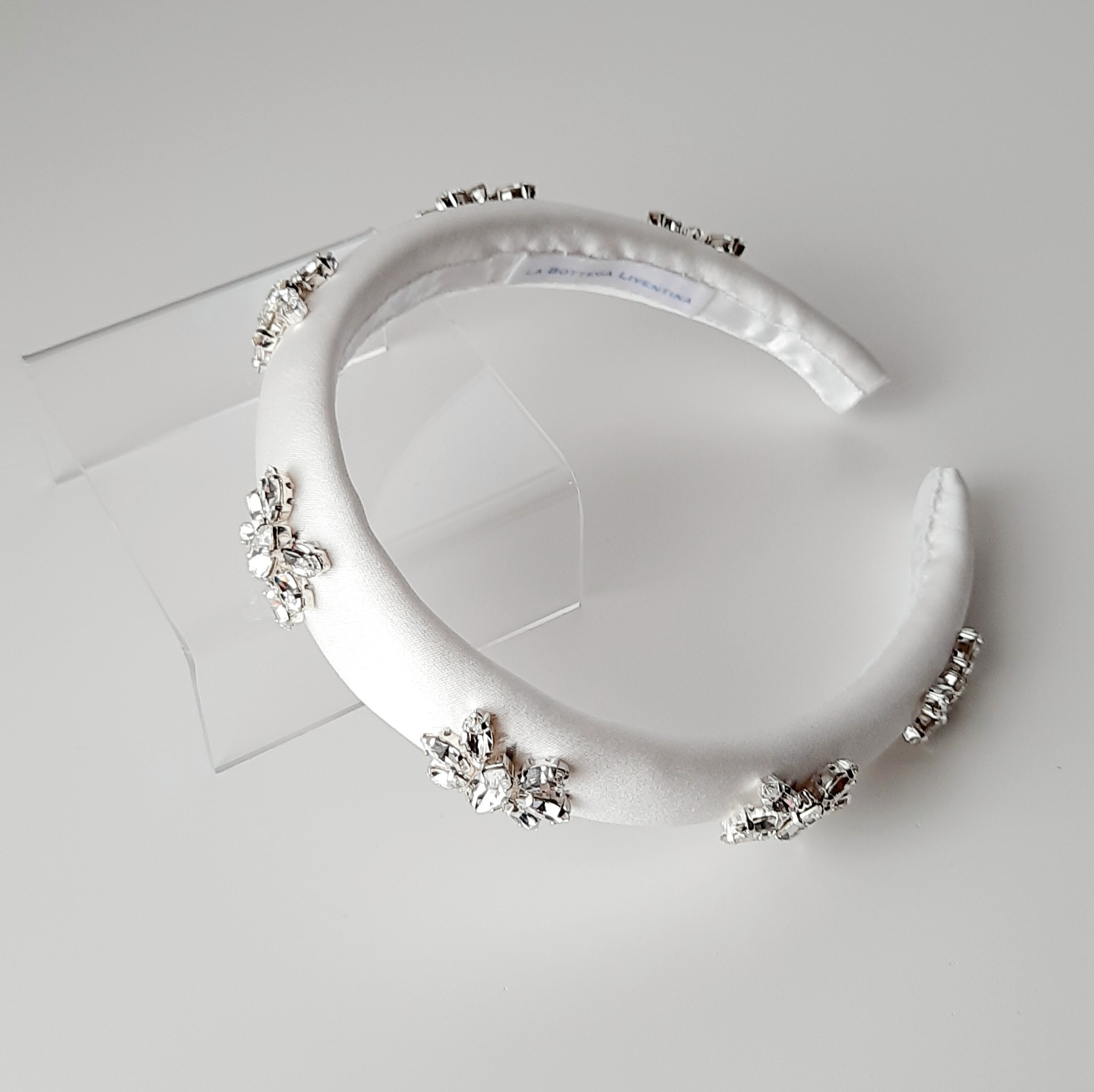 Cerchietto da sposa glamour rivestito in duchesse satin bianco, ricamato con cristalli navette Swarovski incastonati di diverse dimensioni. Larghezza 3 cm circa; altezza circa 1,5 cm (nel punto più alto, in centro). L’interno è rivestito con nastro gros grain per un comfort ottimale. Interamente cucito e ricamato a mano in Italia.