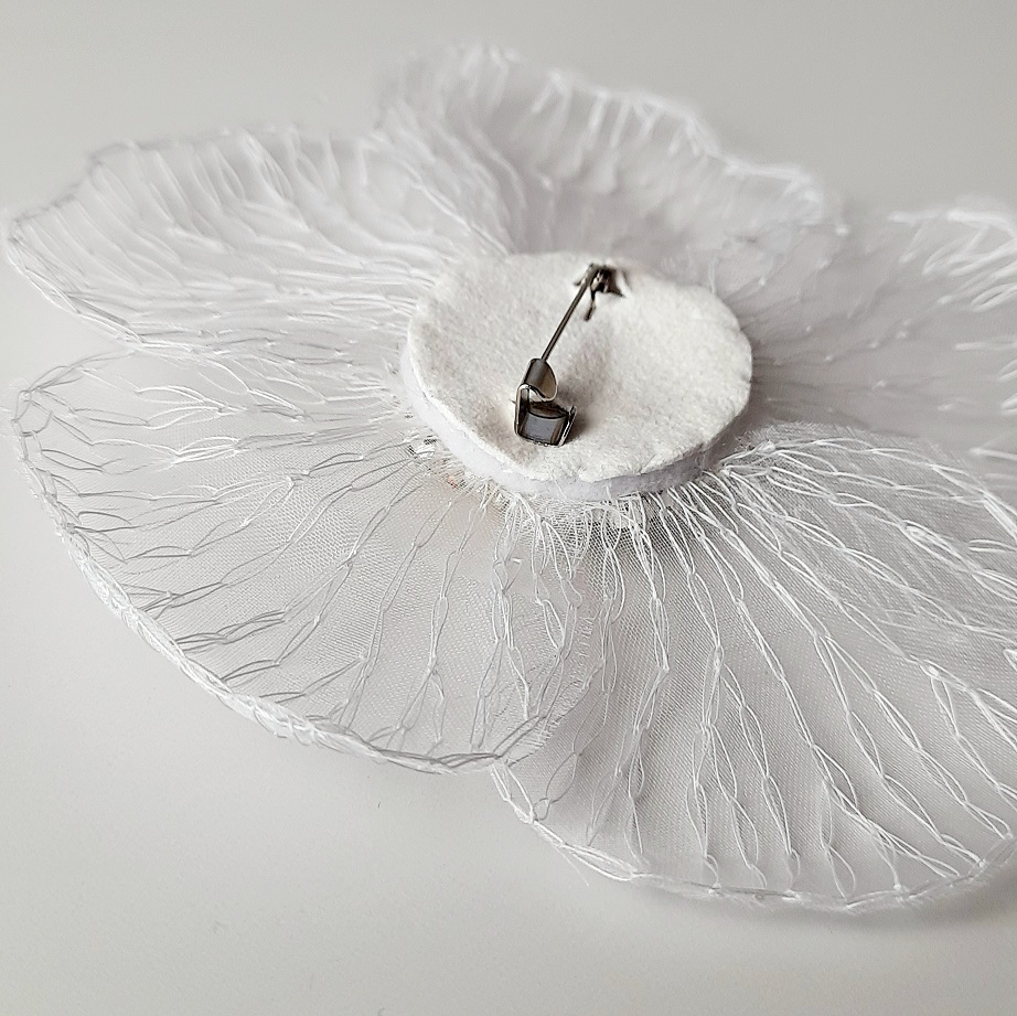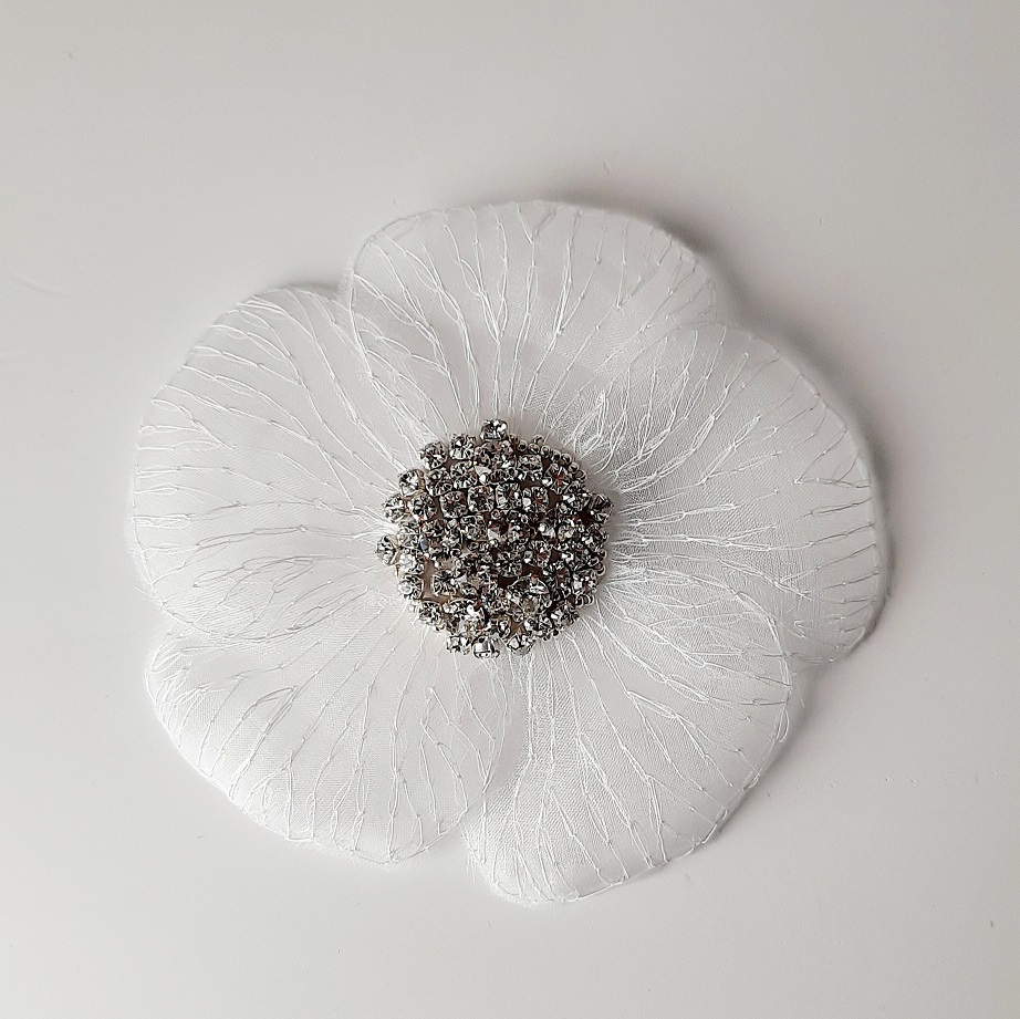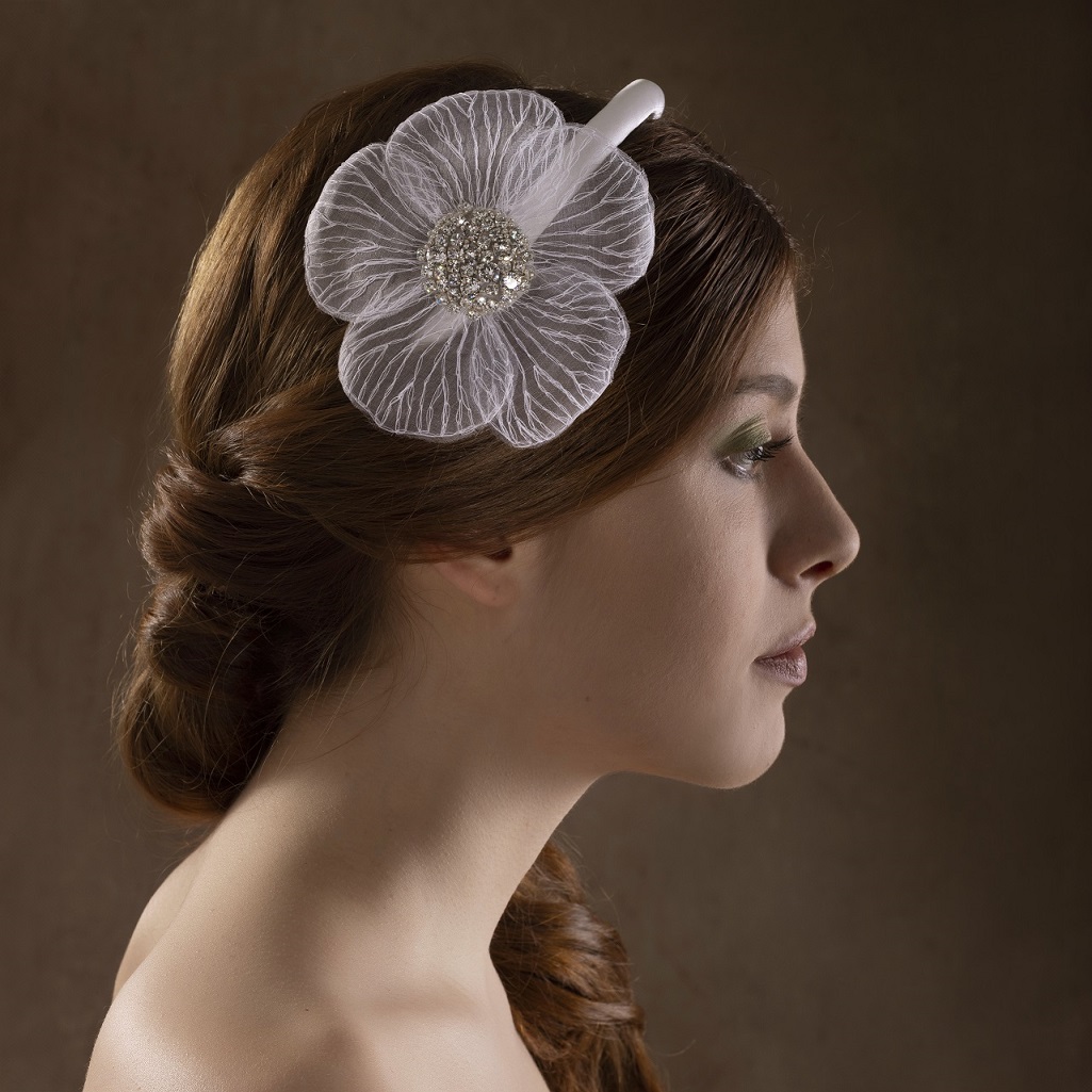 Il fiore è staccabile dal cerchietto e riutilizzabile come spilla da stola o da giacca.