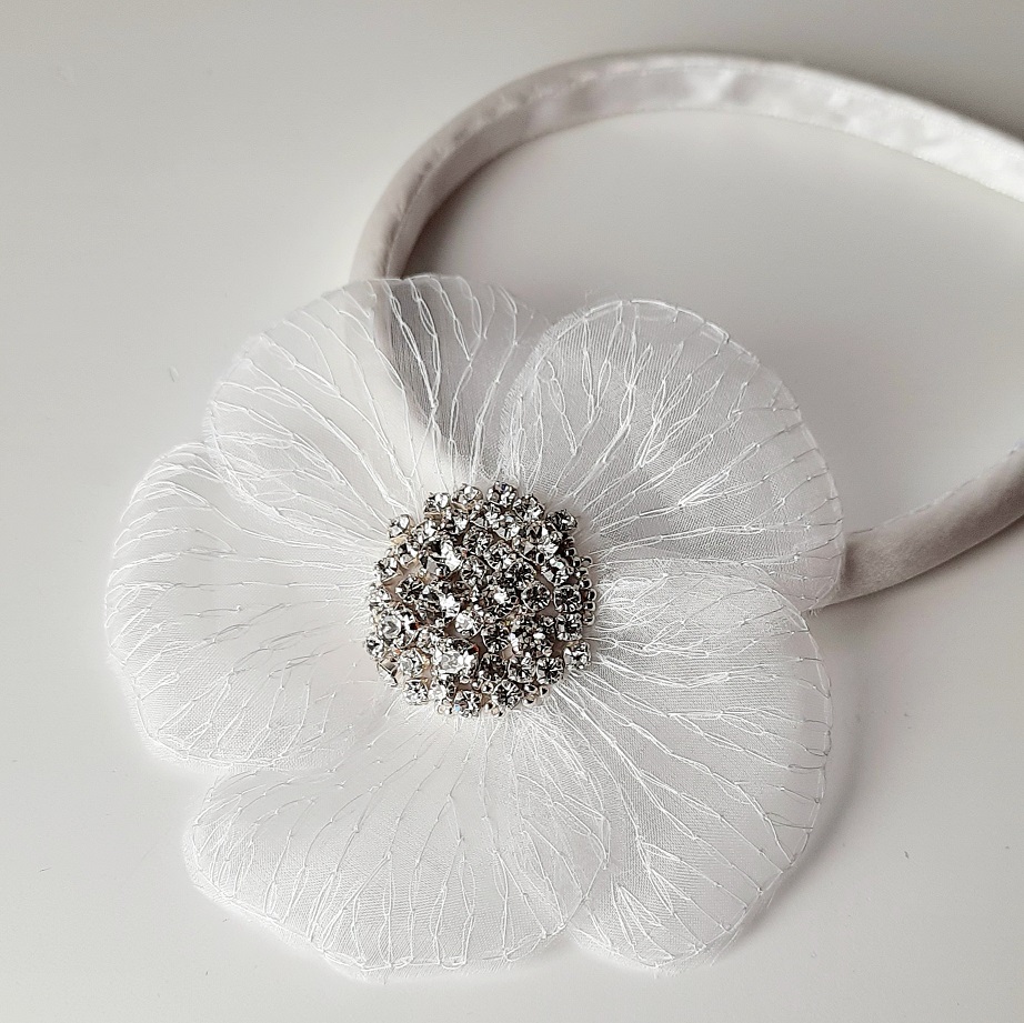 Cerchietto sottile rivestito in raso di seta bianco con applicazione di fiore ricamato e cristalli. Il fiore è interamente ricamato a mano su organza di seta bianca con tecnica di lunéville ed è completato da un centrale di cristalli Swarovski tondi di diverse dimensioni, sempre ricamati a mano. Il fiore ha un diametro di circa 11 cm e mantiene una forma tridimensionale e si può staccare dal cerchietto grazie a una spilla posta sul retro. Il cerchietto, cucito a mano, è largo 1 cm. L’interno è rivestito con nastro in raso o velluto ton sur ton per un comfort ottimale. Interamente cucito e ricamato a mano in Italia.