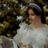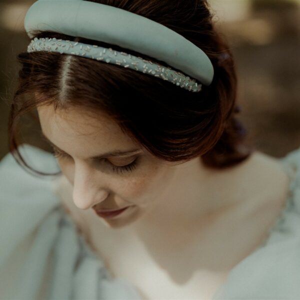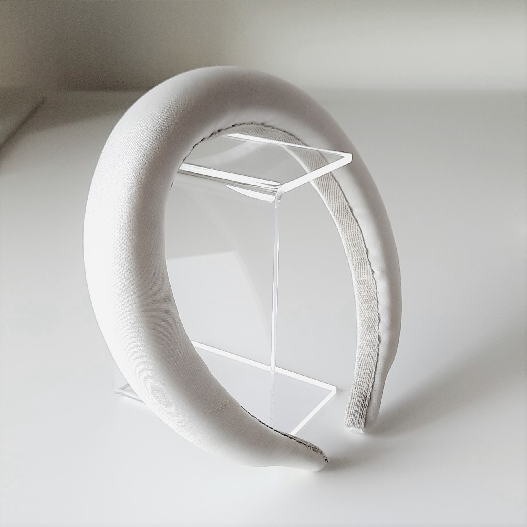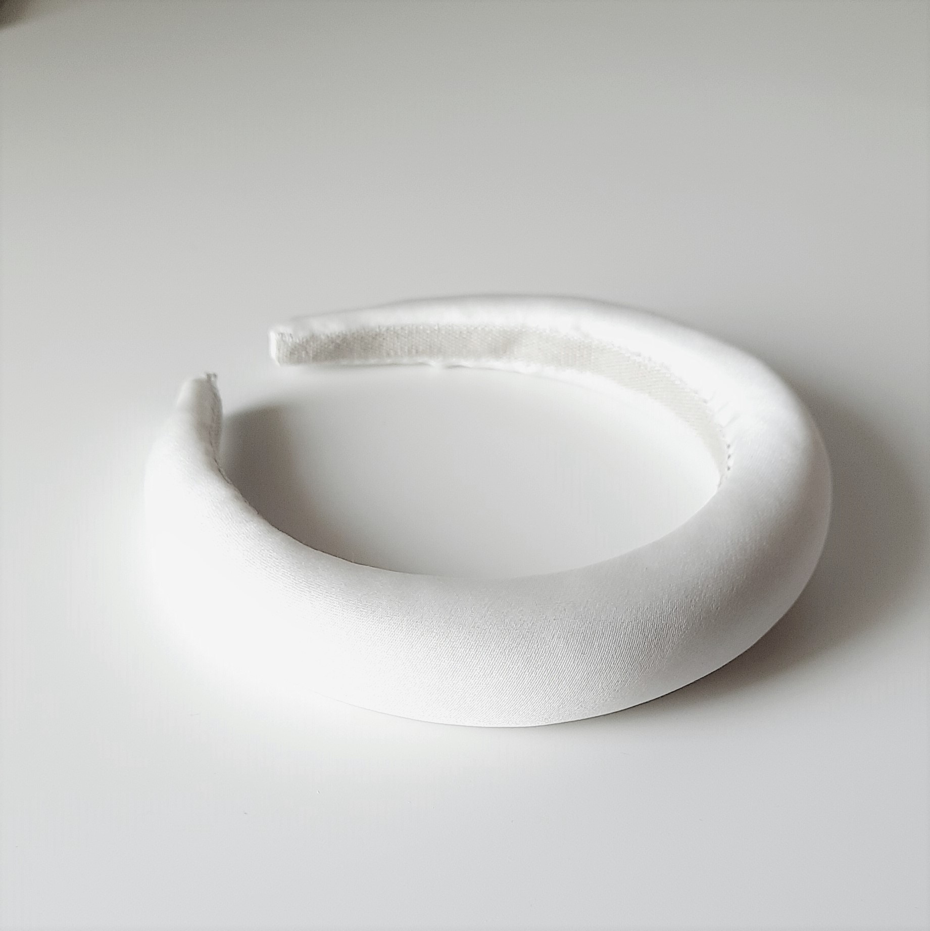 Cerchietto imbottito e rivestito in duchesse satin bianco interamente cucito a mano. Altezza imbottitura circa 25 mm nel punto più alto. Le estremità vengono lasciate gradualmente prive di imbottitura per un comfort ottimale. Disponibile a catalogo nei colori bianco o azzurro polvere. Interamente realizzato a mano in Italia.