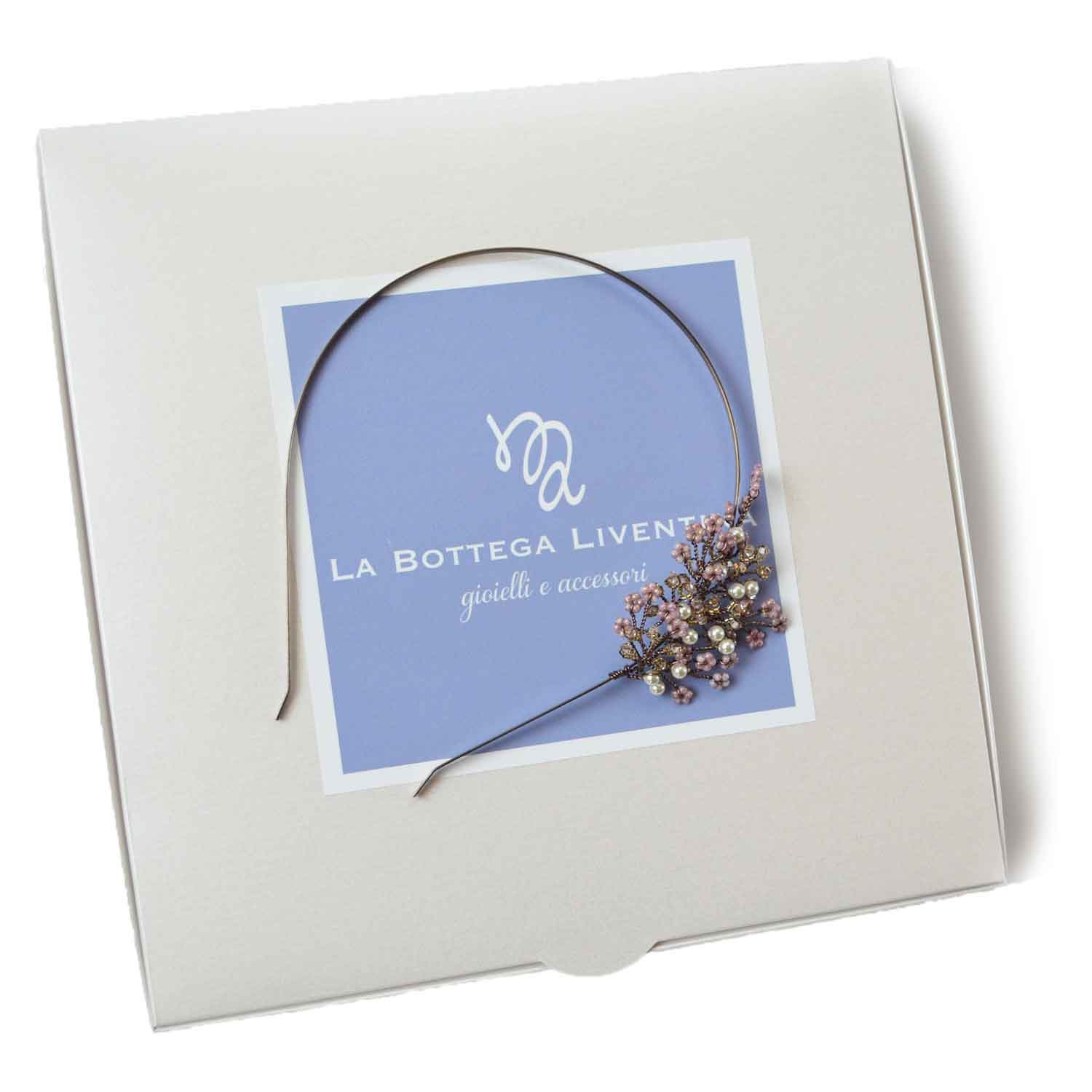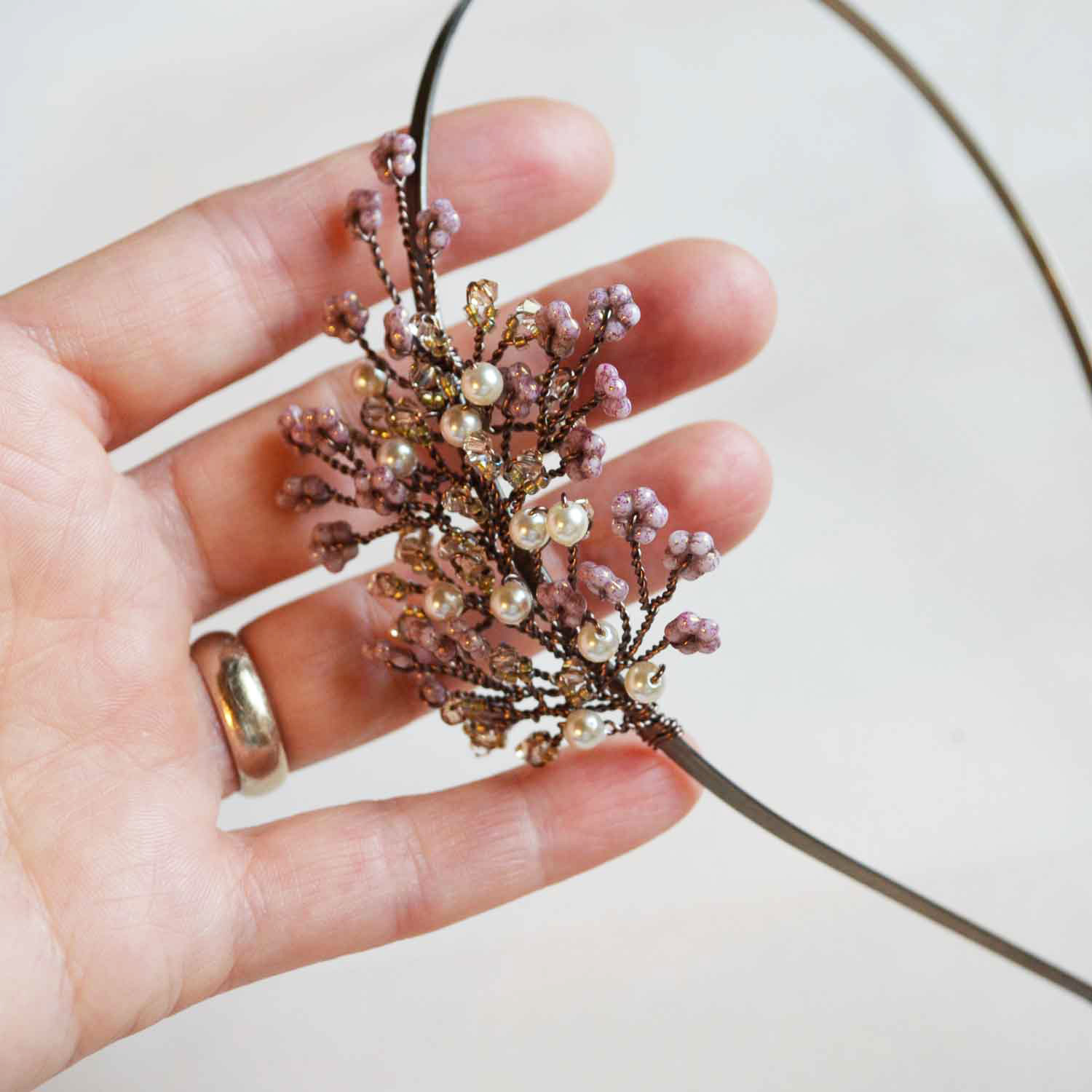 Cerchietto per capelli in bronzo con fiori rosa e crema. La decorazione laterale è realizzata con piccoli fiori in vetro “non ti scordar di me” rosa antico con riflessi dorati, perle Swarovski Cream (crema), cristalli Swarovski Crystal Golden Shadow (oro trasparente) e rocailles 15/0 bronzo. Dimensione decoro circa 7×5 cm.