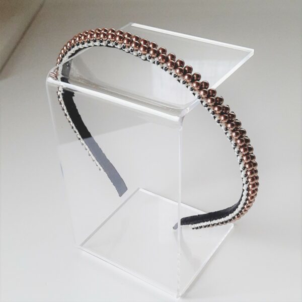 Cerchietto sottile in bronzo ricamato con rocailles 11/0 e 15/0 giapponesi bianco panna e grigio antracite, e 148 perle Swarovski da 4 mm color Bronze (bronzo satinato). Rivestimento interno in morbida nappa nera. Il cerchietto è largo circa 1 cm. Interamente ricamato e cucito a mano in Italia.