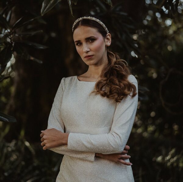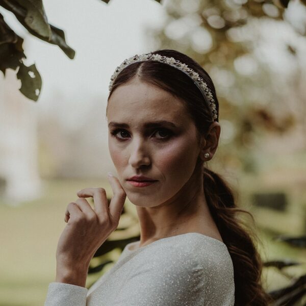 Questo cerchietto-gioiello ricamato con cristalli, delicato ed elegante, si abbina perfettamente a diversi look, come ad esempio un abito in pizzo avorio, crema o nude dallo stile romantico, oppure un abito scivolato in mikado. E’ perfetto per impreziosire una acconciatura semplice ed è adatto anche a una sposa dai capelli corti.