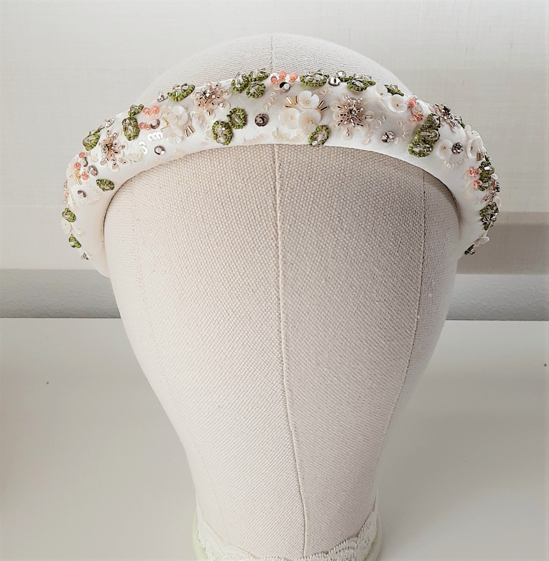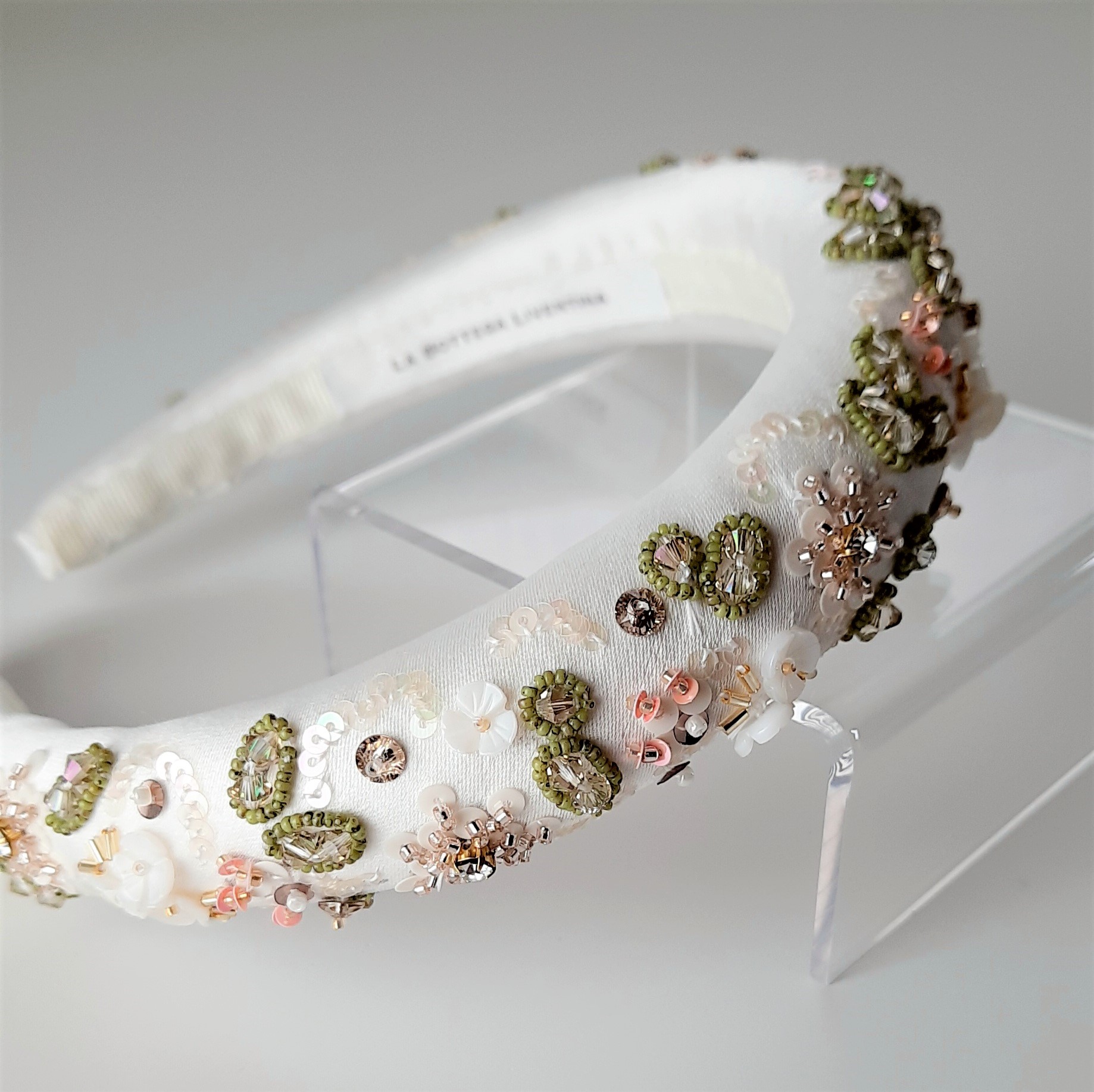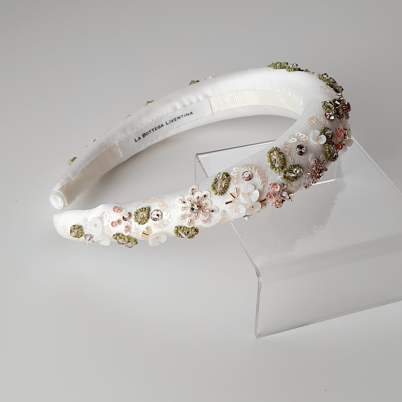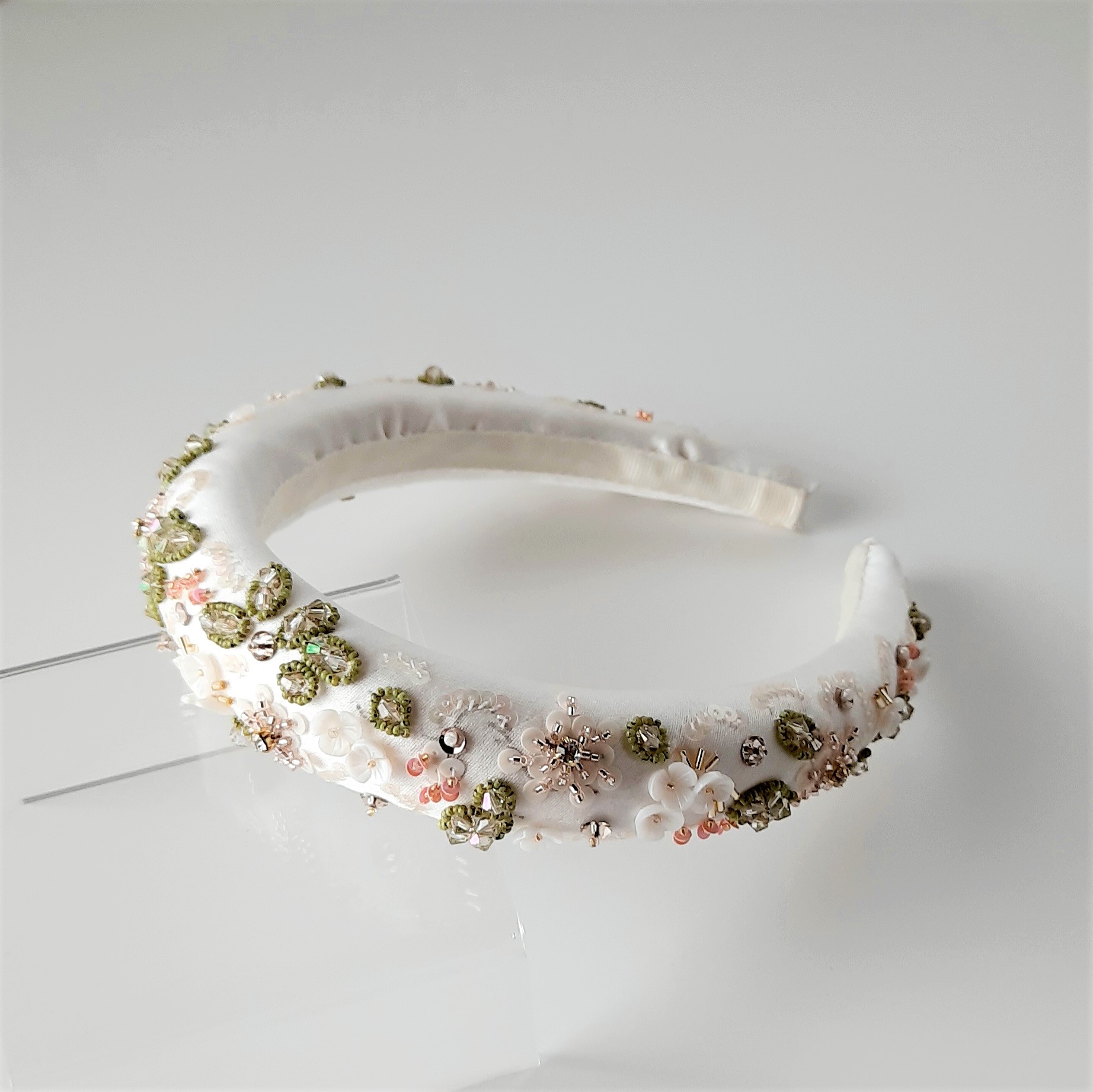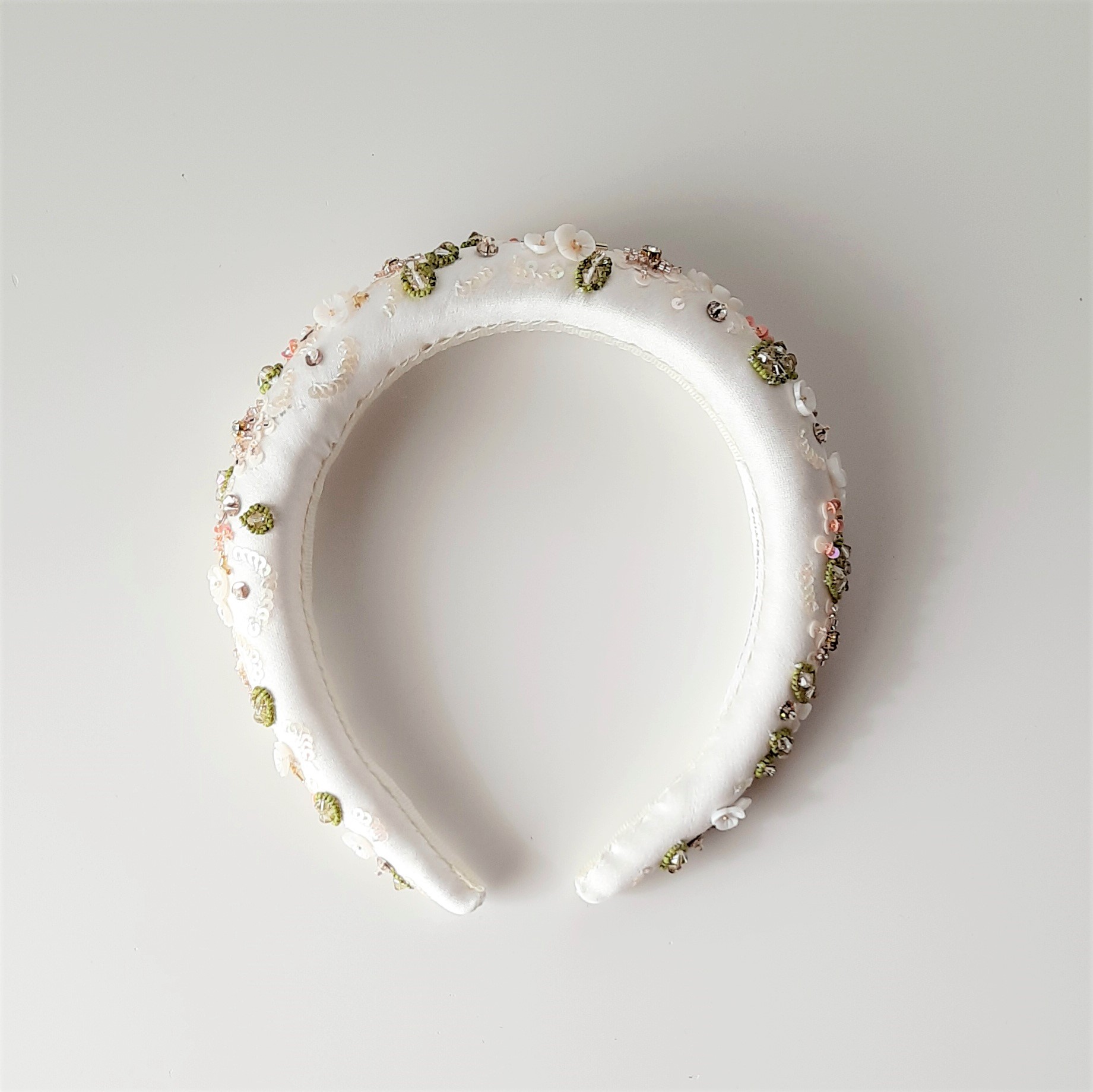 Meraviglioso cerchietto da sposa rivestito in duchesse satin bianco, ricamato con motivi floreali. Il disegno è ricco di materiali diversi: strass incastonati, cristalli Swarovski, perline giapponesi di varie dimensioni, paillettes e fiori in madreperla in un’esplosione di colori delicatissimi e primaverili. Larghezza 3 cm circa; altezza circa 2 cm (nel punto più alto, in centro). L’interno è rivestito con nastro gros grain per un comfort ottimale. Interamente cucito e ricamato a mano in Italia.