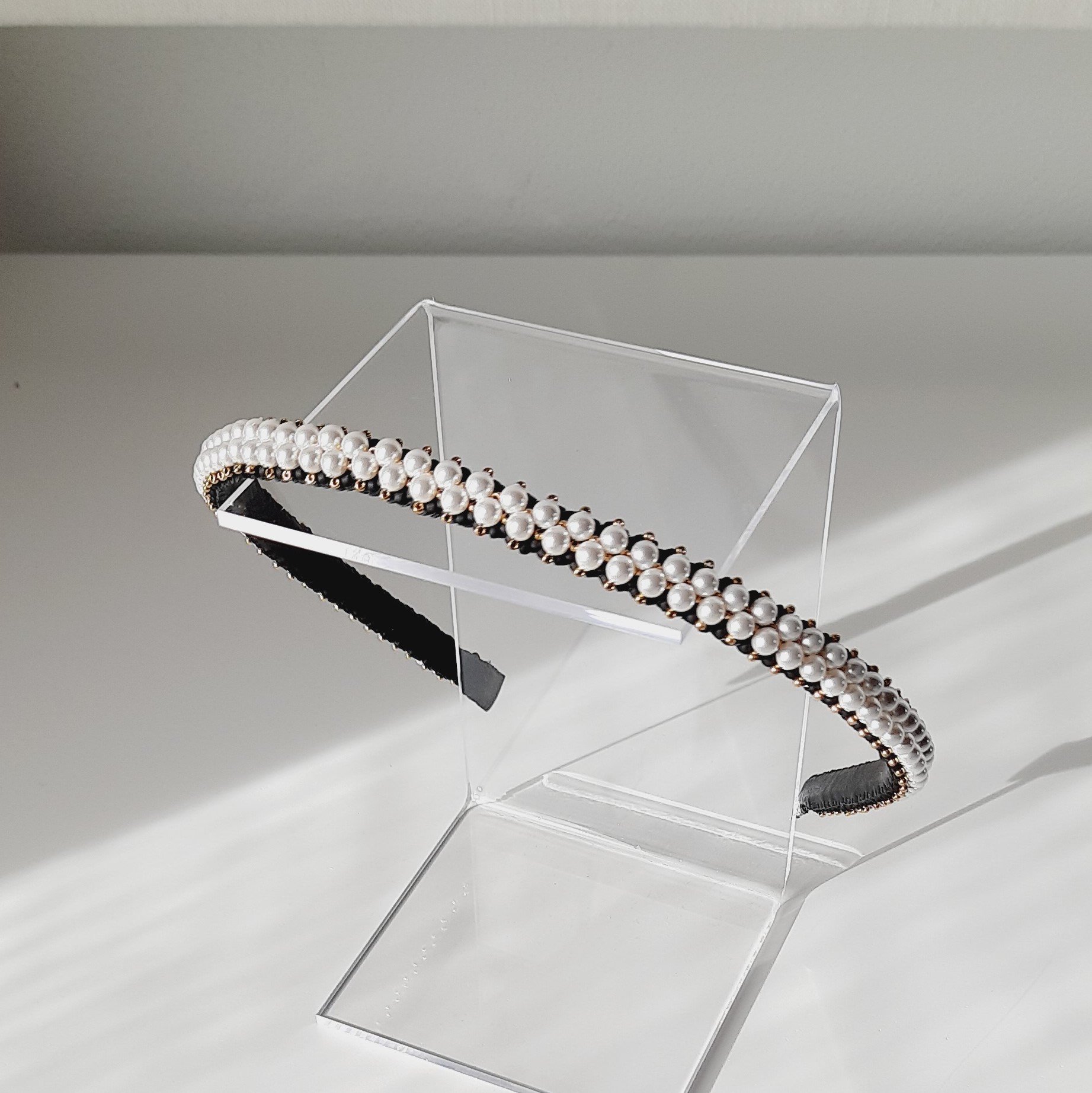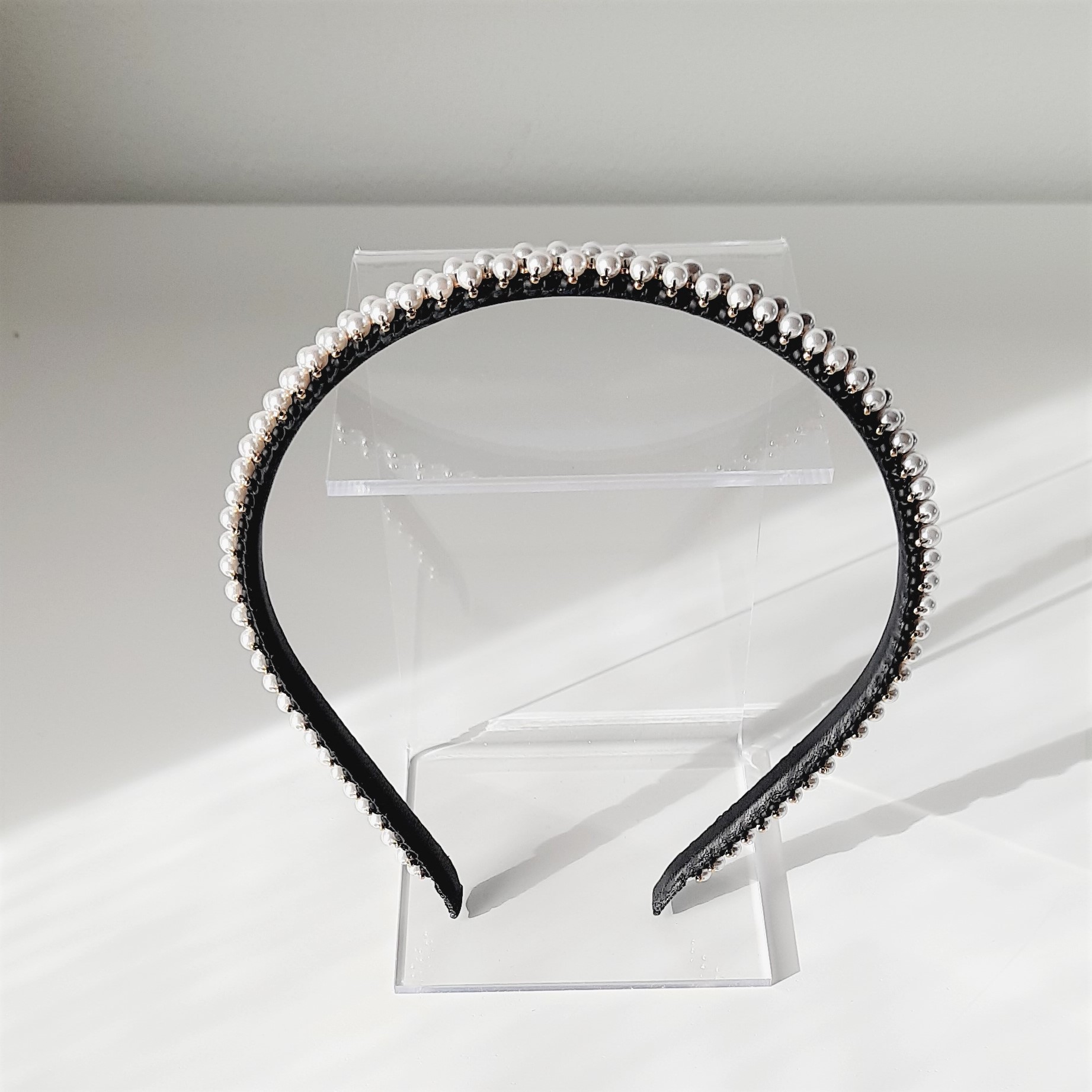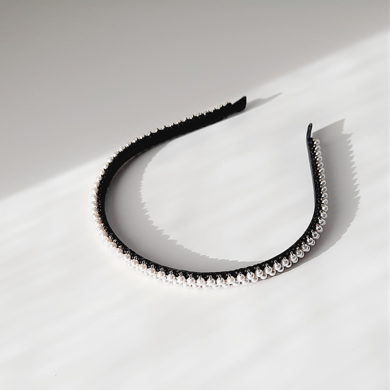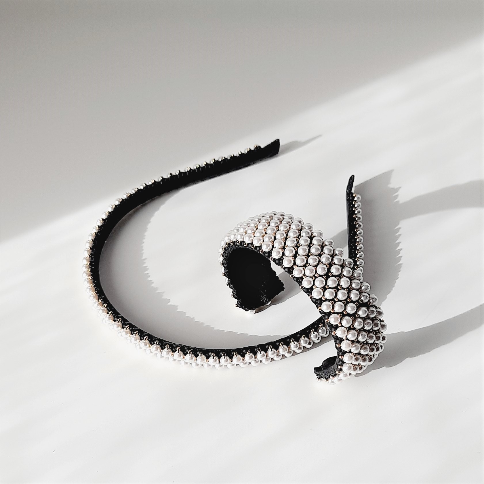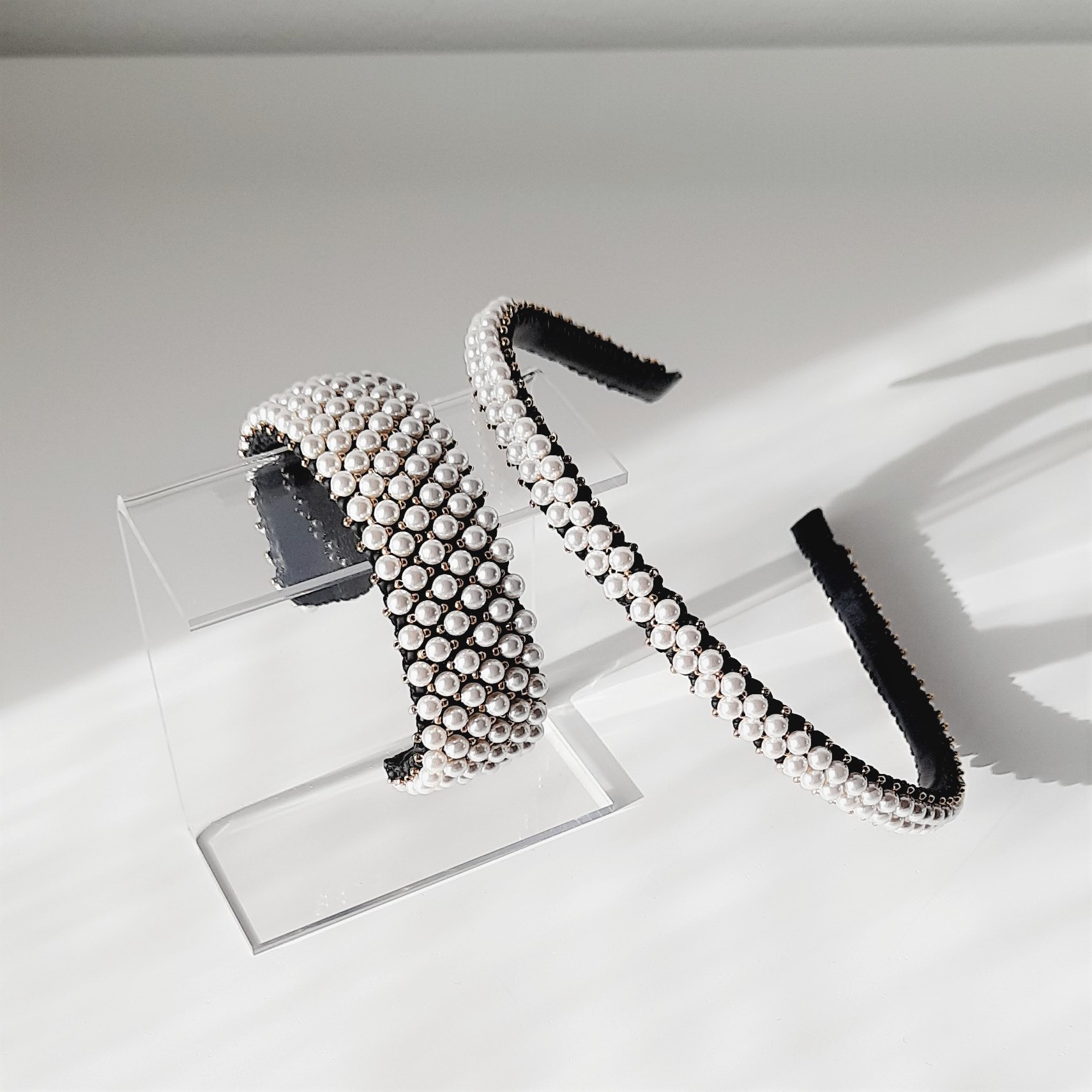 Cerchietto sottile ricamato con 142 perle Swarovski White (bianco perla) da 4 mm, rocailles giapponesi 11/0 nere e rocailles giapponesi 15/0 24kt Gold Plated. Larghezza circa 1 cm. Il rivestimento interno è realizzato in morbidissima nappa nera per un comfort ottimale. Interamente ricamato e cucito a mano in Italia.