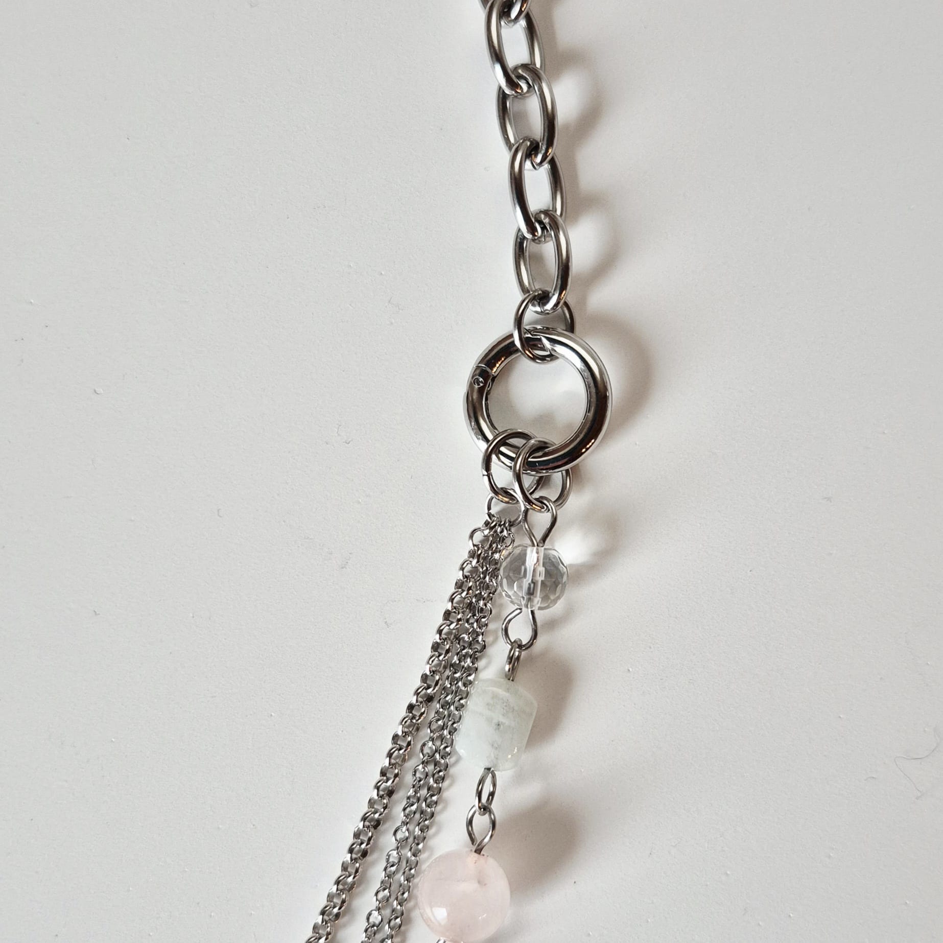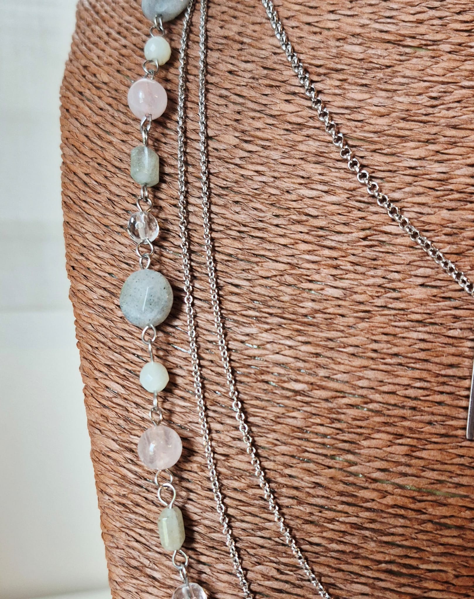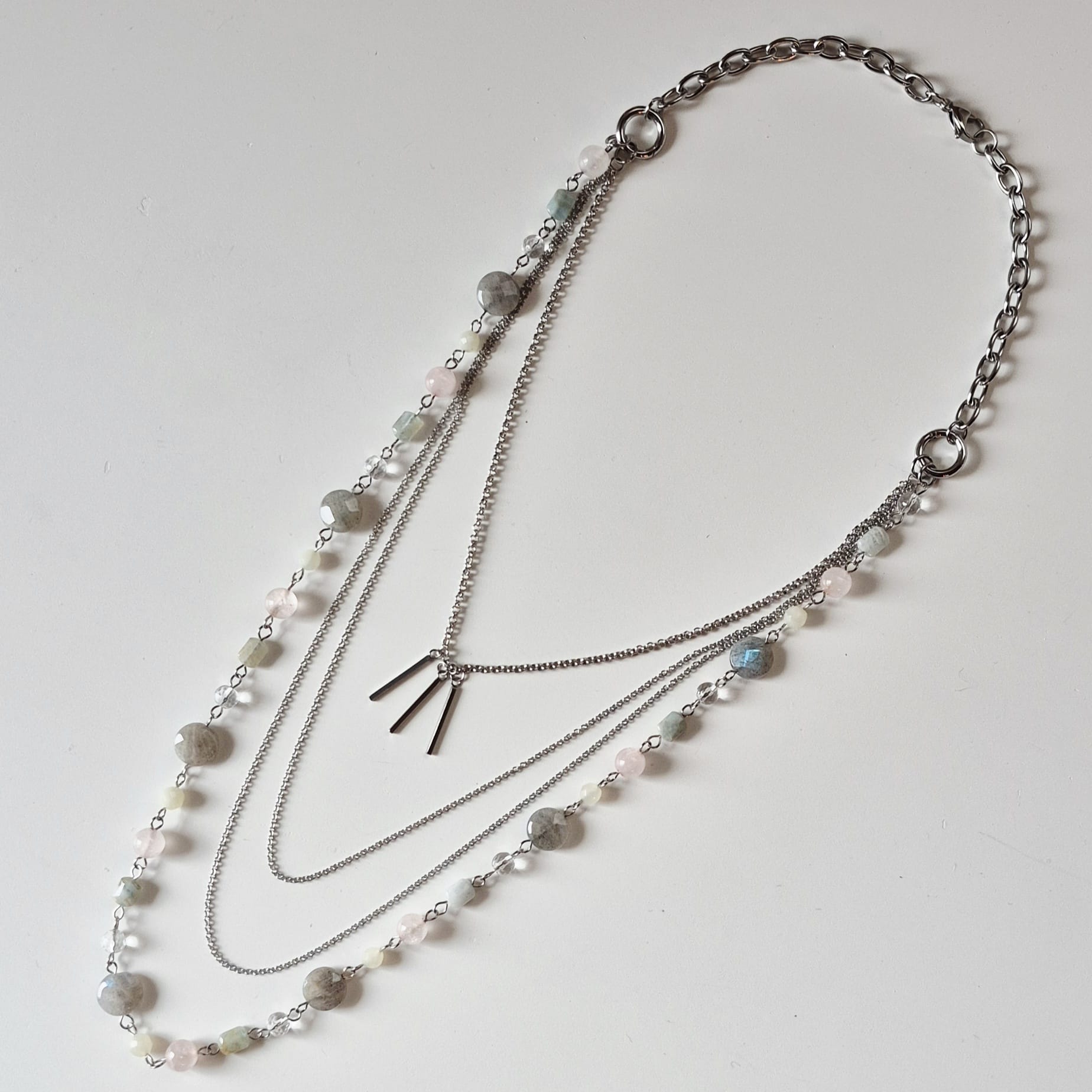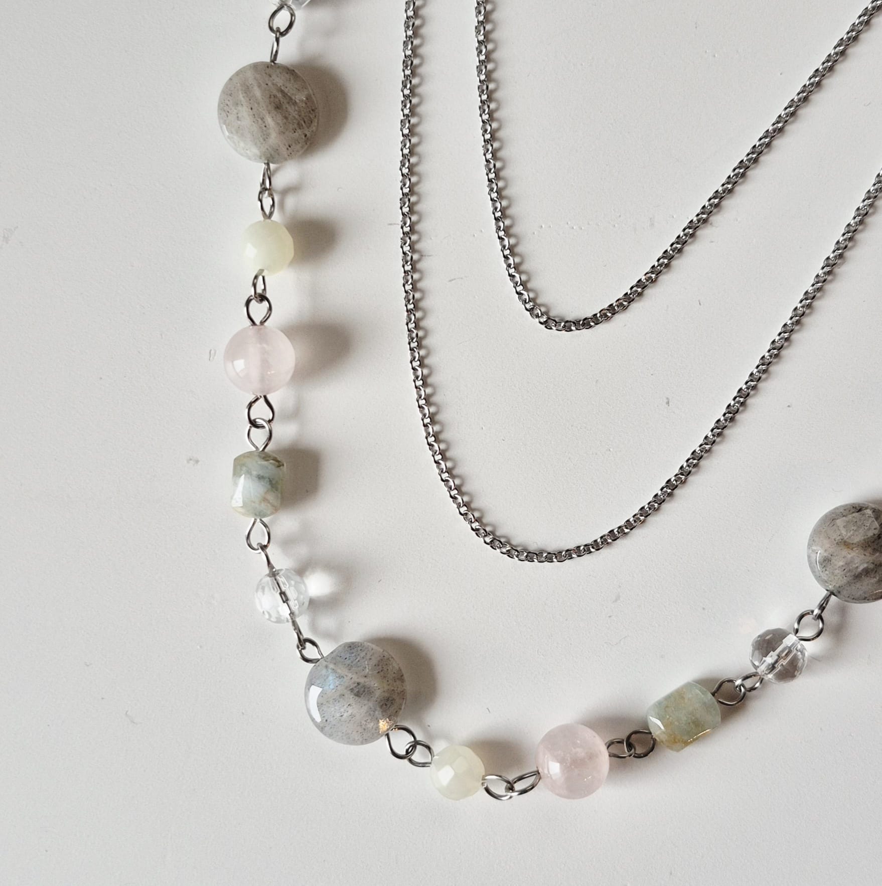 Collana Mondrian a 4 fili con catene in acciaio inox e pietre dure. Le pietre utilizzate sono labradorite da 12 mm, quarzo rosa da 8 mm, cristallo di rocca sfaccettato da 6 mm, giada verde sfaccettata da 5 mm e acquamarina multicolor 6×8 mm. Tutte le catene e i componenti utilizzati sono in acciaio inox. Essendo dotata di 3 chiusure — una chiusura a moschettone sul retro e due chiusure ad anello laterali, questa collana può essere indossata in molti modi diversi. Lunghezza massima (filo di pietre + catena grossa) cm. 77, lunghezza minima (catena sottile con pendenti + catena grossa) cm. 52. Questa collana è un pezzo unico, replicabile in altri colori solo su richiesta.