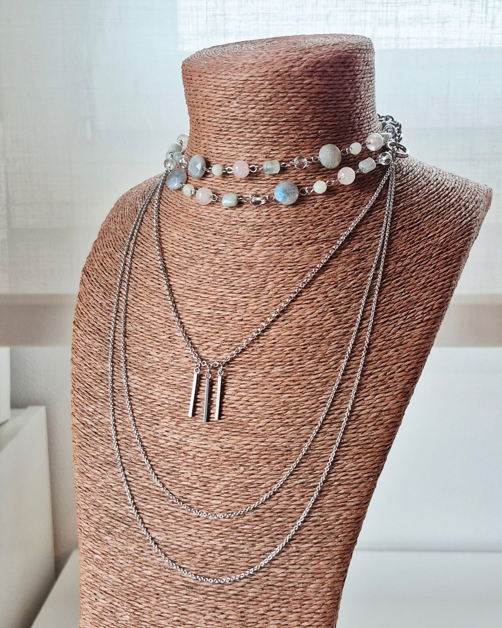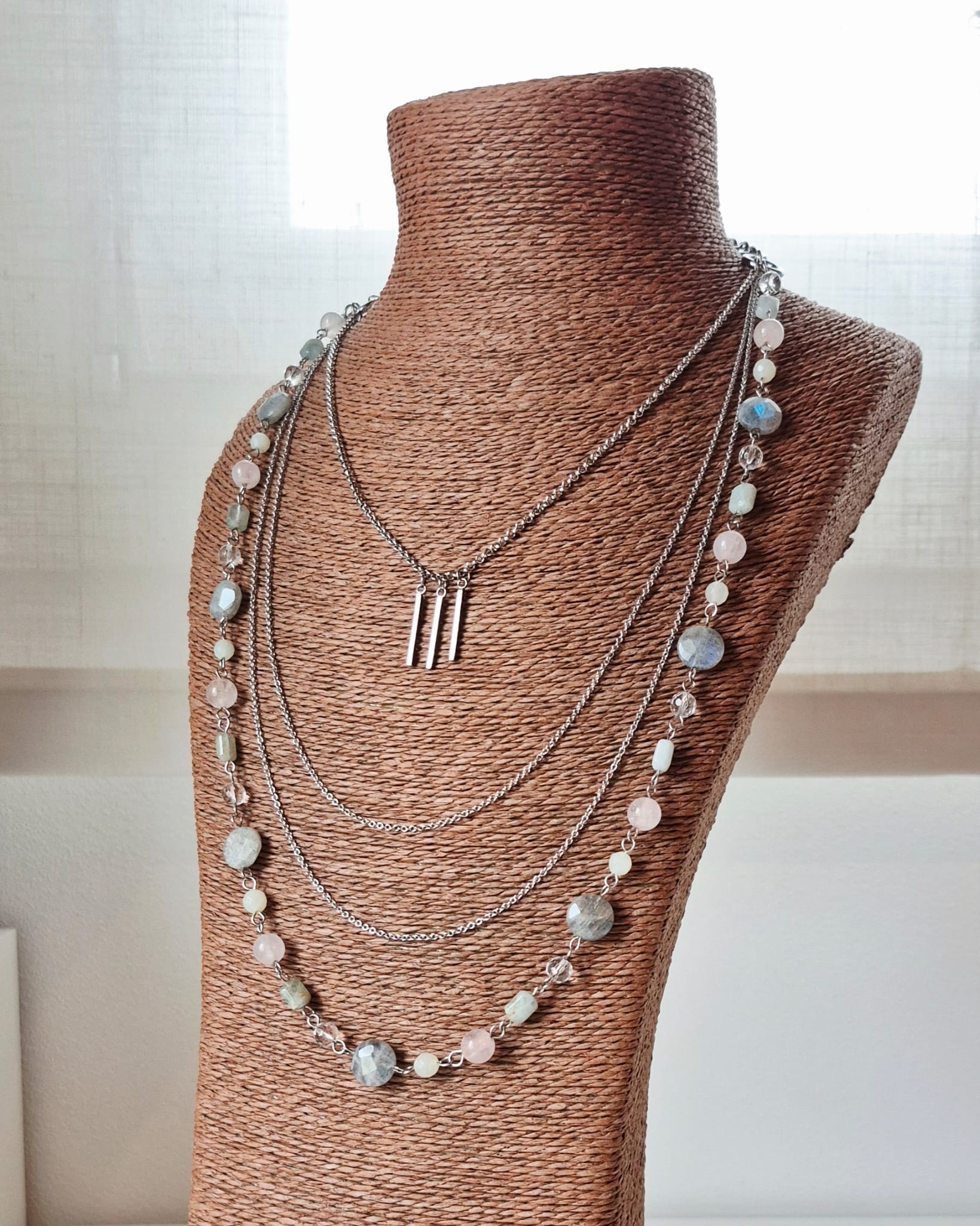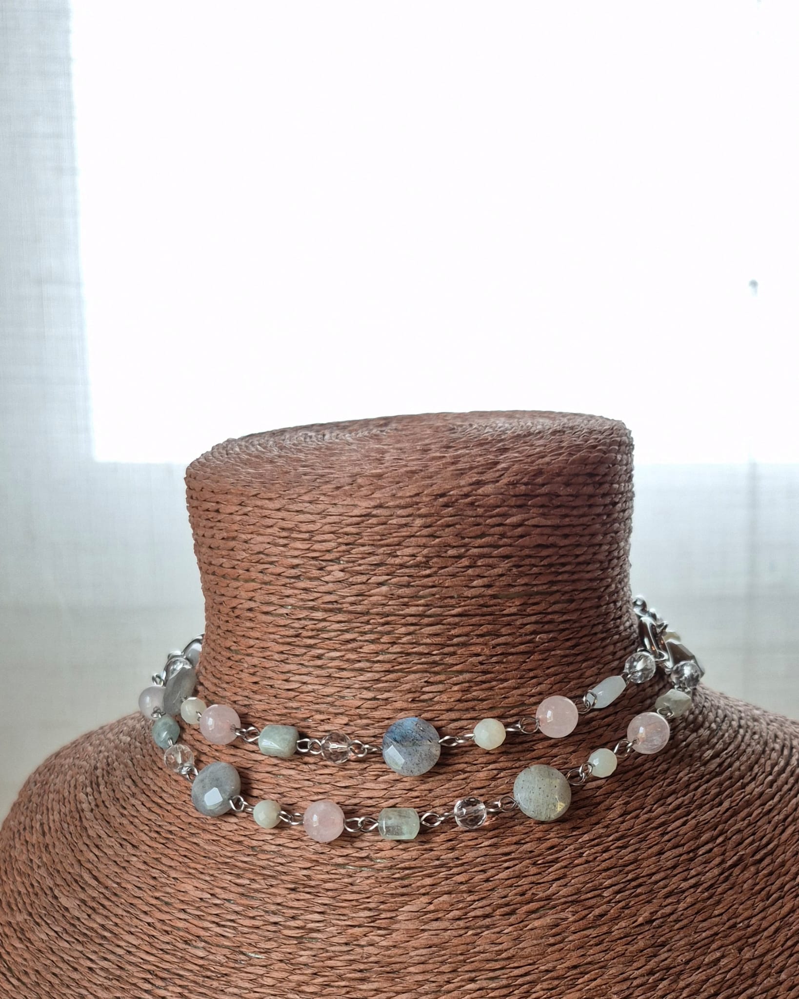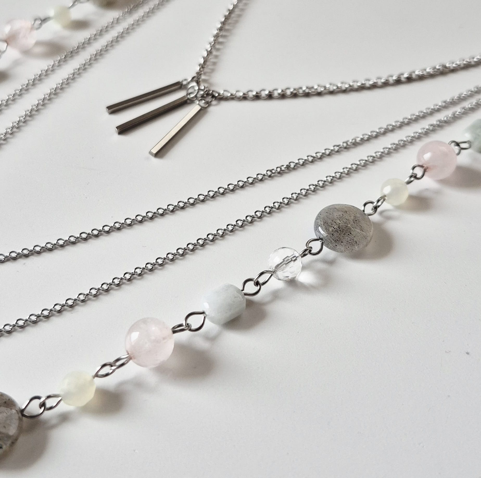 Collana Mondrian a 4 fili con catene in acciaio inox e pietre dure. Le pietre utilizzate sono labradorite da 12 mm, quarzo rosa da 8 mm, cristallo di rocca sfaccettato da 6 mm, giada verde sfaccettata da 5 mm e acquamarina multicolor 6×8 mm. Tutte le catene e i componenti utilizzati sono in acciaio inox. Essendo dotata di 3 chiusure — una chiusura a moschettone sul retro e due chiusure ad anello laterali, questa collana può essere indossata in molti modi diversi. Lunghezza massima (filo di pietre + catena grossa) cm. 77, lunghezza minima (catena sottile con pendenti + catena grossa) cm. 52. Questa collana è un pezzo unico, replicabile in altri colori solo su richiesta.