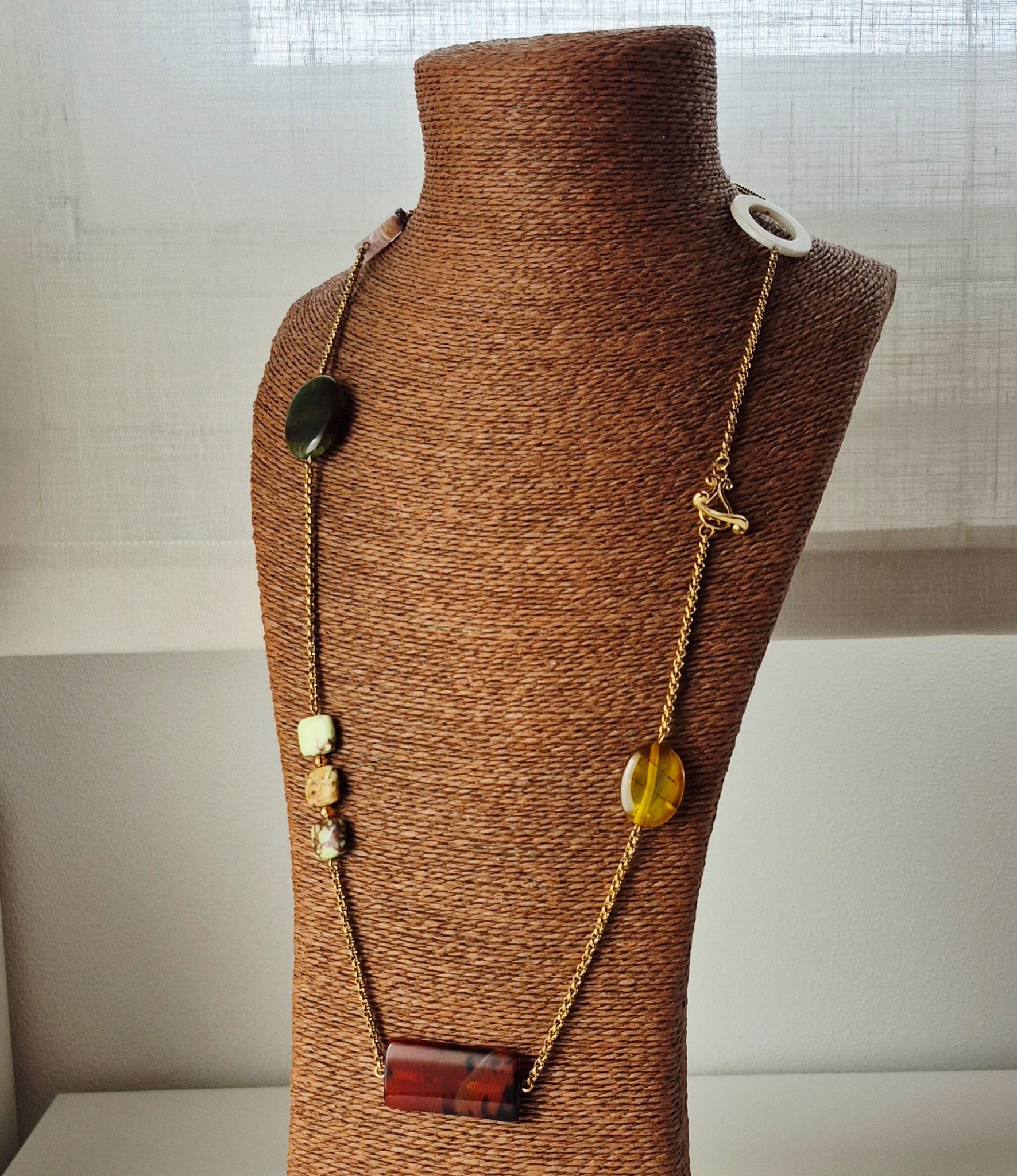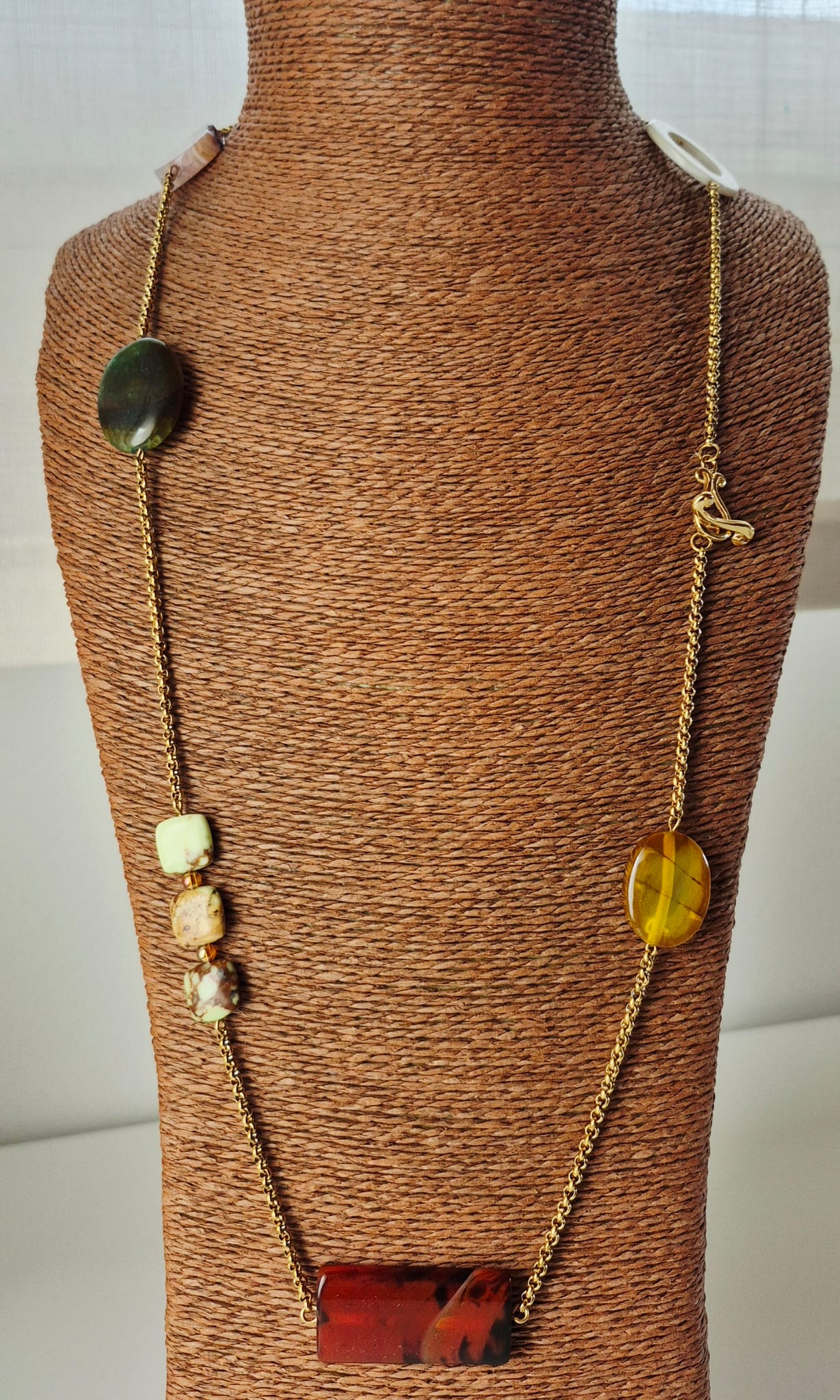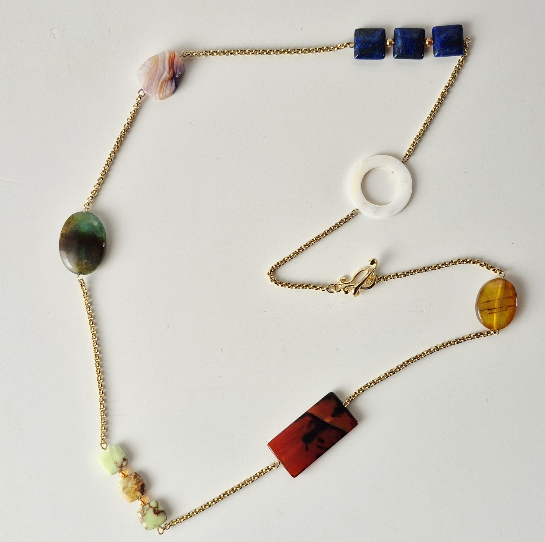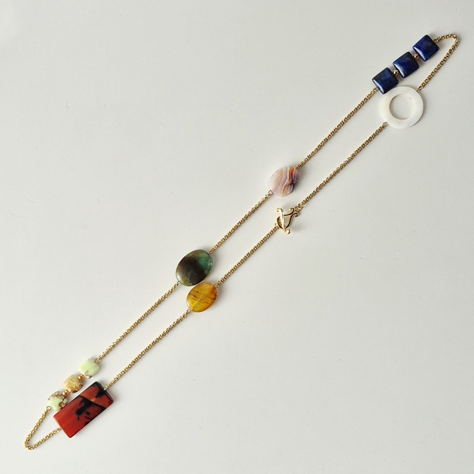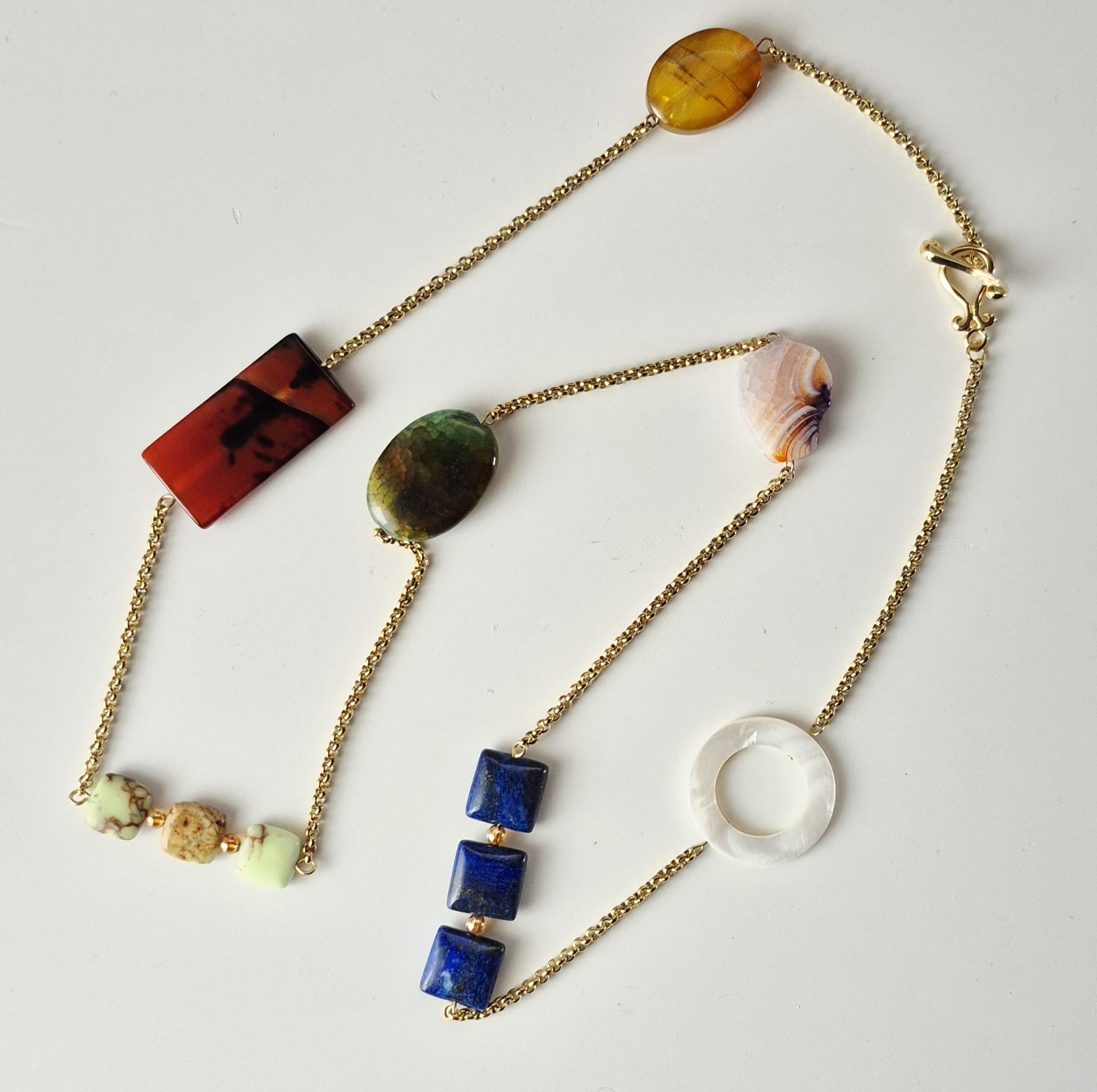 Collana lunga Chagall con catena in acciaio inox oro e pietre dure. Le pietre utilizzate sono: agata striata gialla, agata striata rossa e nera, crisoprasio, agata verde, agata striata rosa e viola, lapislazzuli, cristallo di rocca gold plated e madreperla bianca. Chiusura a T-bar in zamac dorato a forma di violino. Lunghezza totale collana cm. 86. Data la natura dei materiali, ogni gioiello è da considerarsi un pezzo unico e può differire leggermente dalle foto. Edizione limitata.