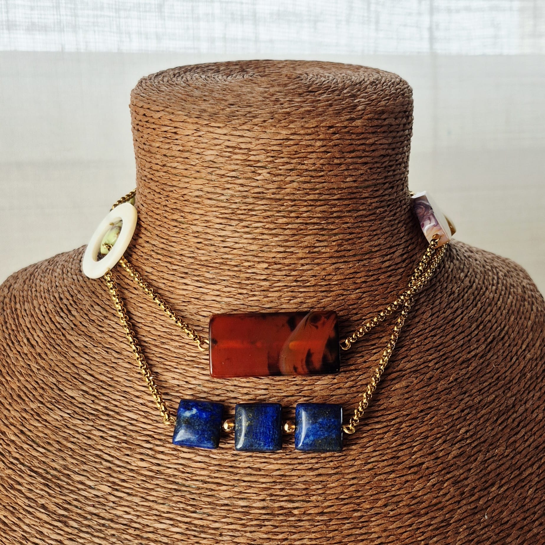 La collana Chagall con catena oro e pietre dure è un gioiello divertente e pieno di colore, ispirato alla palette del celebre dipinto “Il violinista” di Marc Chagall. Si abbina facilmente a molti outfit, donando un tocco di vivacità anche al look più semplice. Questa collana si può indossare lunga a un giro, ma anche a girocollo a due giri.