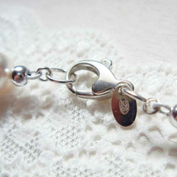 Collier con chiusura in argento 925 italiano e perle bianche Swarovski color White (bianco puro) per la sposa. Le perle hanno un diametro di 8 mm, mentre il collier misura 41 cm. Per avere un gioiello personalizzato — perle di altra dimensione o colore, collana di lunghezza differente — non esitare a contattarmi, scrivendo a info@labottegaliventina.com.