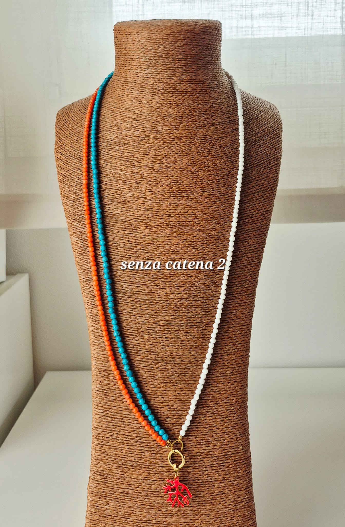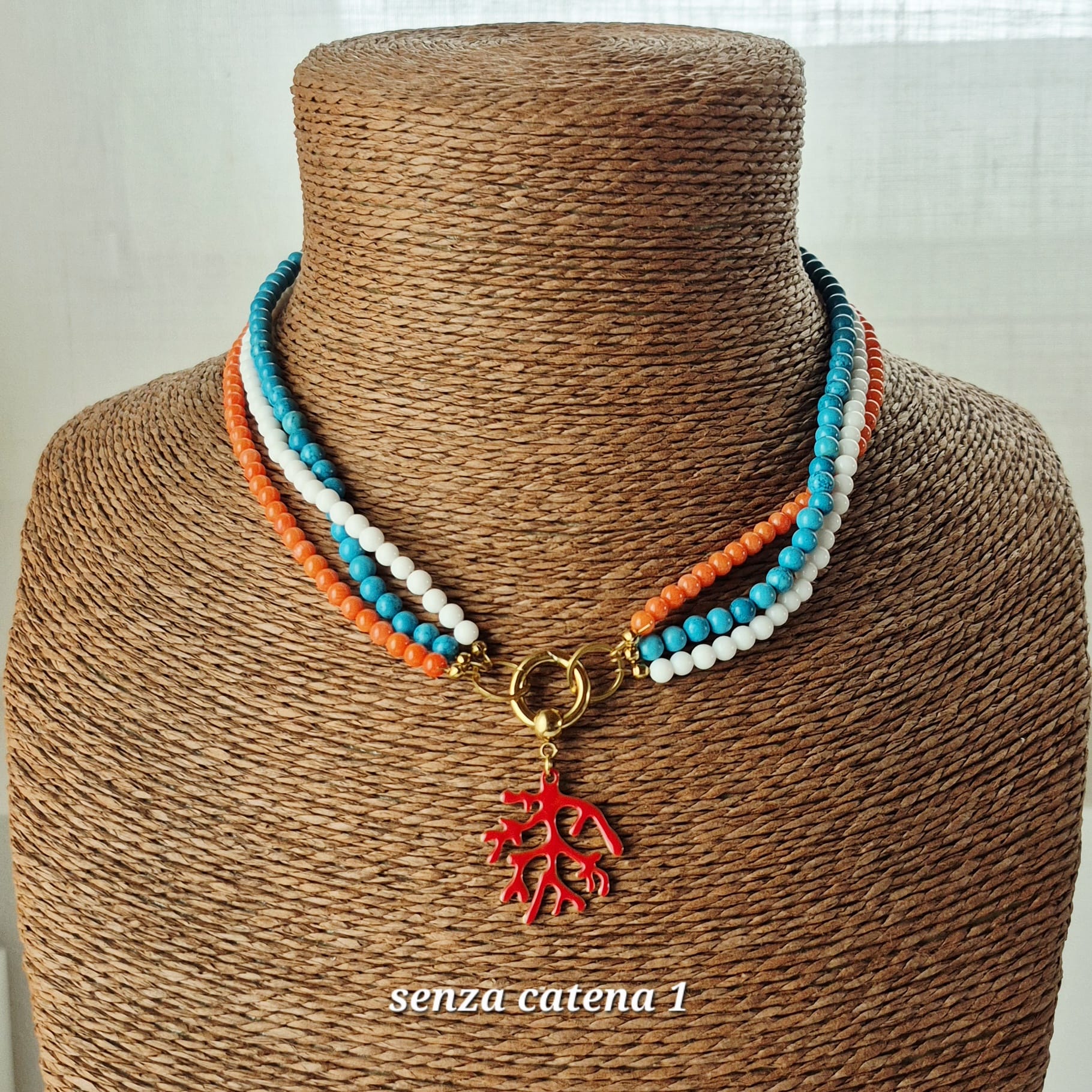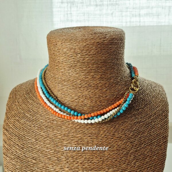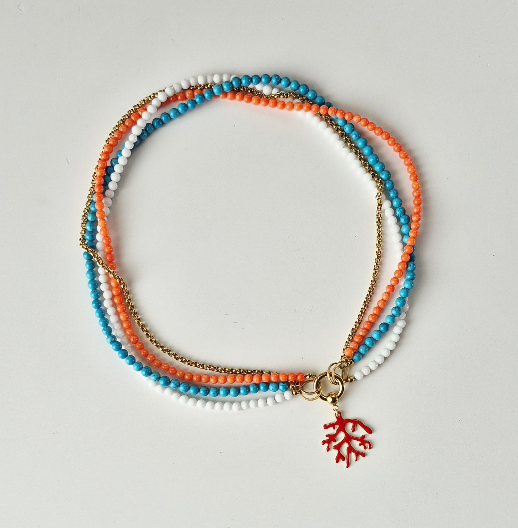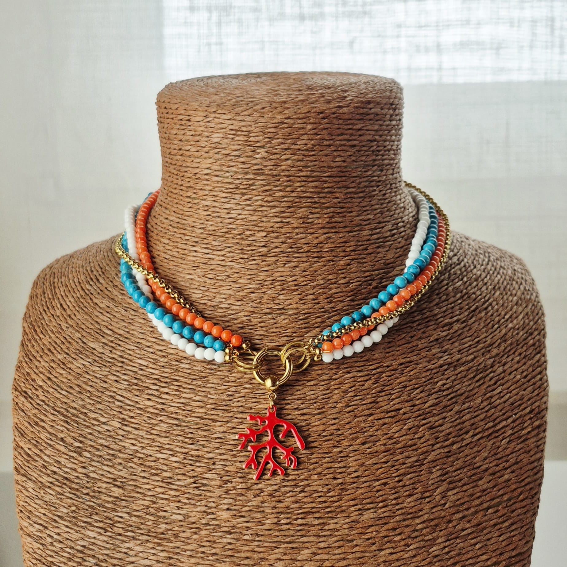 Collana collier in acciaio inox oro con corallo, turchese e agata bianca. Le pietre utilizzate sono corallo bambù color salmone da 3,5 mm, aulite turchese da 4 mm e agata bianca (sintetica) da 4 mm. La catena jaseron in acciaio inox placcato oro è separata dai tre fili di pietre e può essere tolta o usata da sola, permettendo di indossare il gioiello in modi diversi. Il pendente a forma di corallo in acciaio inox oro e resina epossidica è staccabile. Lunghezza totale 45 cm. Replicabile in altri colori su richiesta.