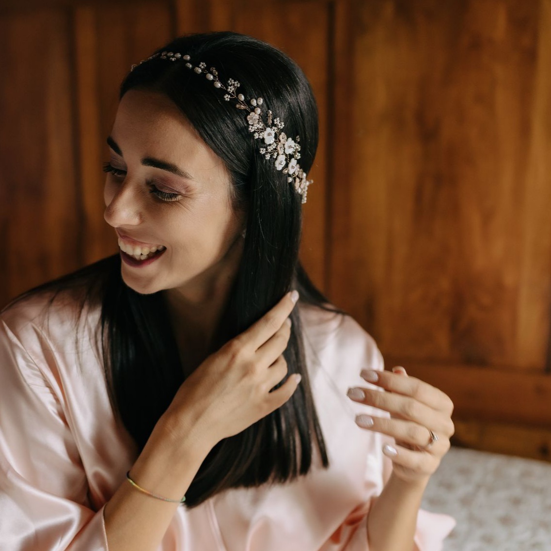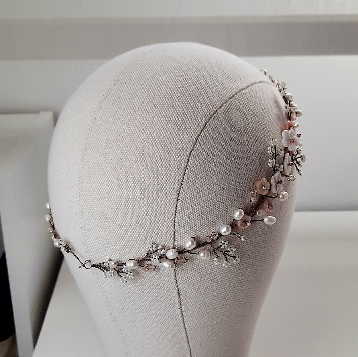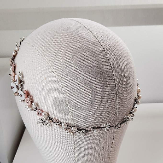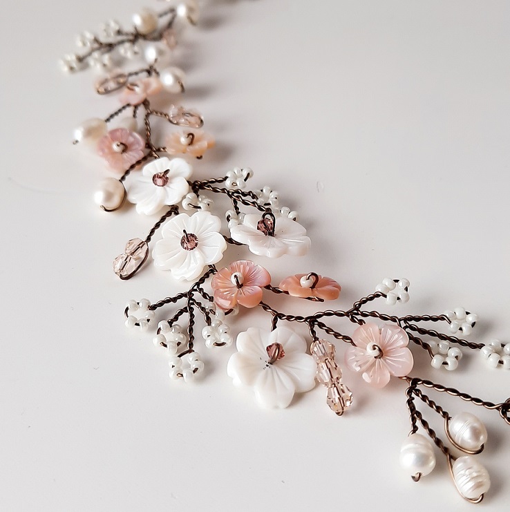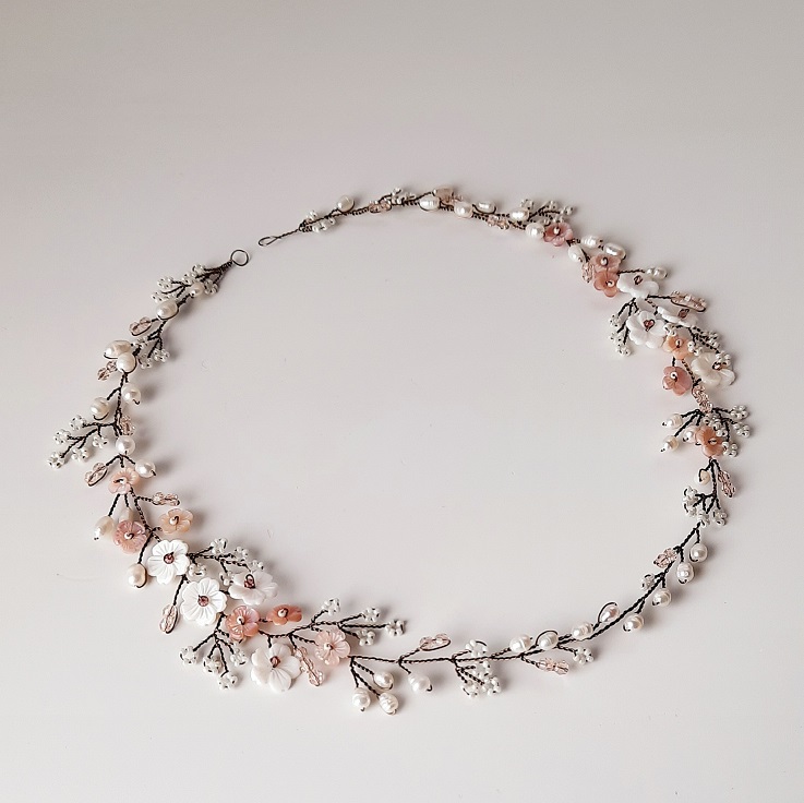 Coroncina per capelli in filo di ottone anticato intrecciato a mano con fiori in madreperla nei toni del bianco e rosa, perle coltivate bianche, rocailles 11/0 bianche e cristalli Swarovski Silk (rosa cipria trasparente) e Light Rose (rosa chiaro trasparente). Lunghezza circa 55 cm. L’accessorio ha una base in filo di metallo morbido che permette di essere modellato a piacere, mantenendo la forma desiderata. Si fissa all’acconciatura con forcine invisibili da parrucchiera (non incluse).