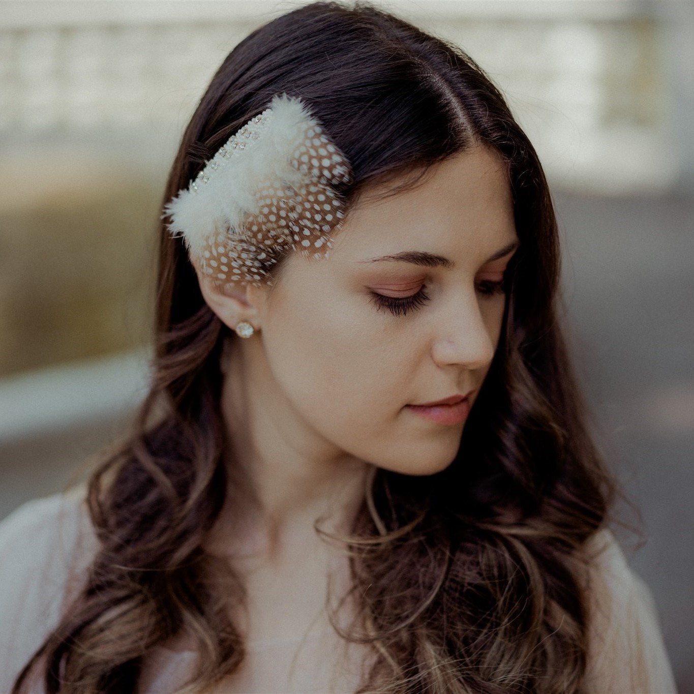 Fermaglio o molletta ricamato con cristalli Crystal e perline in vetro crema, impreziosita da una applicazione laterale di morbide piume color avorio e cammello con piccoli pois bianchi sulle punte. Il retro è rivestito in morbida ecopelle scamosciata per un comfort ottimale. Dimensioni della barretta ricamata: 7×2 cm. Altezza totale (piume comprese): circa 9 cm.