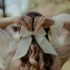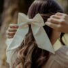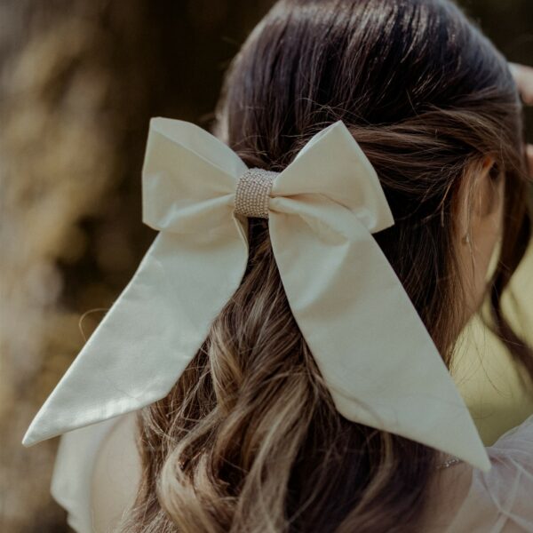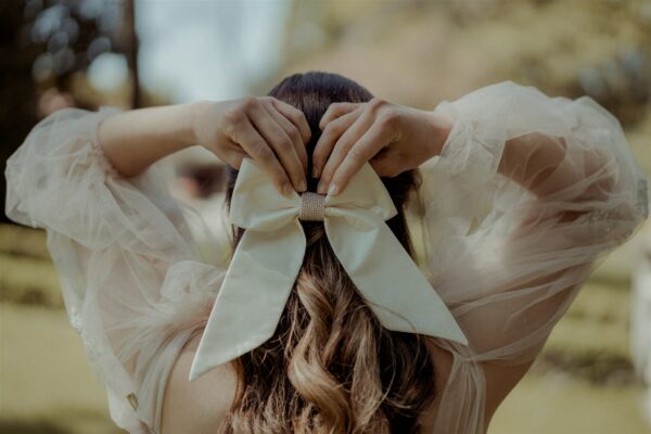 Molletta con grande fiocco per capelli rosa cipria in raso lucido di pura seta. Il “nodo” centrale è ricamato a mano con piccolissime perline opalescenti color rosa cipria e oro. Il fiocco è largo 15 cm e lungo circa 20 cm (code comprese).