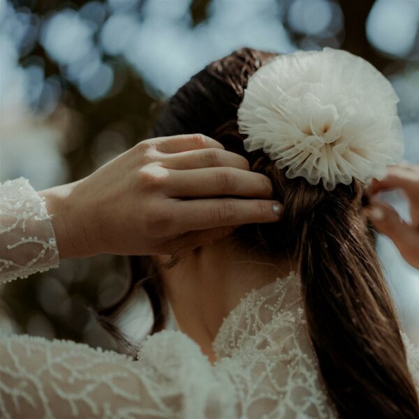 Delizioso accessorio adatto a molte acconciature, completa con un tocco di charme un abito da sposa sofisticato e dal taglio sartoriale. Questo fiore in tulle crema si applica all’acconciatura con una comoda molletta fissata sul retro ed è utilizzabile anche come spilla elegante da giacca o per impreziosire una cinturina.
