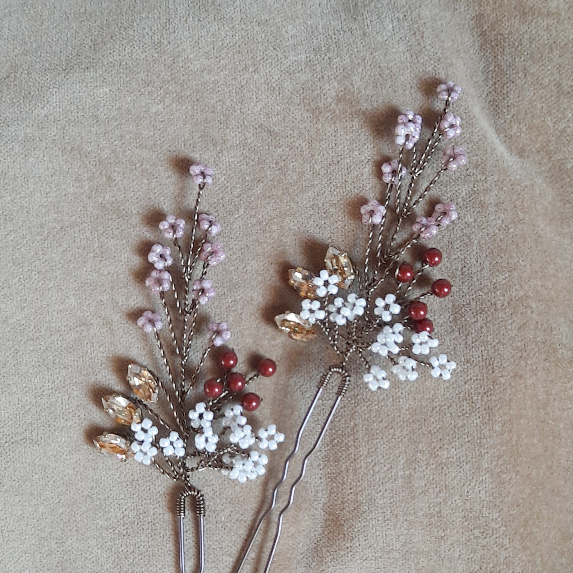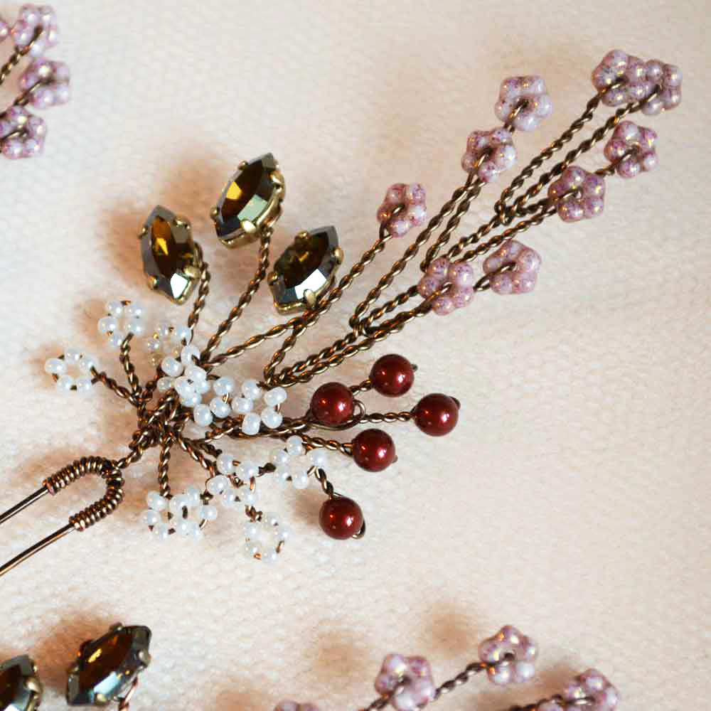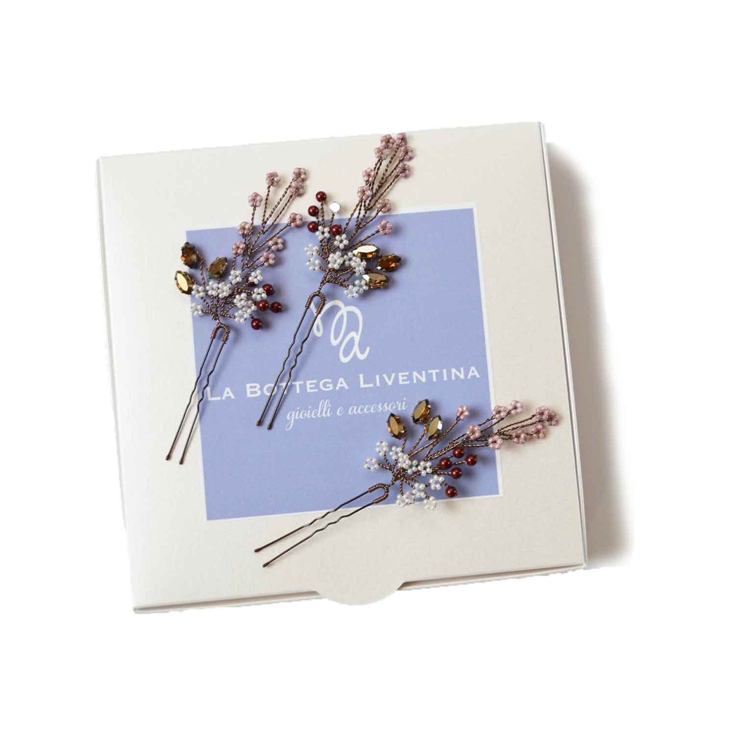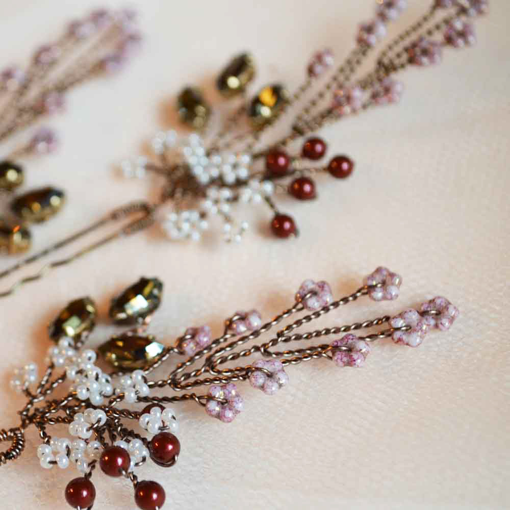 Queste forcine-gioiello nei toni del rosa, rosso e bronzo si abbinano a un abito vintage crema o rosa cipria, ma anche a un abito bianco naturale boho-chic. Adatte ad un matrimonio autunnale e invernale, o a tema botanico. Scegli la quantità da acquistare secondo le tue esigenze.