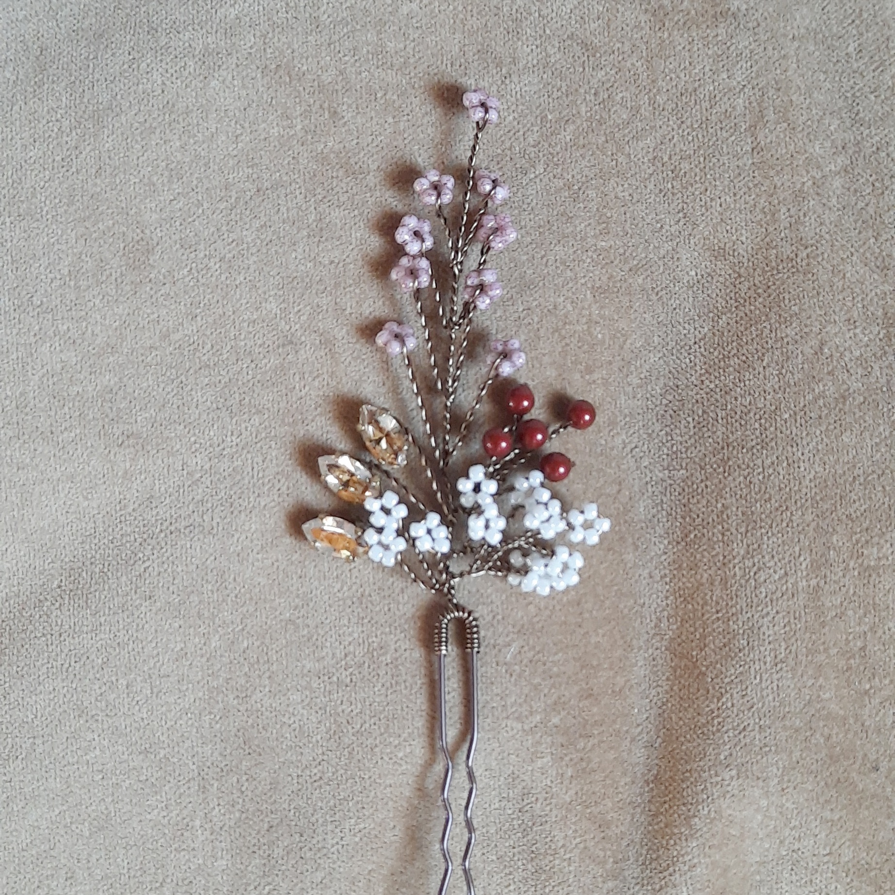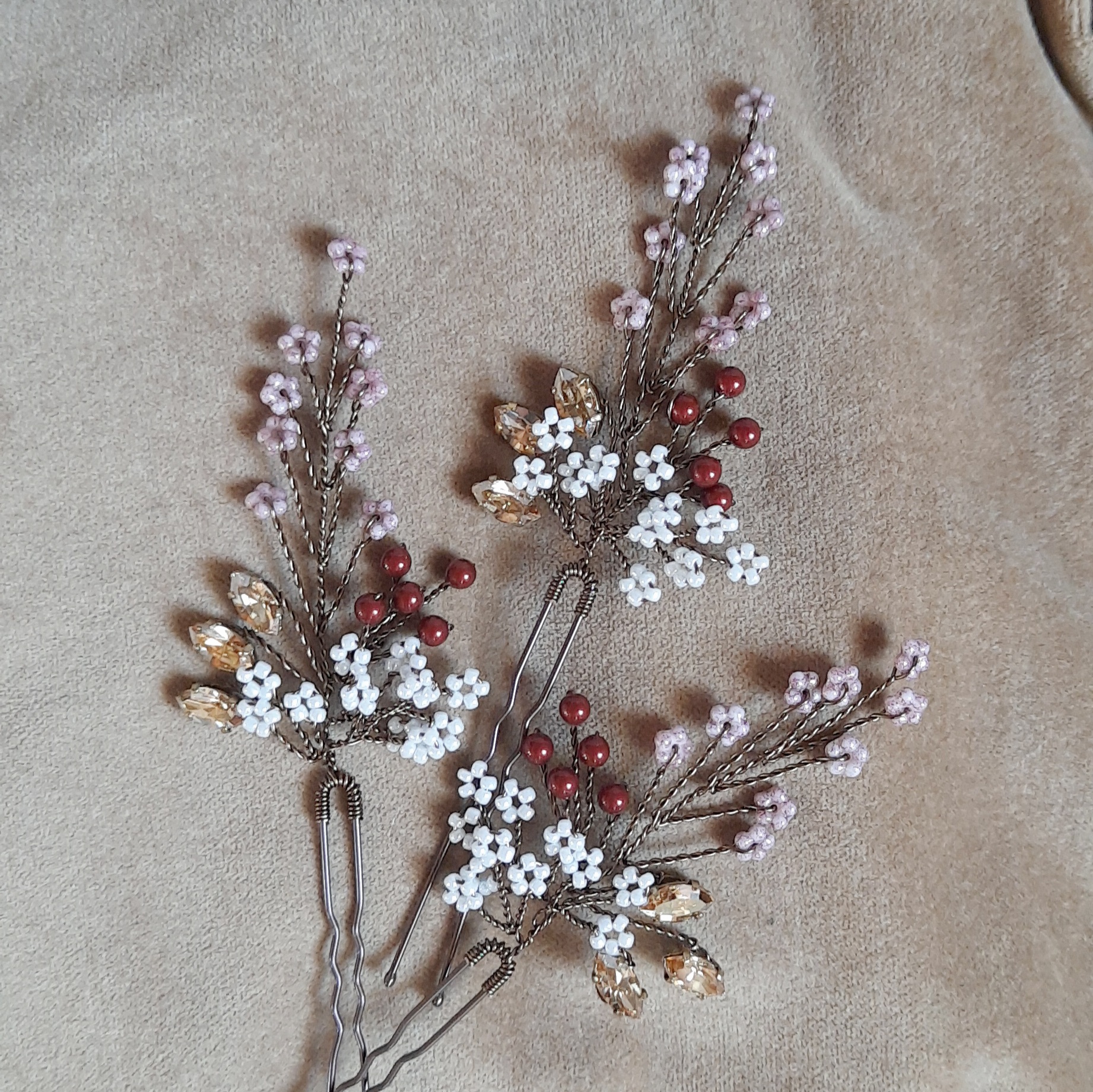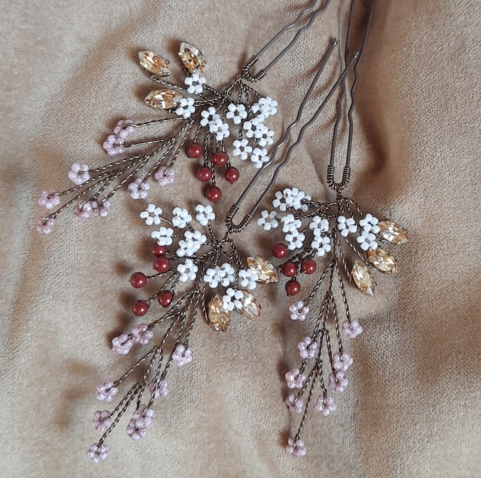 Queste forcine-gioiello nei toni del rosa, rosso e bronzo si abbinano a un abito vintage crema o rosa cipria, ma anche a un abito bianco naturale boho-chic. Adatte ad un matrimonio autunnale e invernale, o a tema botanico. Scegli la quantità da acquistare secondo le tue esigenze.