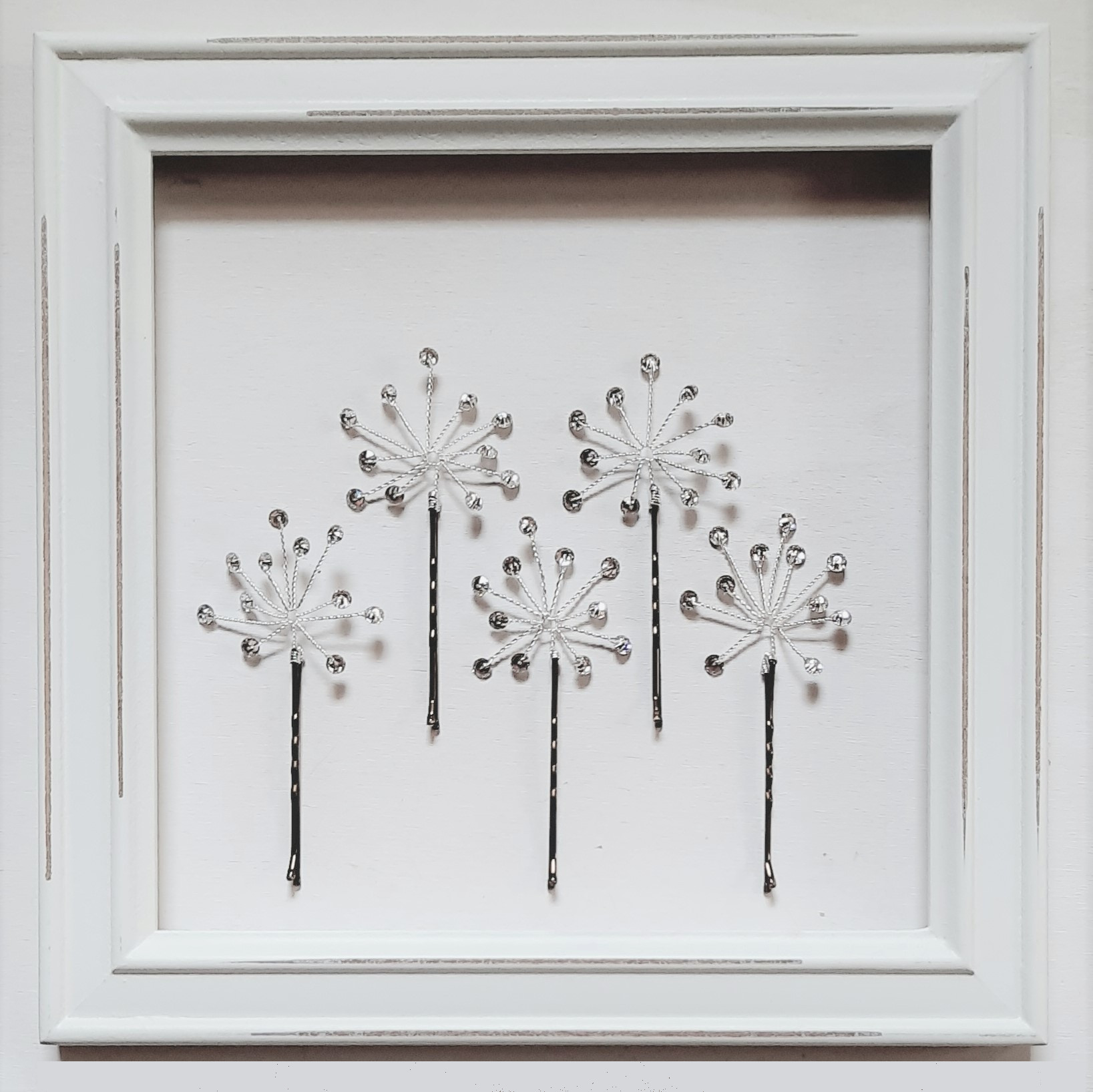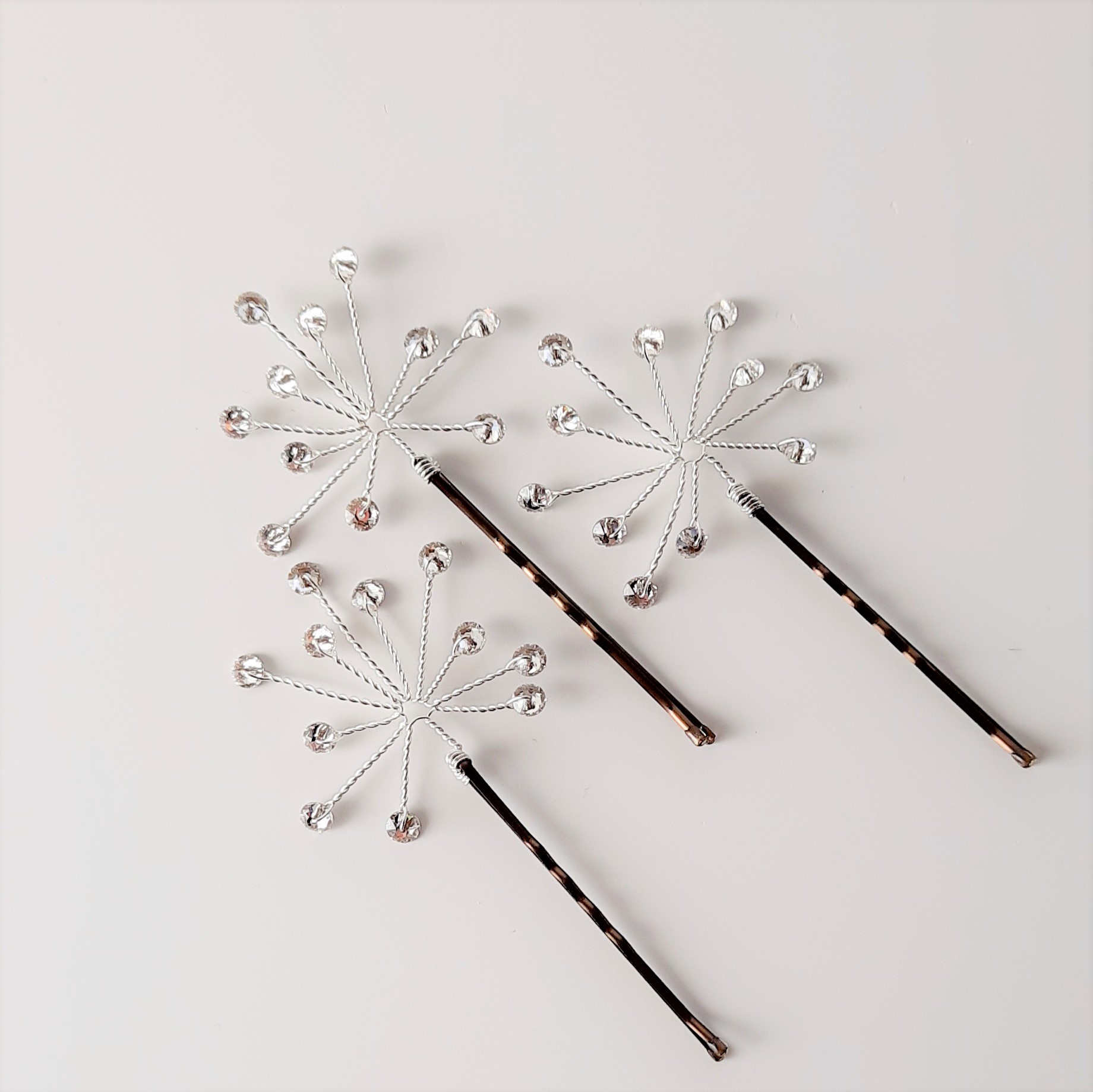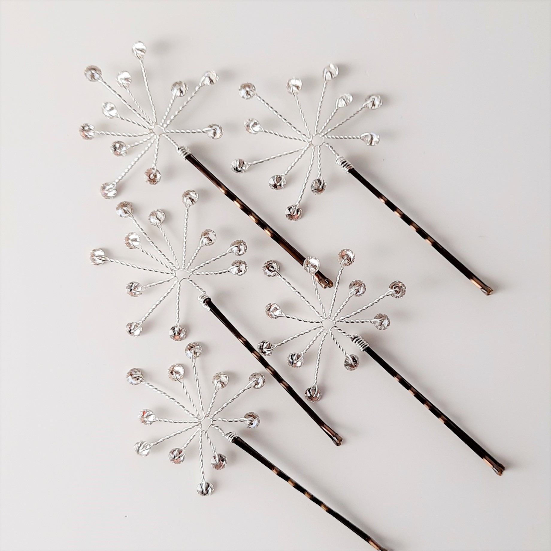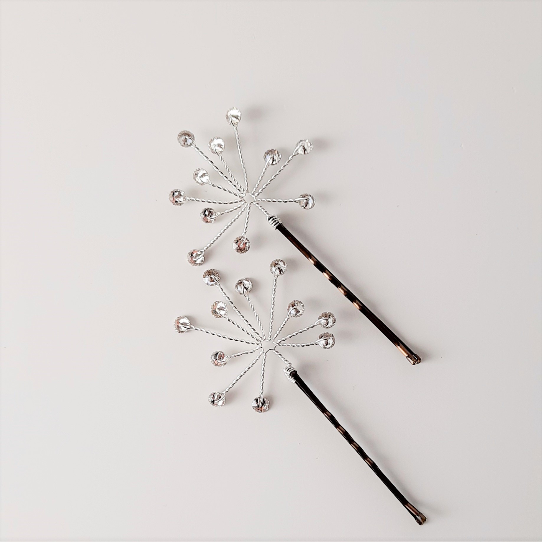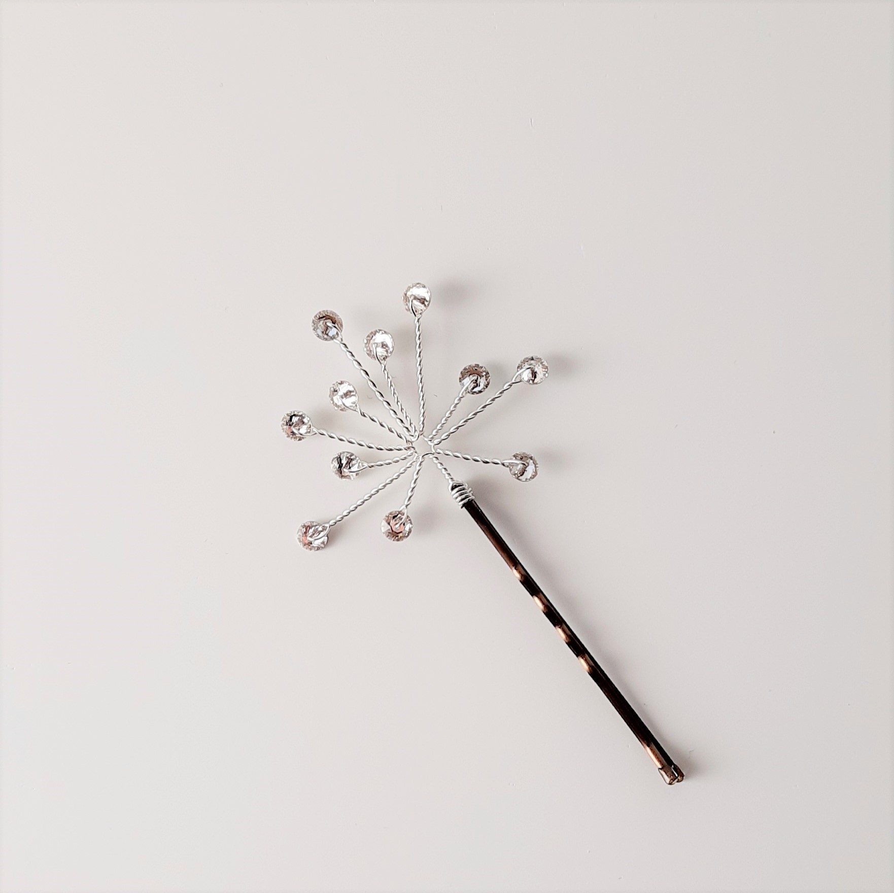Forcina nuziale in filo di metallo argentato decorata con cristalli tondi Swarovski a formare un piccolo soffione o stella luminosa. Il diametro della decorazione di una singola forcina è di circa 4 cm (forcina esclusa).