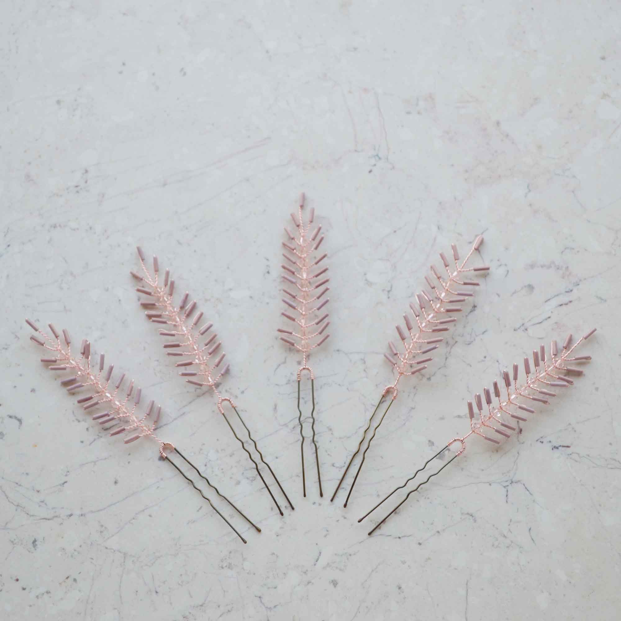 Forcina da sposa oro rosa a forma di felce. La foglia di felce è decorata con biconi Swarovski Silk (rosa cipria) da 4 mm e bugles giapponesi rosa antico. Altezza decoro 7 cm (forcina esclusa), larghezza 2 cm. Scegli la quantità desiderata di forcine.