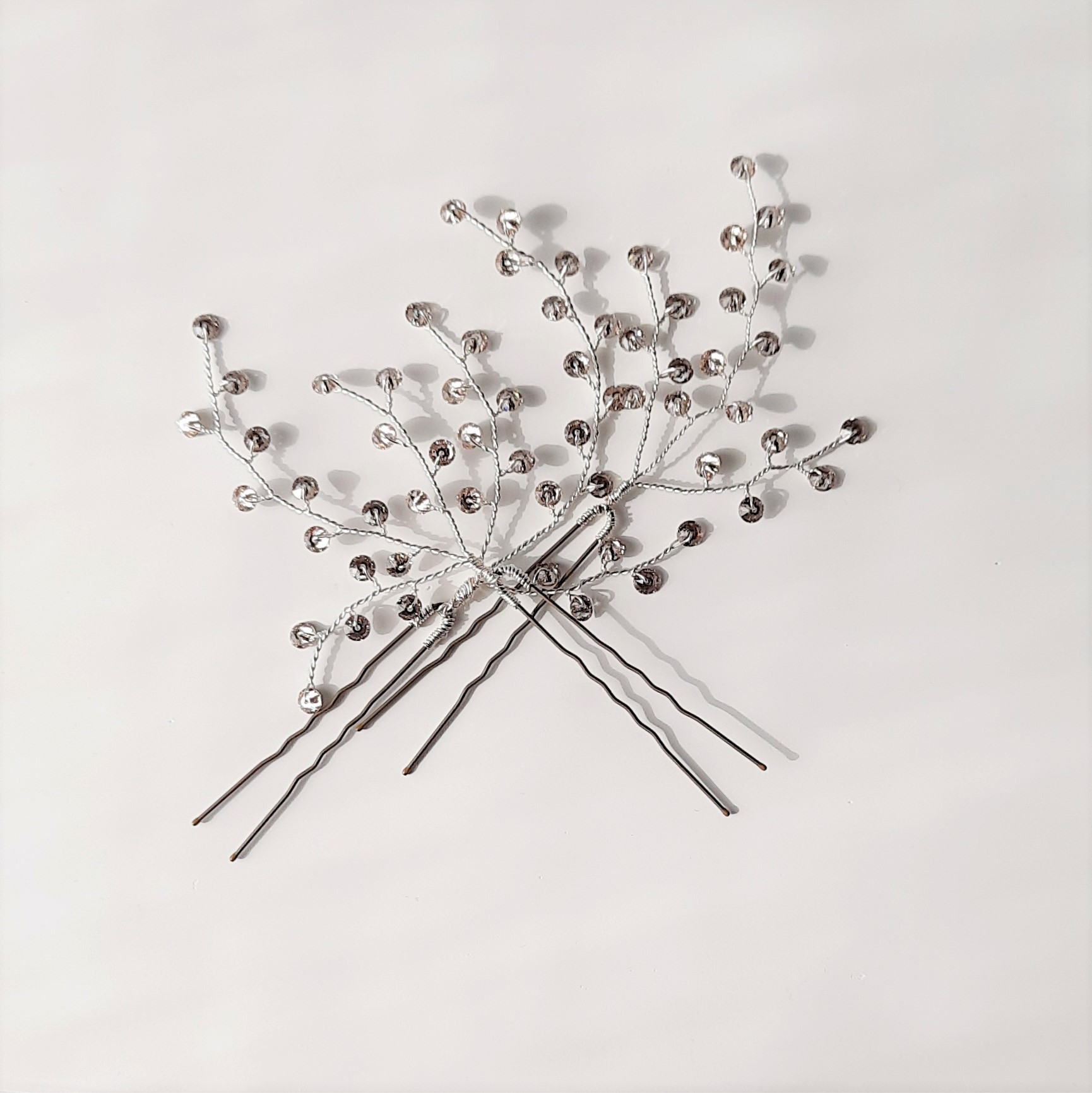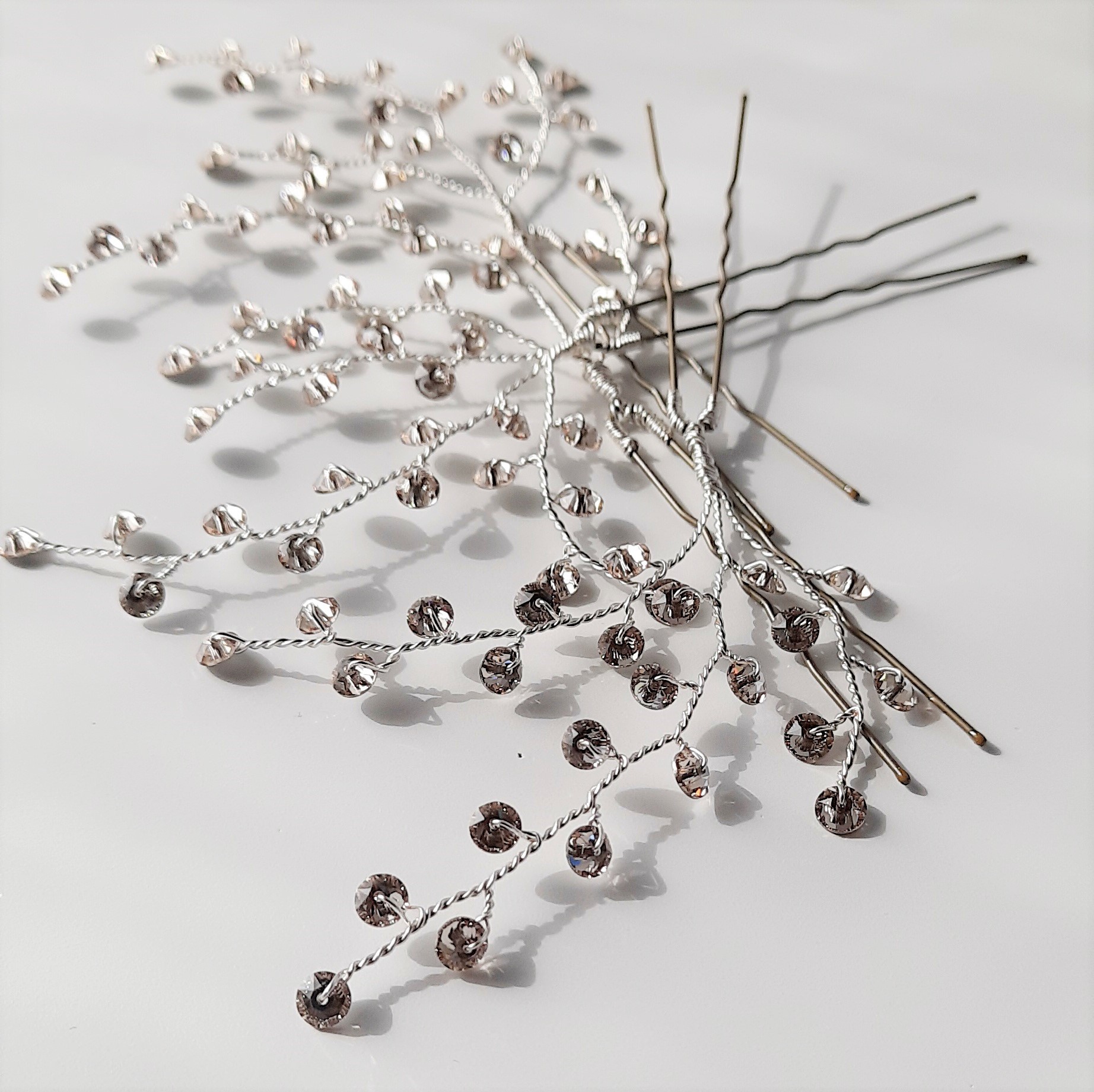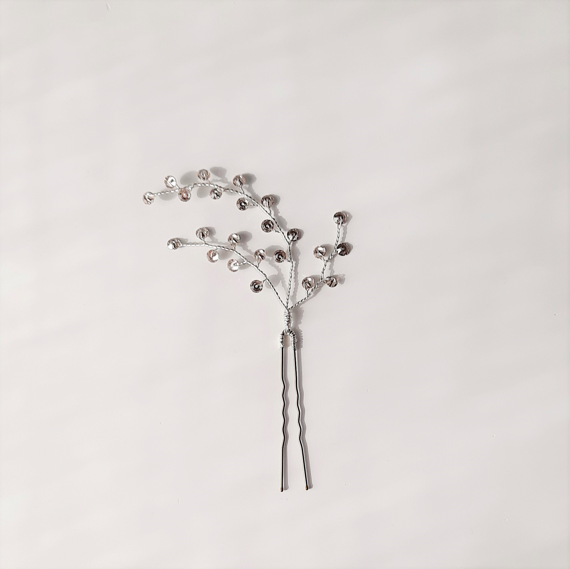 Forcina da sposa in filo di metallo argentato decorata con rametti di cristalli Swarovski Light Silk (color champagne molto chiaro). La misura della decorazione di una singola forcina è di circa 8×7 cm (forcina esclusa). Essendo realizzata con filo in metallo malleabile, è possibile modellare a piacere i singoli rametti per creare il proprio disegno originale in base all’acconciatura scelta.