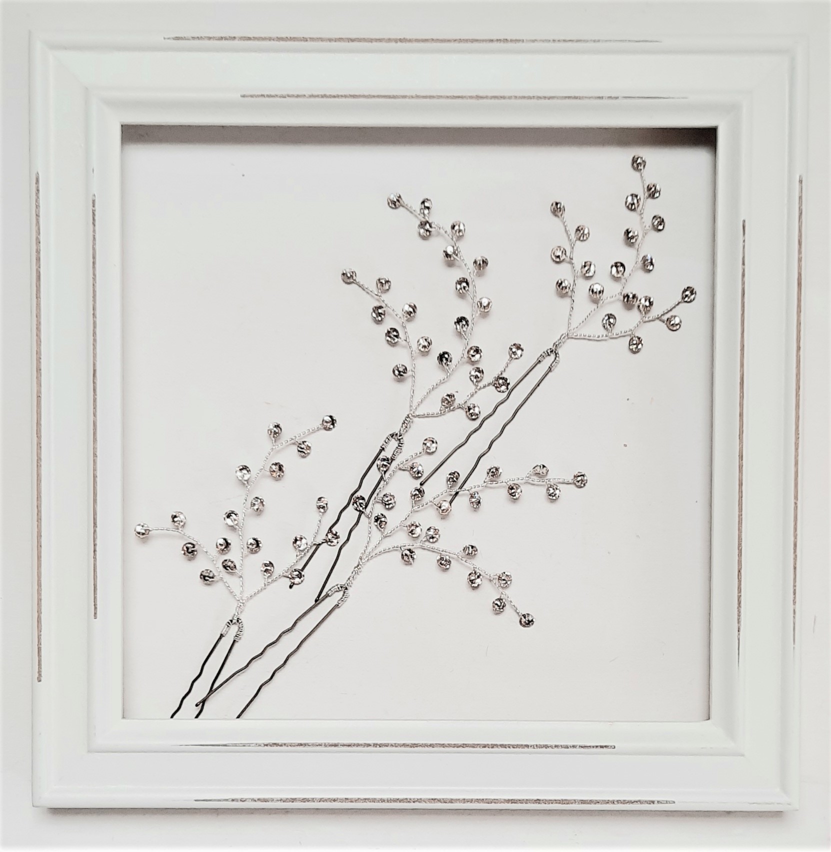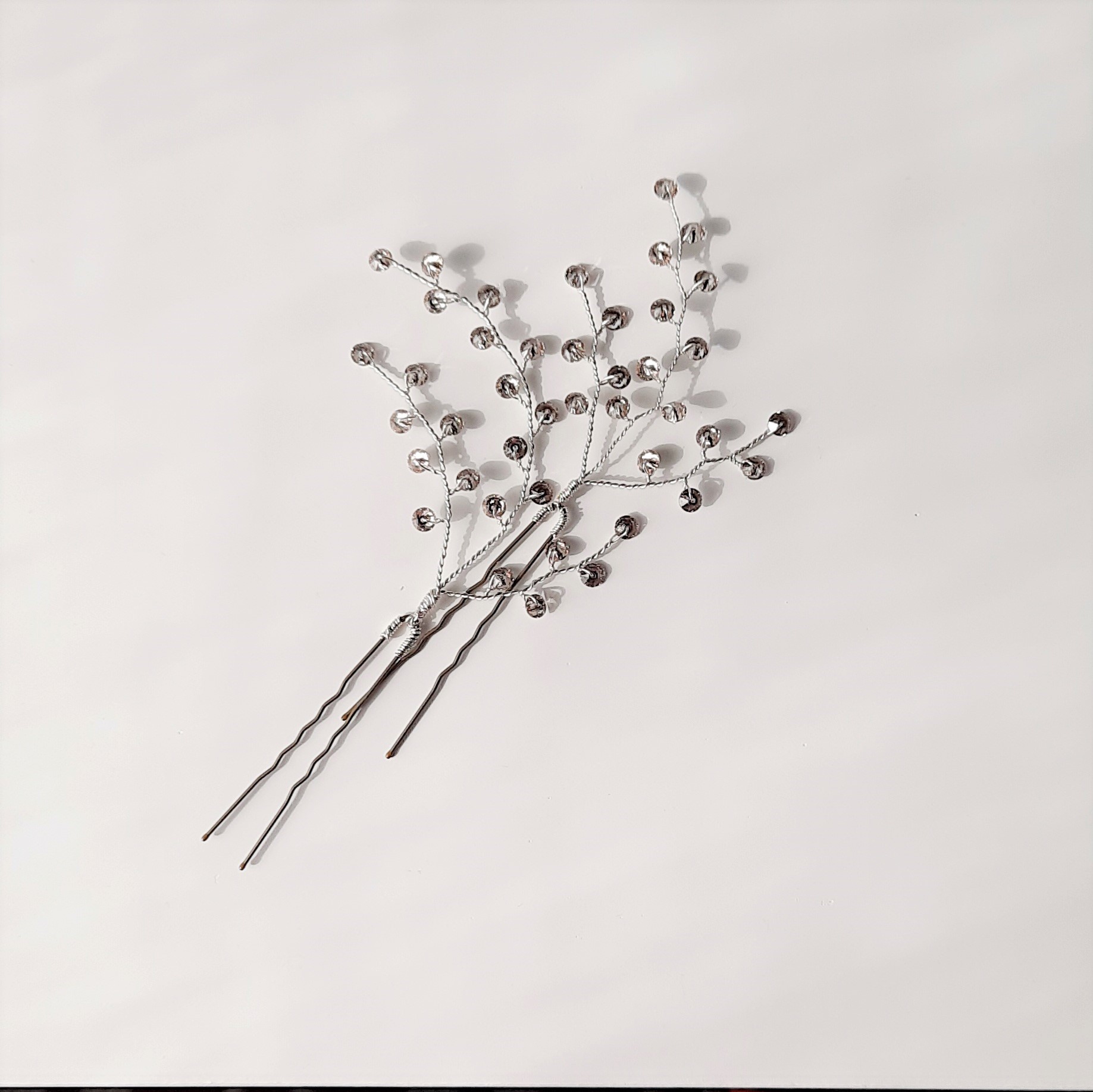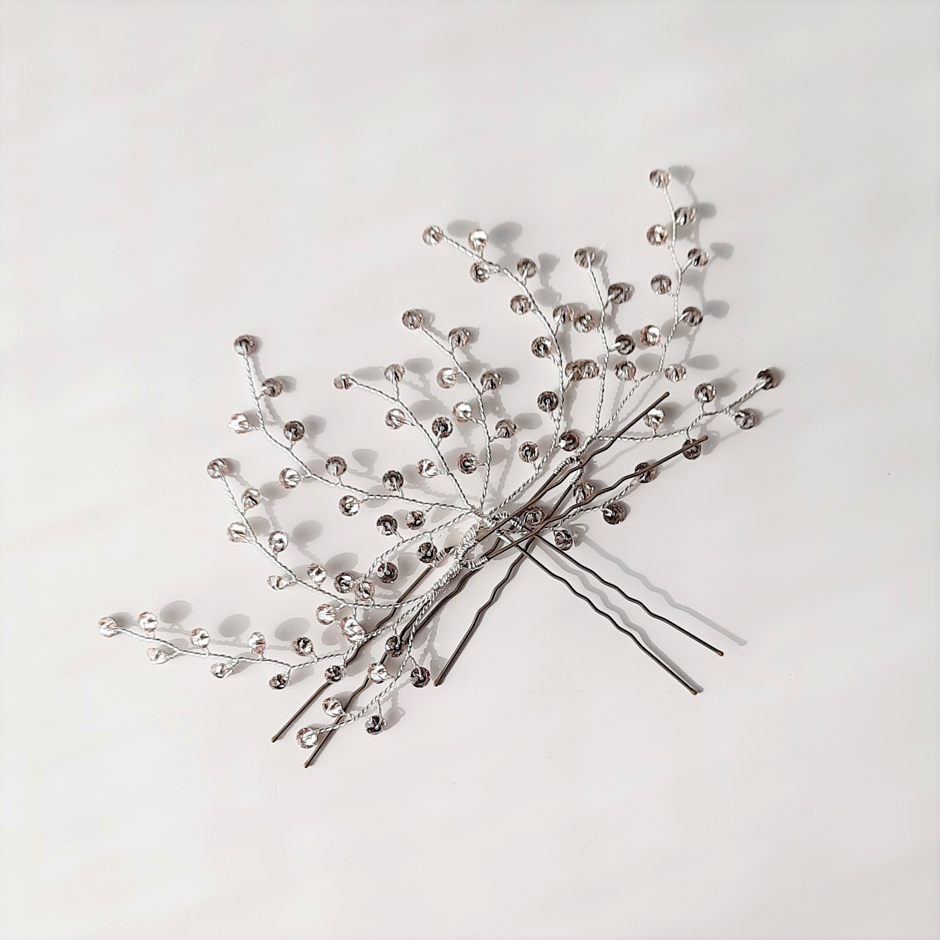 Forcina da sposa in filo di metallo argentato decorata con rametti di cristalli Swarovski Light Silk (color champagne molto chiaro). La misura della decorazione di una singola forcina è di circa 8×7 cm (forcina esclusa). Essendo realizzata con filo in metallo malleabile, è possibile modellare a piacere i singoli rametti per creare il proprio disegno originale in base all’acconciatura scelta.