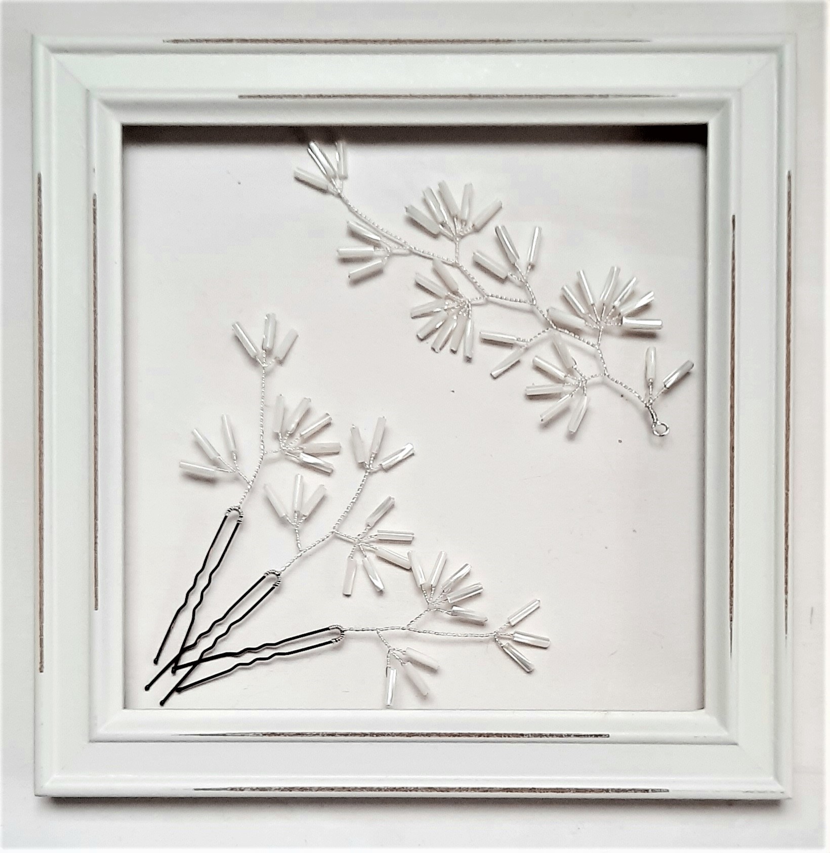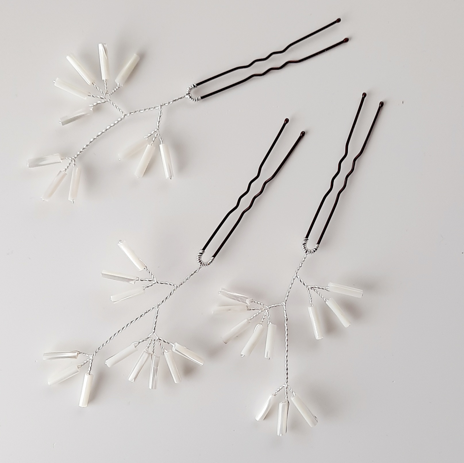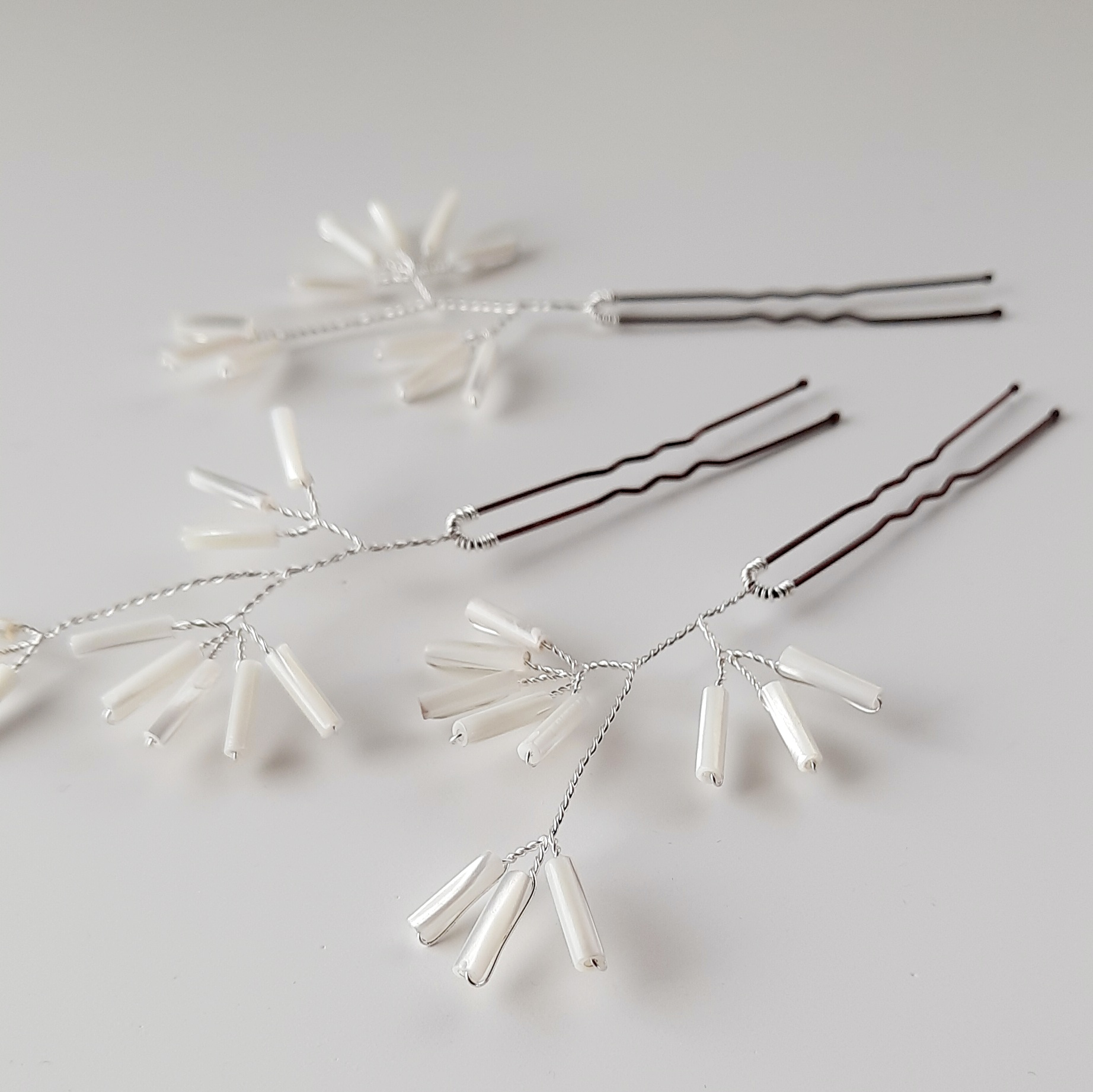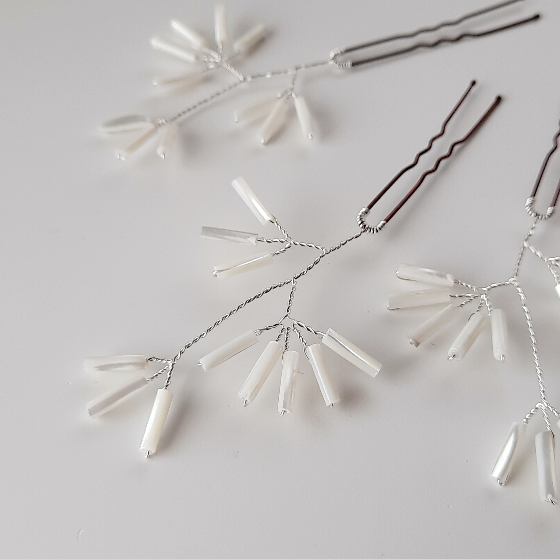 Forcina da sposa in filo di metallo argentato decorata con tubicini in madreperla bianca naturale a formare piccole foglie a ventaglio. La dimensione della decorazione di una singola forcina è di circa 6,5×5 cm (forcina esclusa).