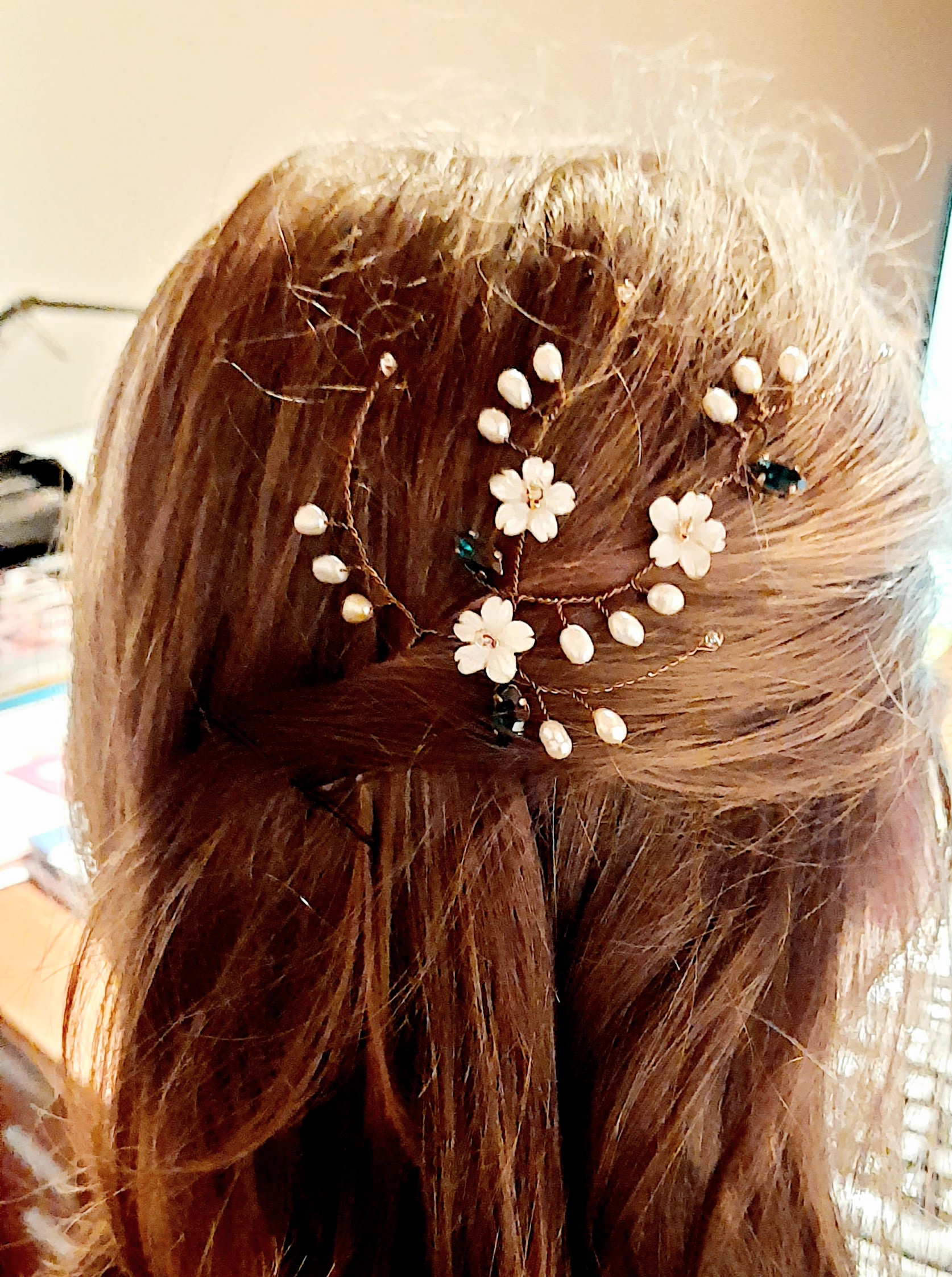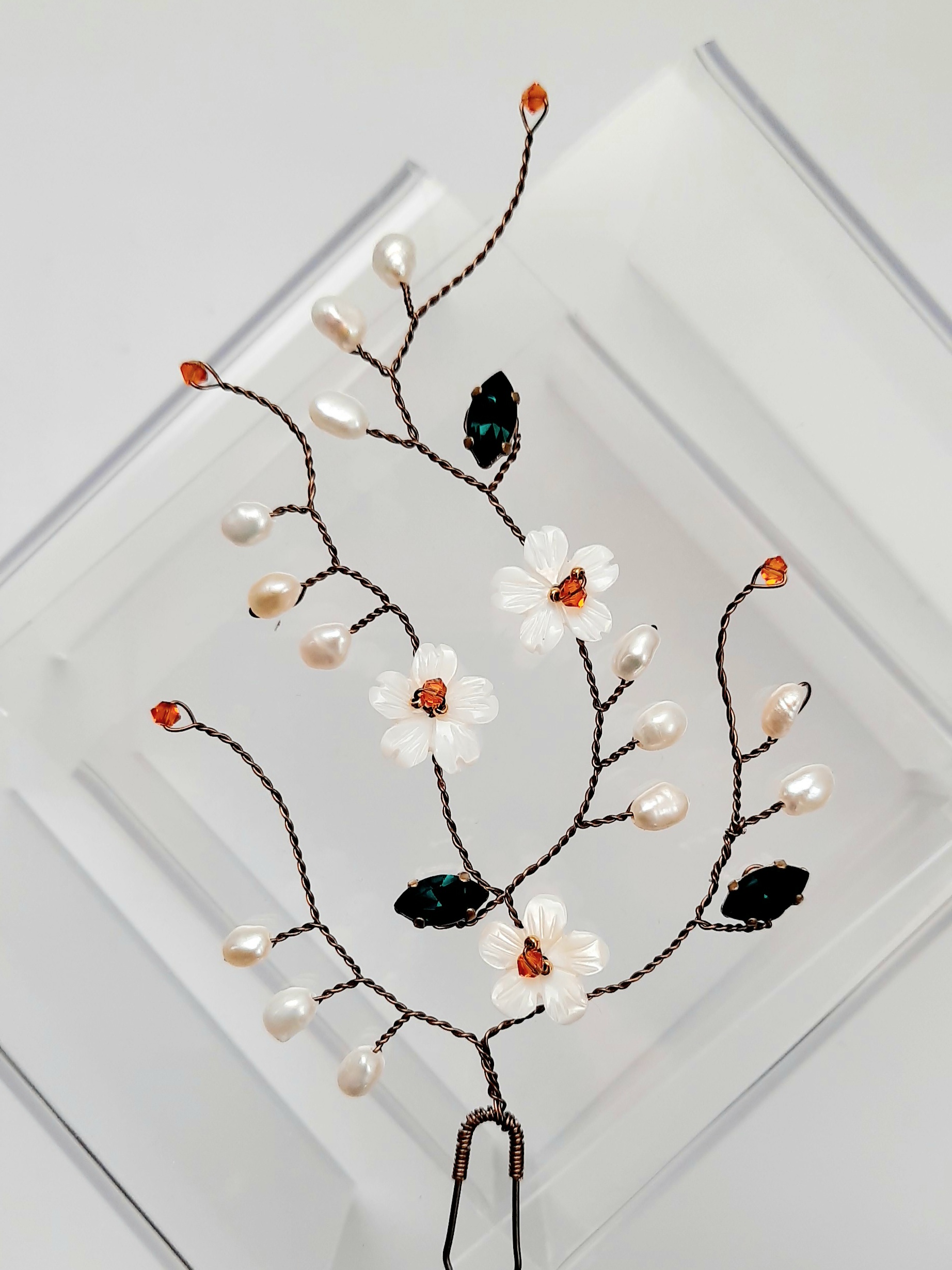 Forcina in bronzo decorata con fiori in madreperla da 13 mm, perle d’acqua dolce, biconi Swarovski da 3 mm e navette Swarovski 10×5 mm. Altezza decoro 10 cm (forcina esclusa), larghezza max 8,5 cm (in gradazione).