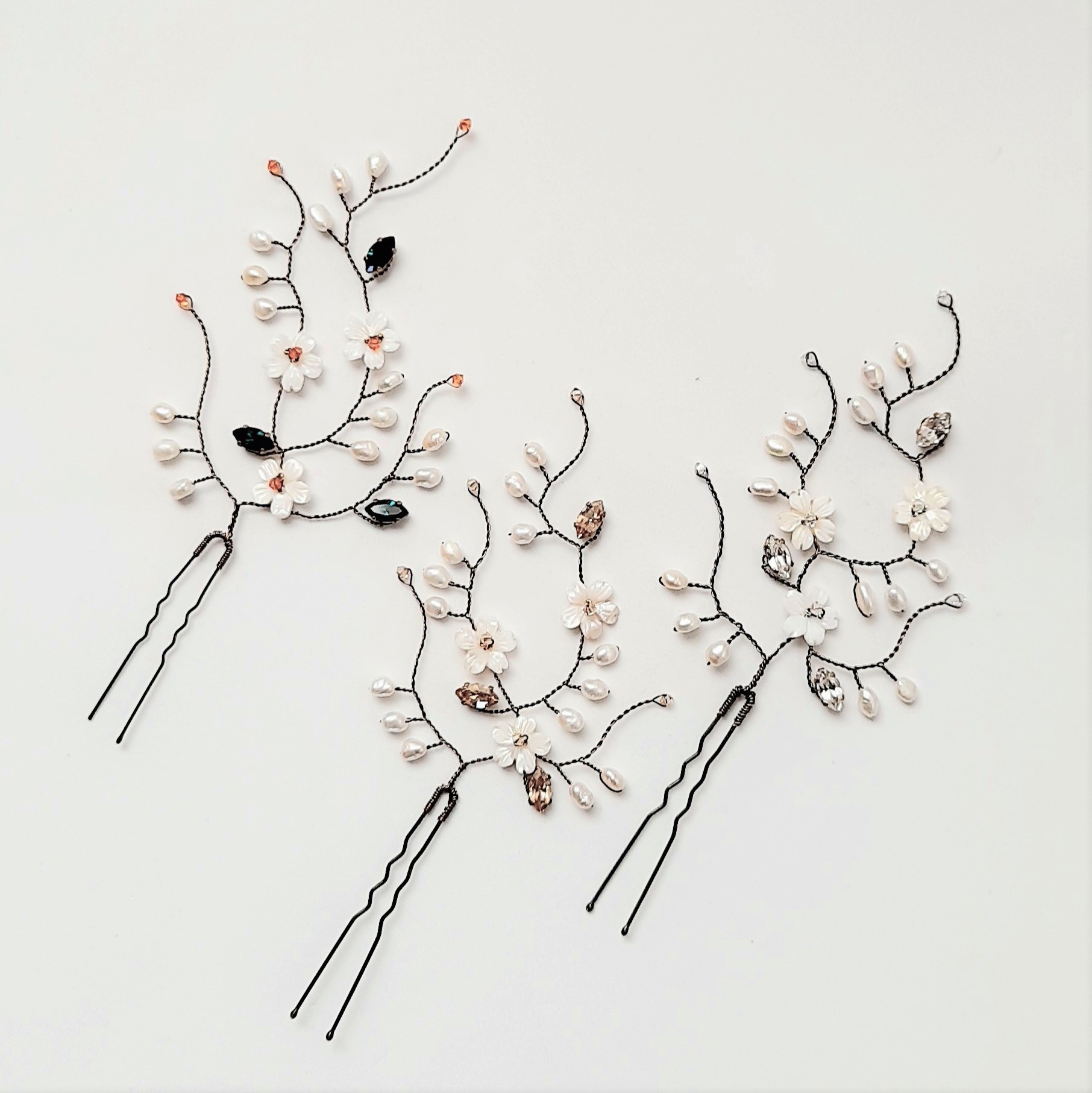 Scegli il colore più adatto a te e al tuo stile! Queste forcine-gioiello staranno perfettamente su un abito bianco decorato con ramage o motivi floreali in stile boho-chic. Un’unica forcina decora l’acconciatura in modo semplice ma sofisticato. Con due o più forcine potrai disegnare liberamente sulla tua acconciatura una decorazione speciale, pensata solo per te.