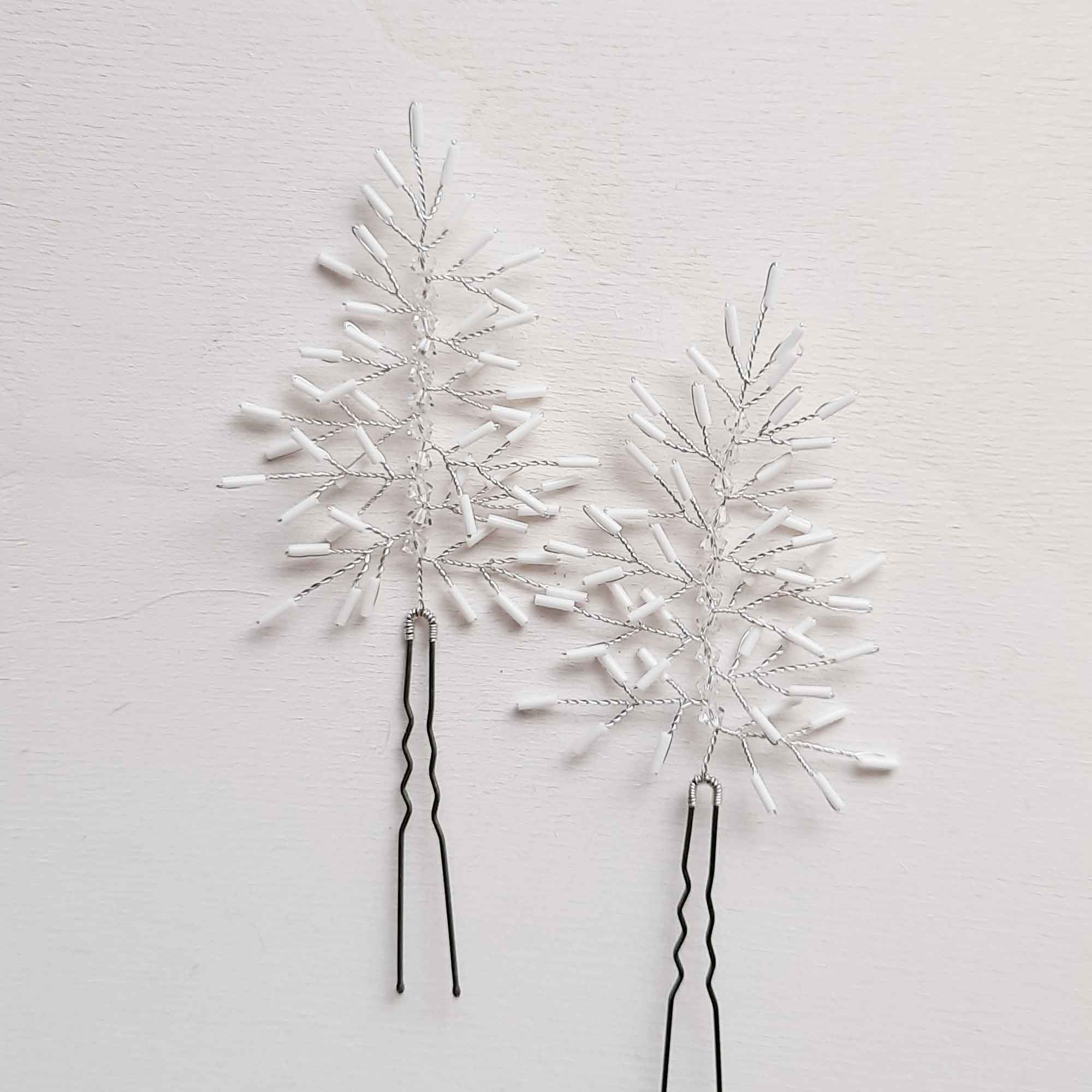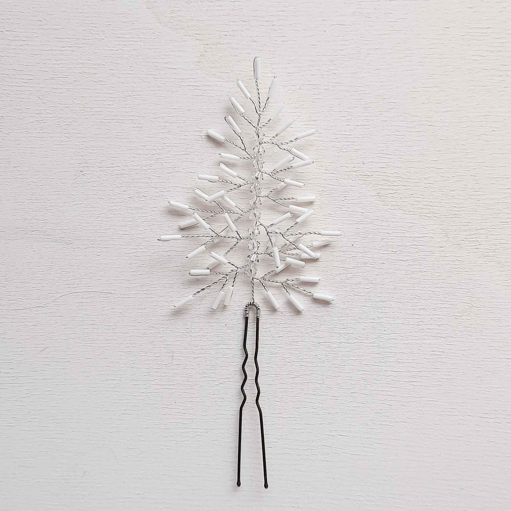 Forcina nuziale argentata a forma di foglia di felce bianca, decorata con biconi Swarovski Crystal da 4 mm e bugles giapponesi bianche. Altezza decoro 7 cm (forcina esclusa), larghezza max 5,5 cm (in gradazione).